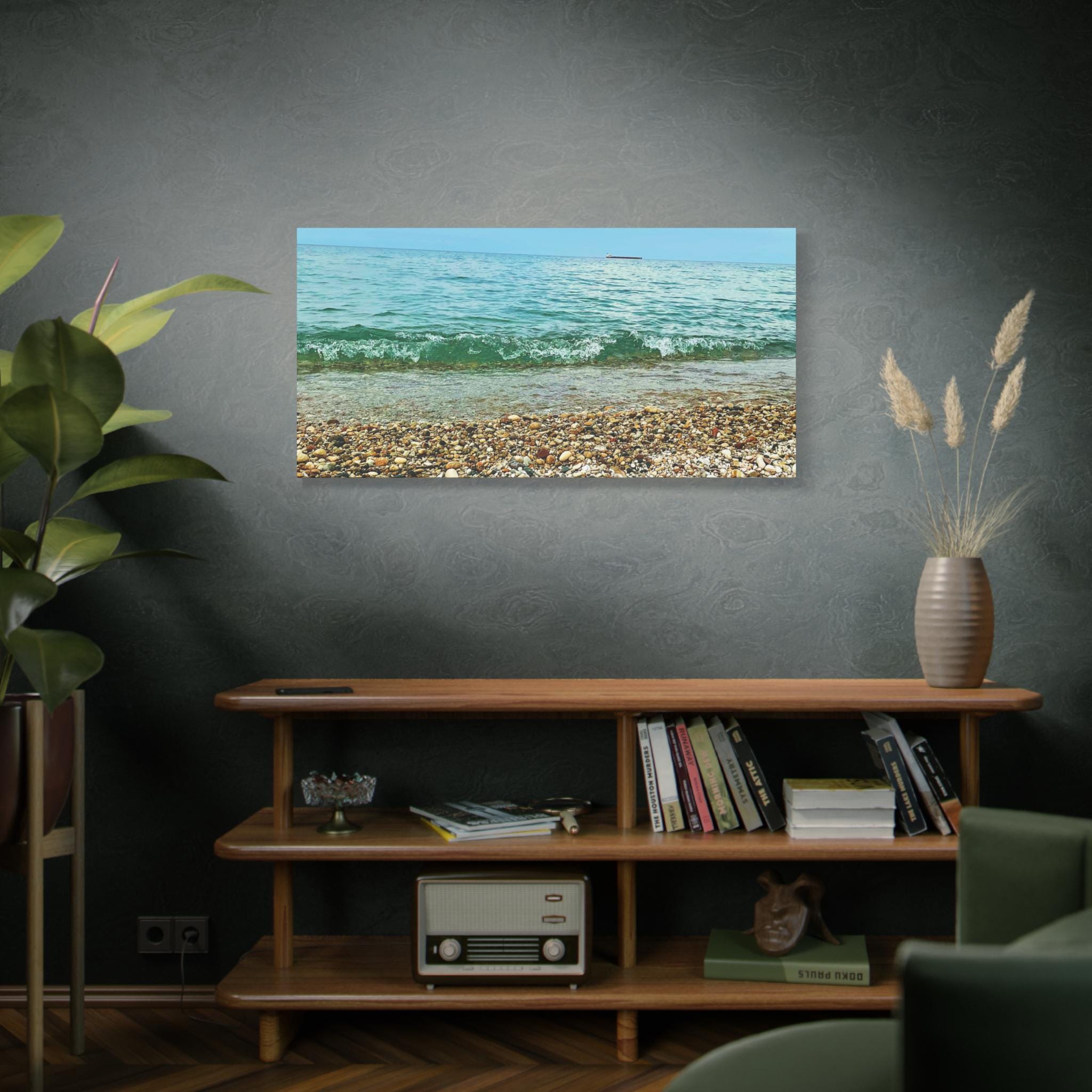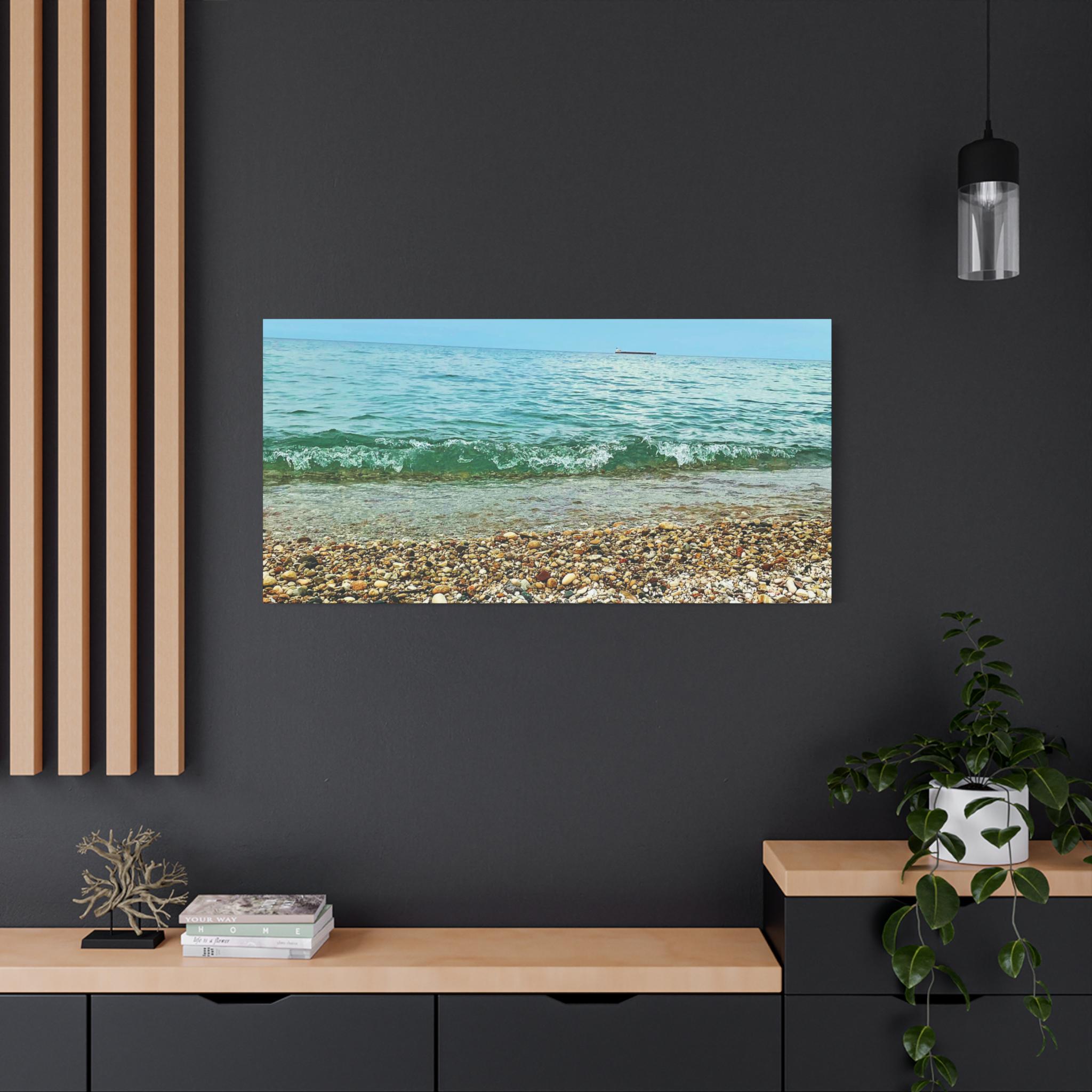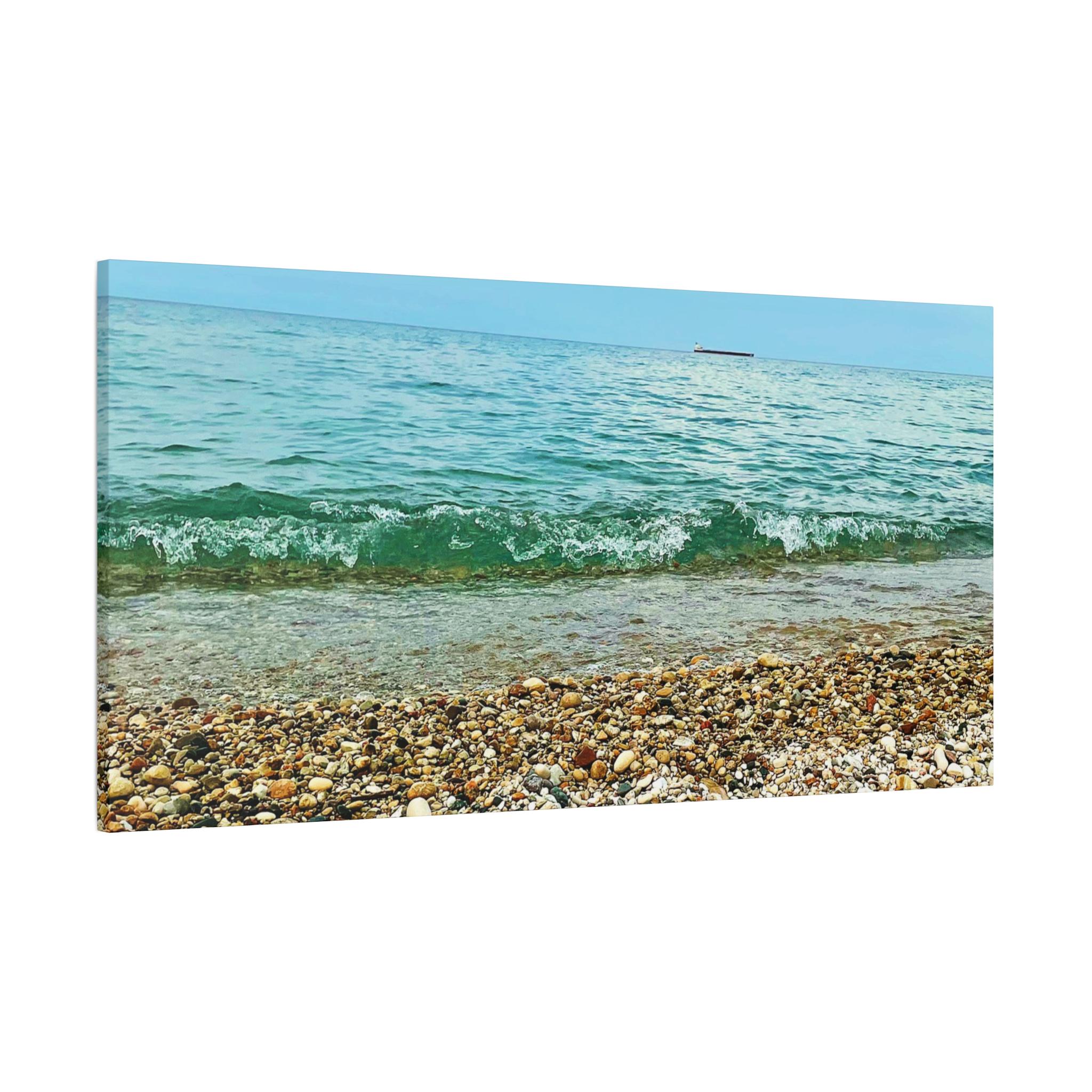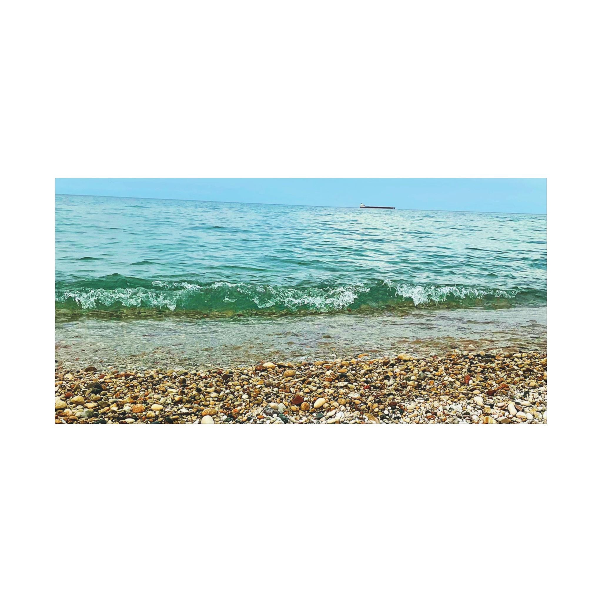 Bring the calming vibes of a pebble beach with a passing boat into your space with this stretched matte canvas. Perfect for anyone looking to add a touch of tranquility to their home or office decor. Ideal for coastal-themed decor, beach lovers, and those who enjoy serene landscapes. Great for gifting on occasions like birthdays, housewarmings, or as a thoughtful present for lovers of the sea.