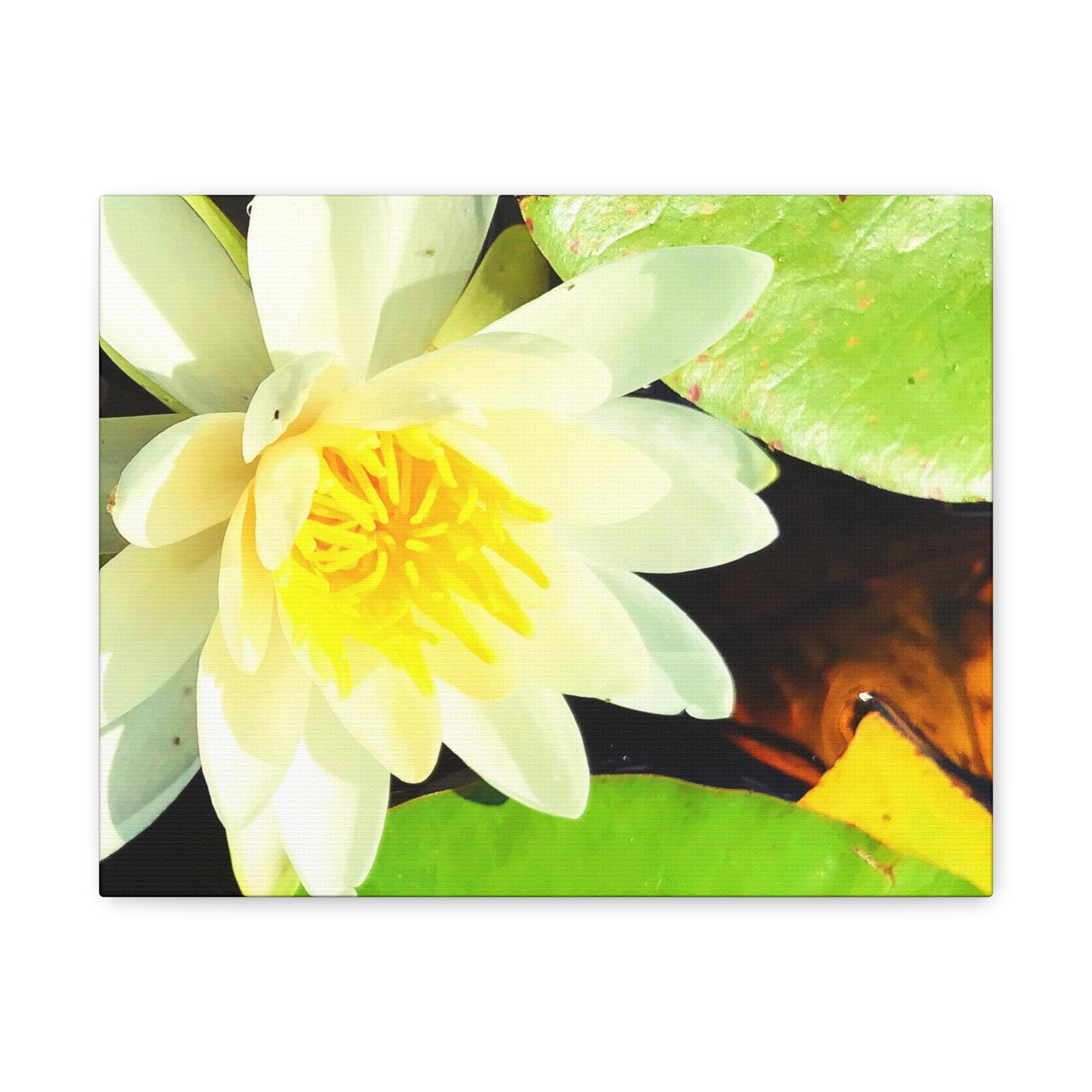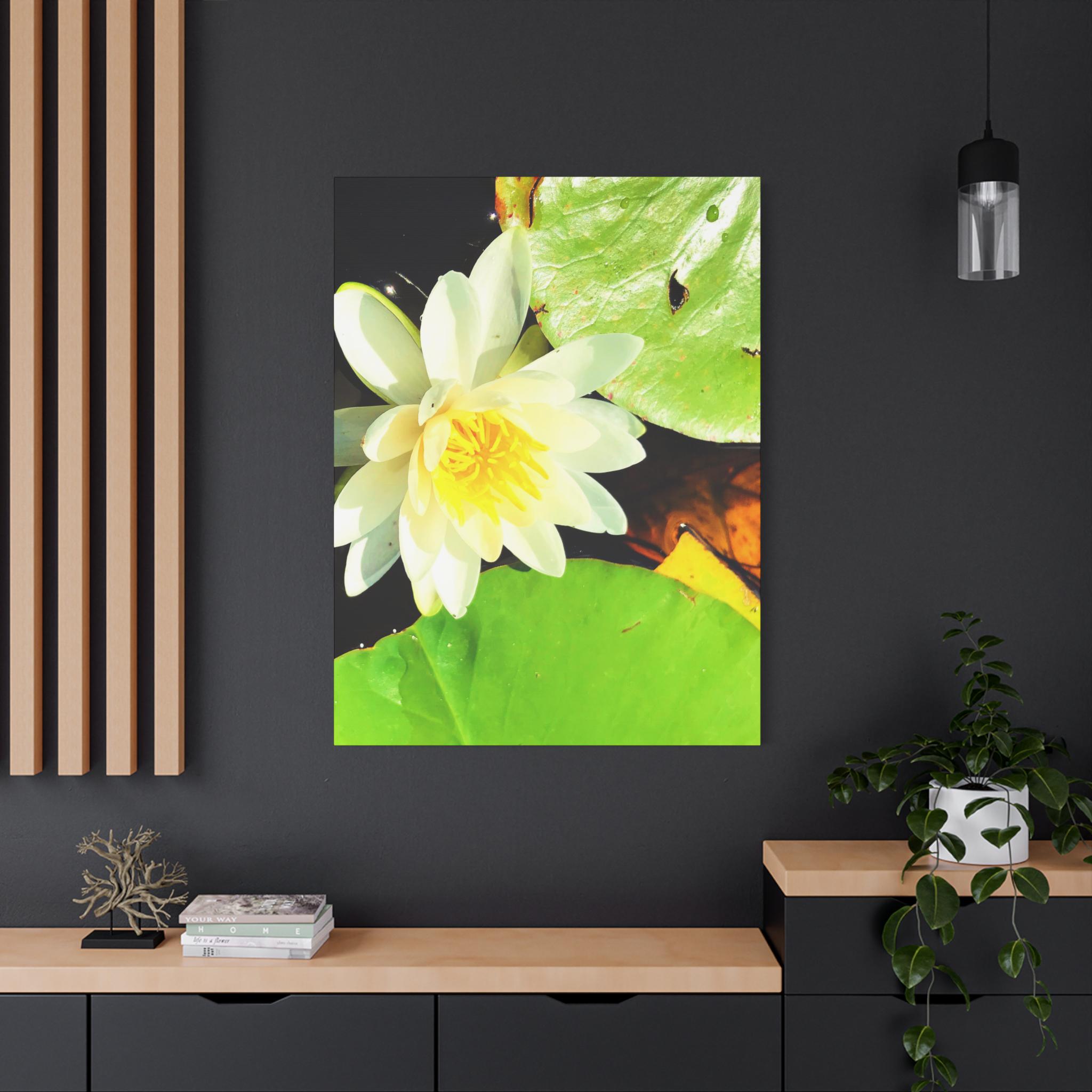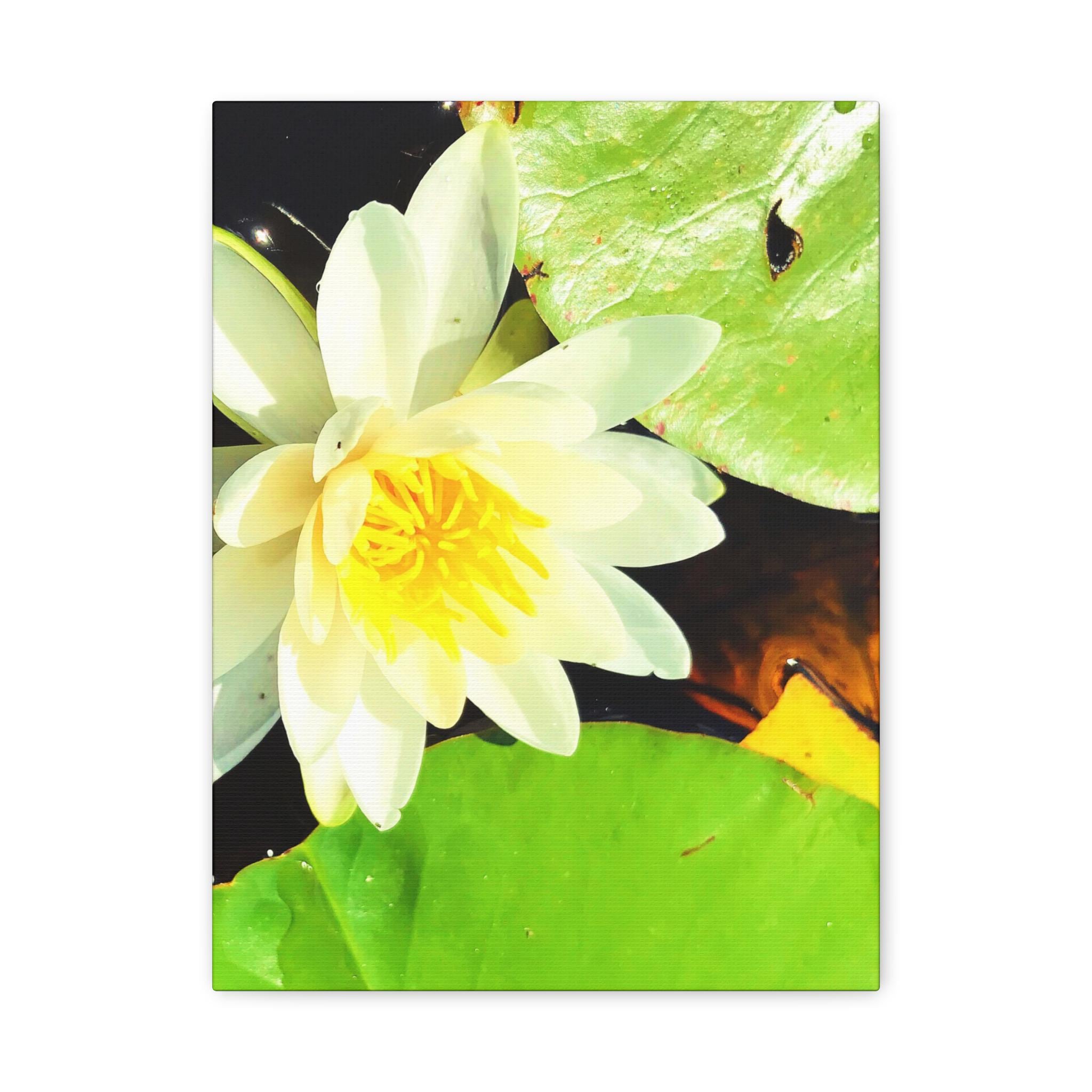 This serene photograph features a stunning white water lily in full bloom, resting gently among lily pads. The vibrant yellow center brings a warm glow against the dark water, creating a calming and elegant composition. Perfect for wall art, canvas prints, or gifts for flower and garden lovers, this piece adds a touch of peaceful beauty to any space.