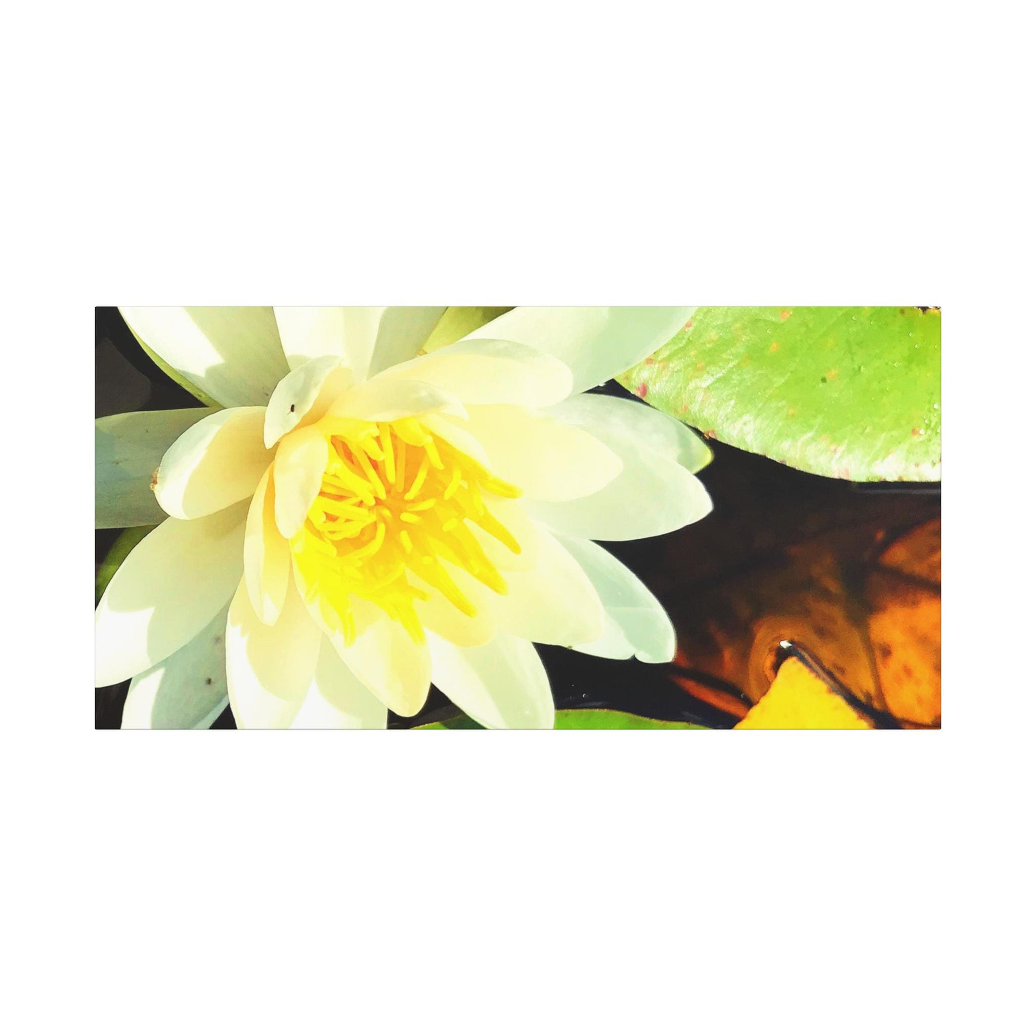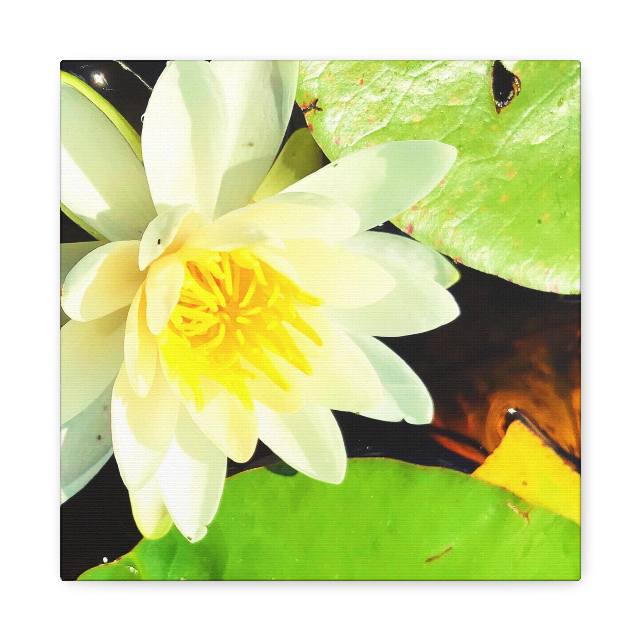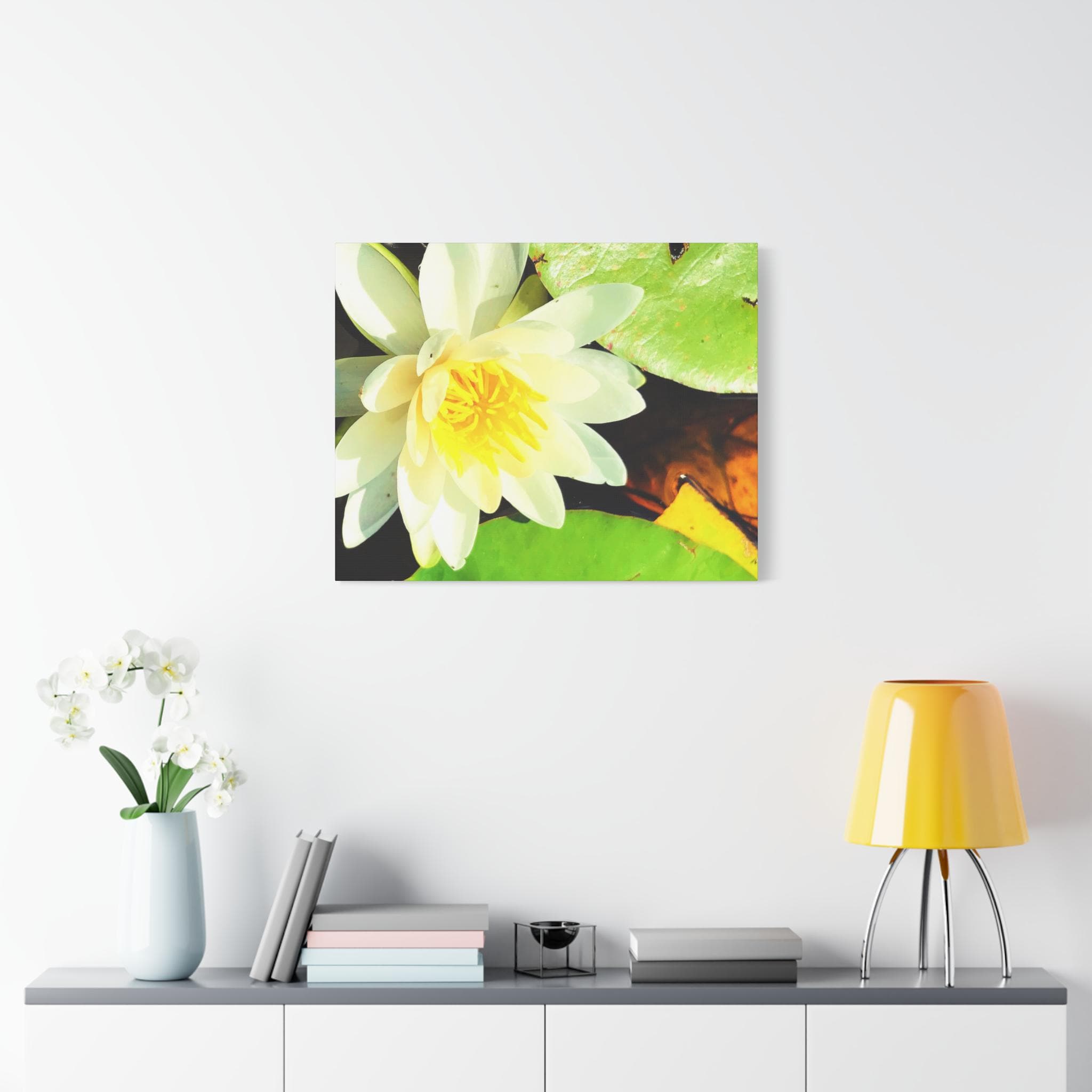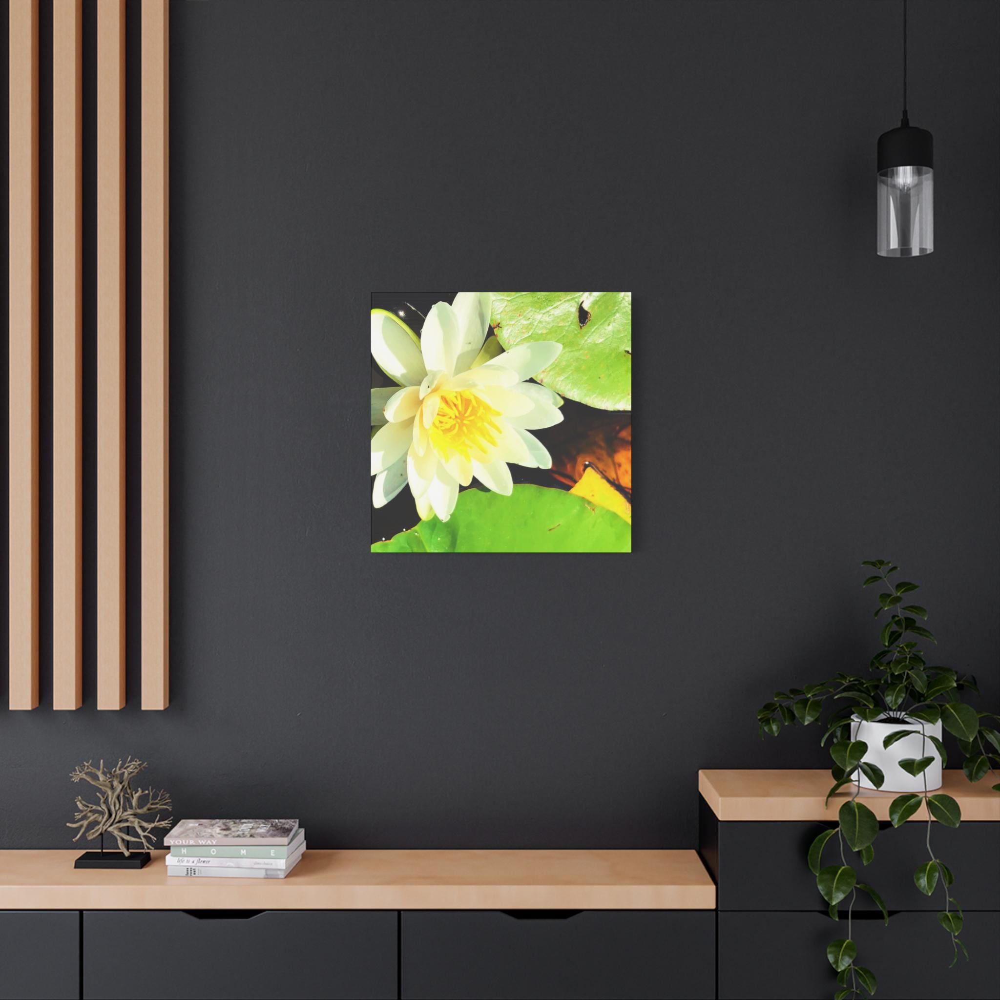 This serene photograph features a stunning white water lily in full bloom, resting gently among lily pads. The vibrant yellow center brings a warm glow against the dark water, creating a calming and elegant composition. Perfect for wall art, canvas prints, or gifts for flower and garden lovers, this piece adds a touch of peaceful beauty to any space.