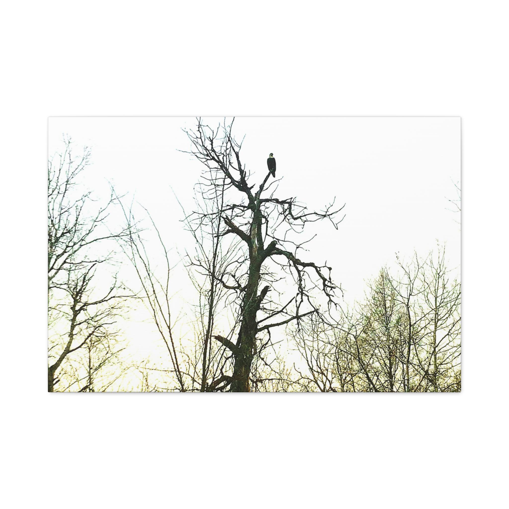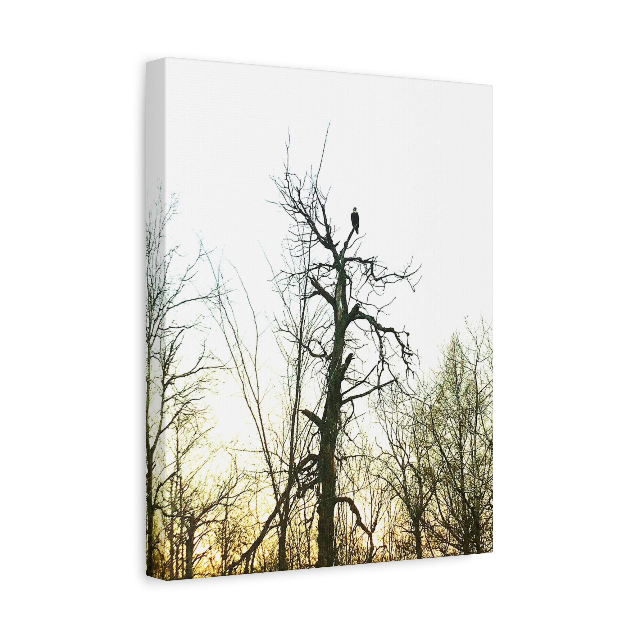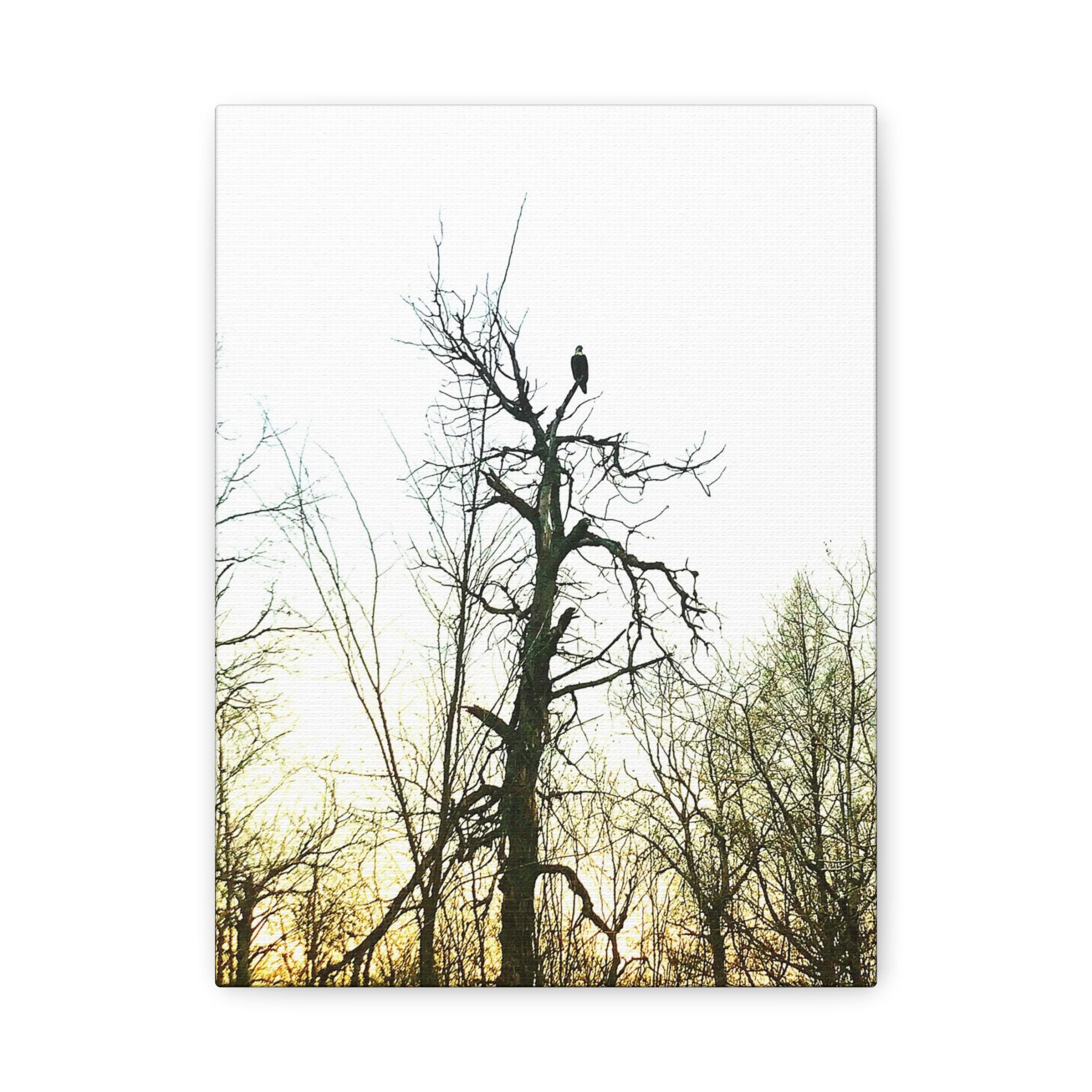 This stunning photograph captures a bald eagle perched proudly at the top of a tall tree as the sun sets behind a forest of bare branches. The dramatic sky and the eagle’s silhouette create a powerful, symbolic image of strength and freedom. Perfect for wildlife enthusiasts, patriotic décor, or rustic cabin wall art.