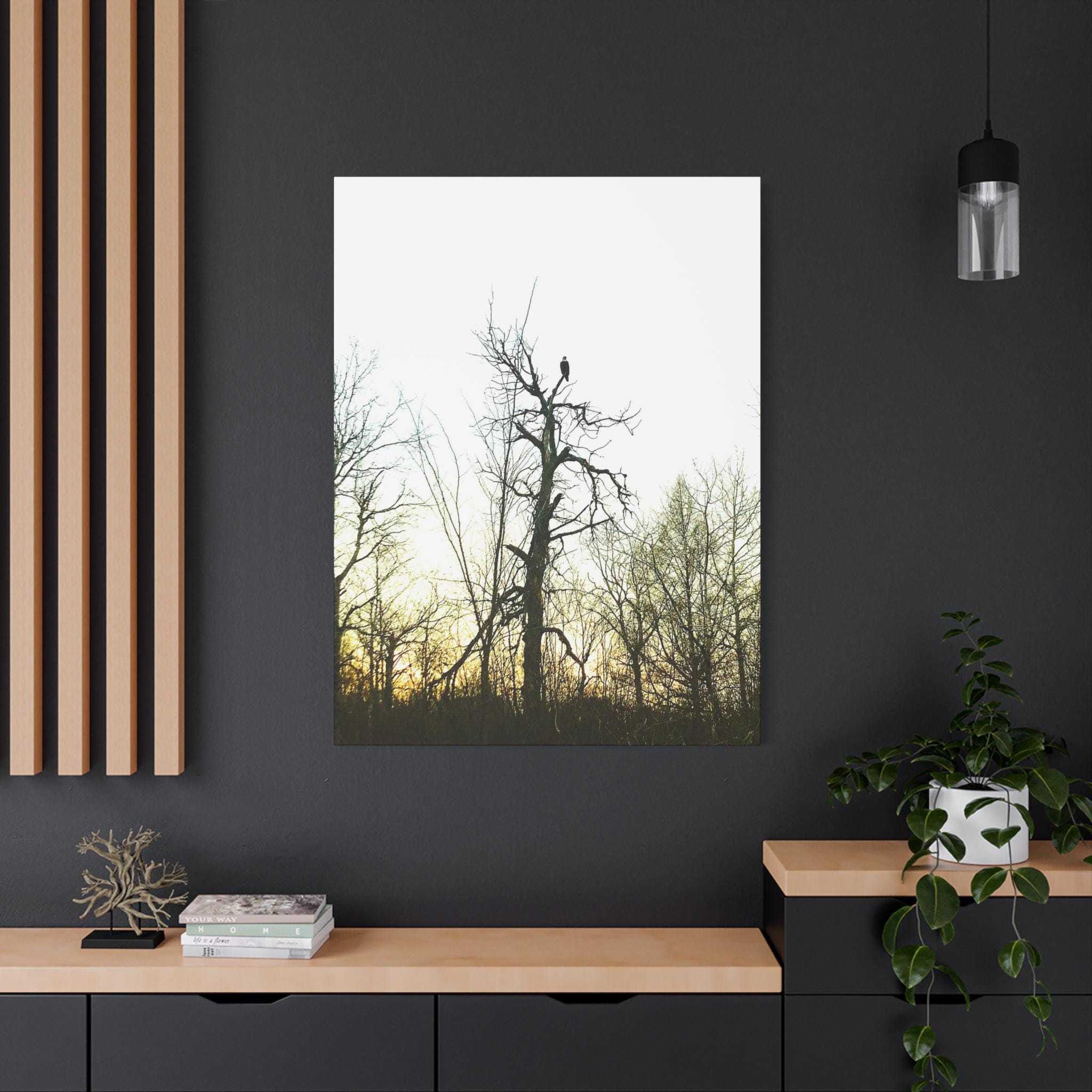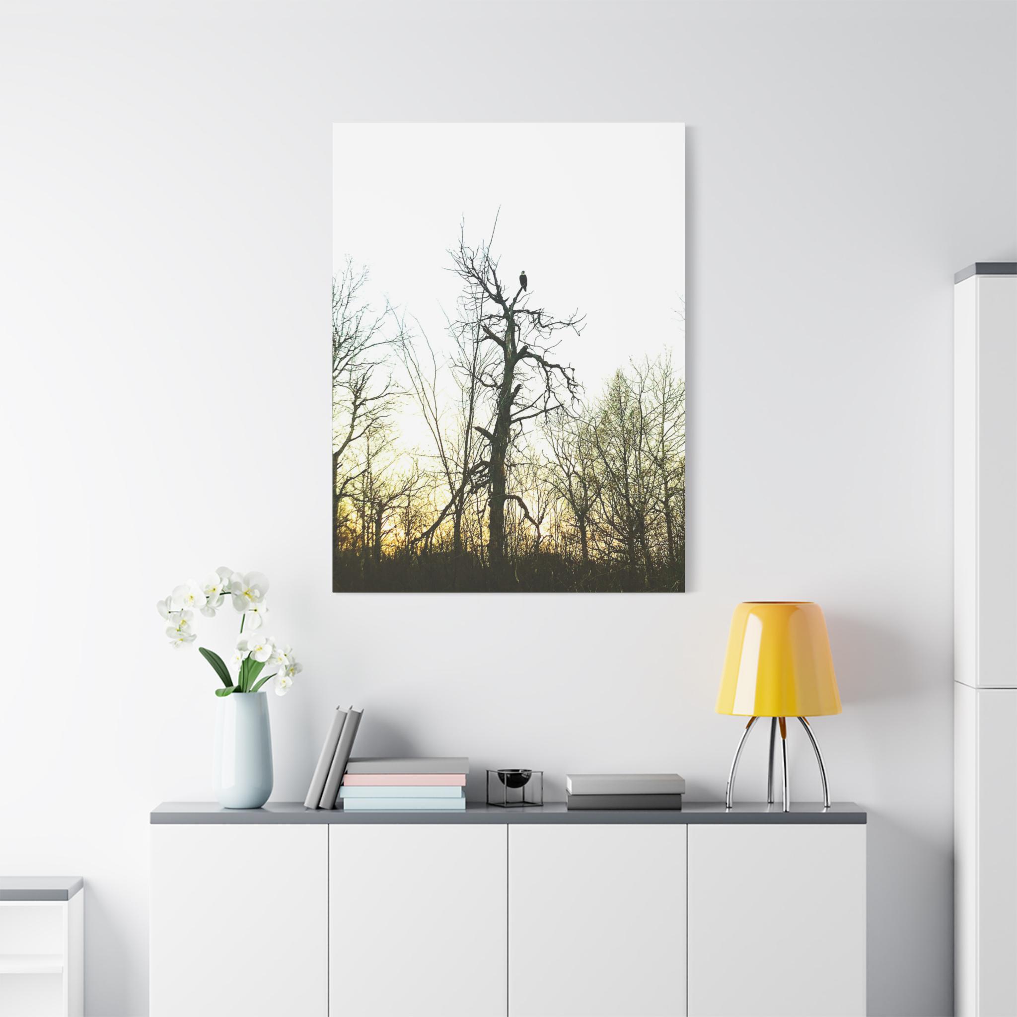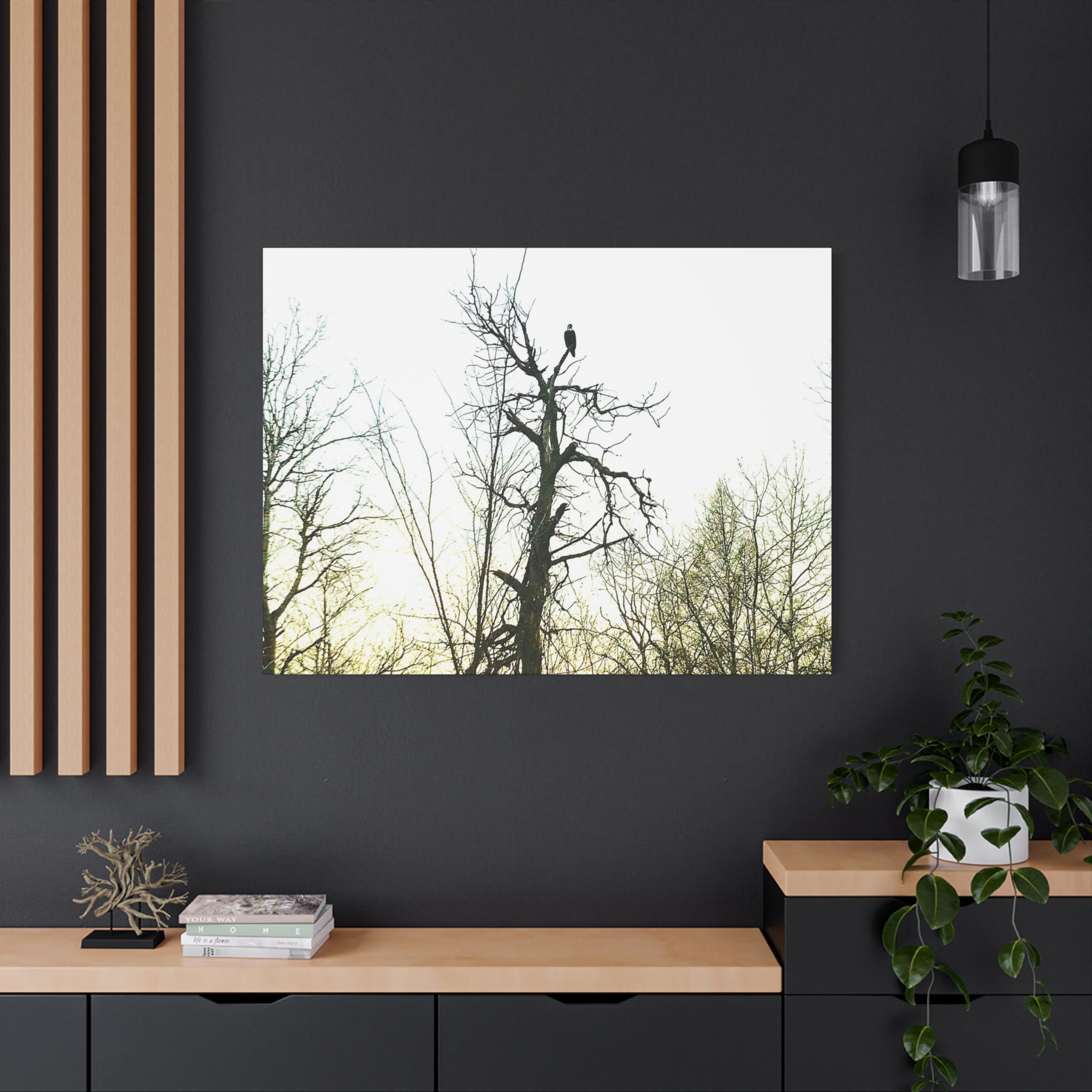 This stunning photograph captures a bald eagle perched proudly at the top of a tall tree as the sun sets behind a forest of bare branches. The dramatic sky and the eagle’s silhouette create a powerful, symbolic image of strength and freedom. Perfect for wildlife enthusiasts, patriotic décor, or rustic cabin wall art.
