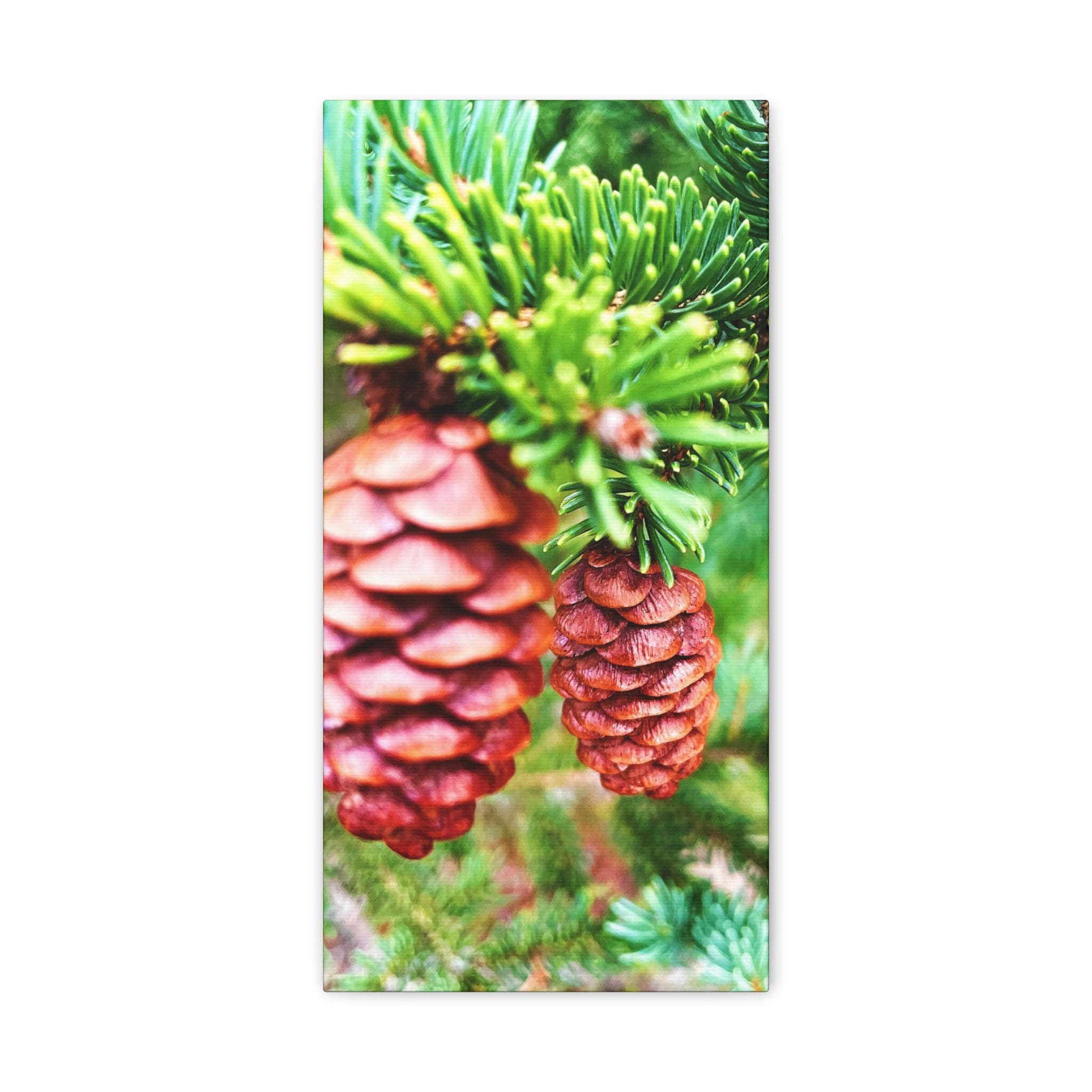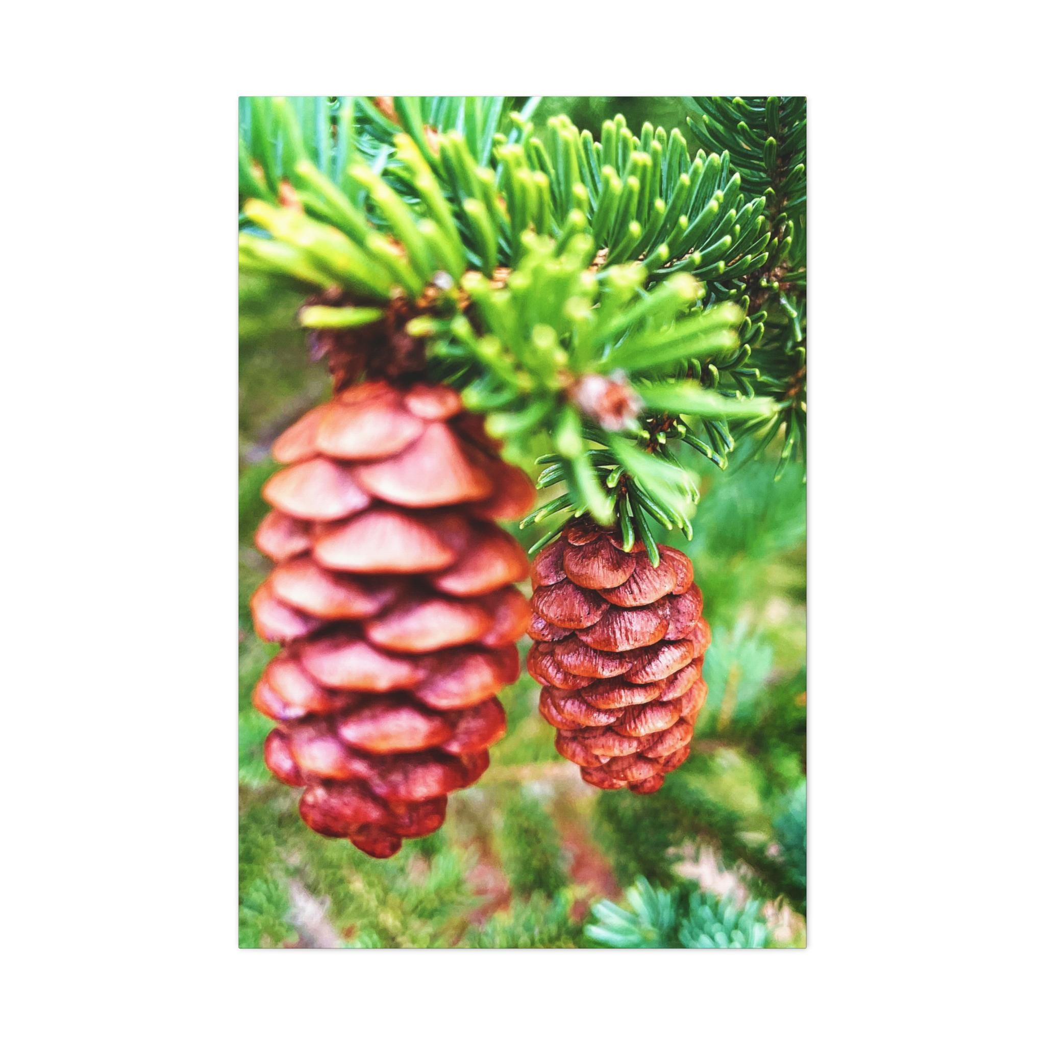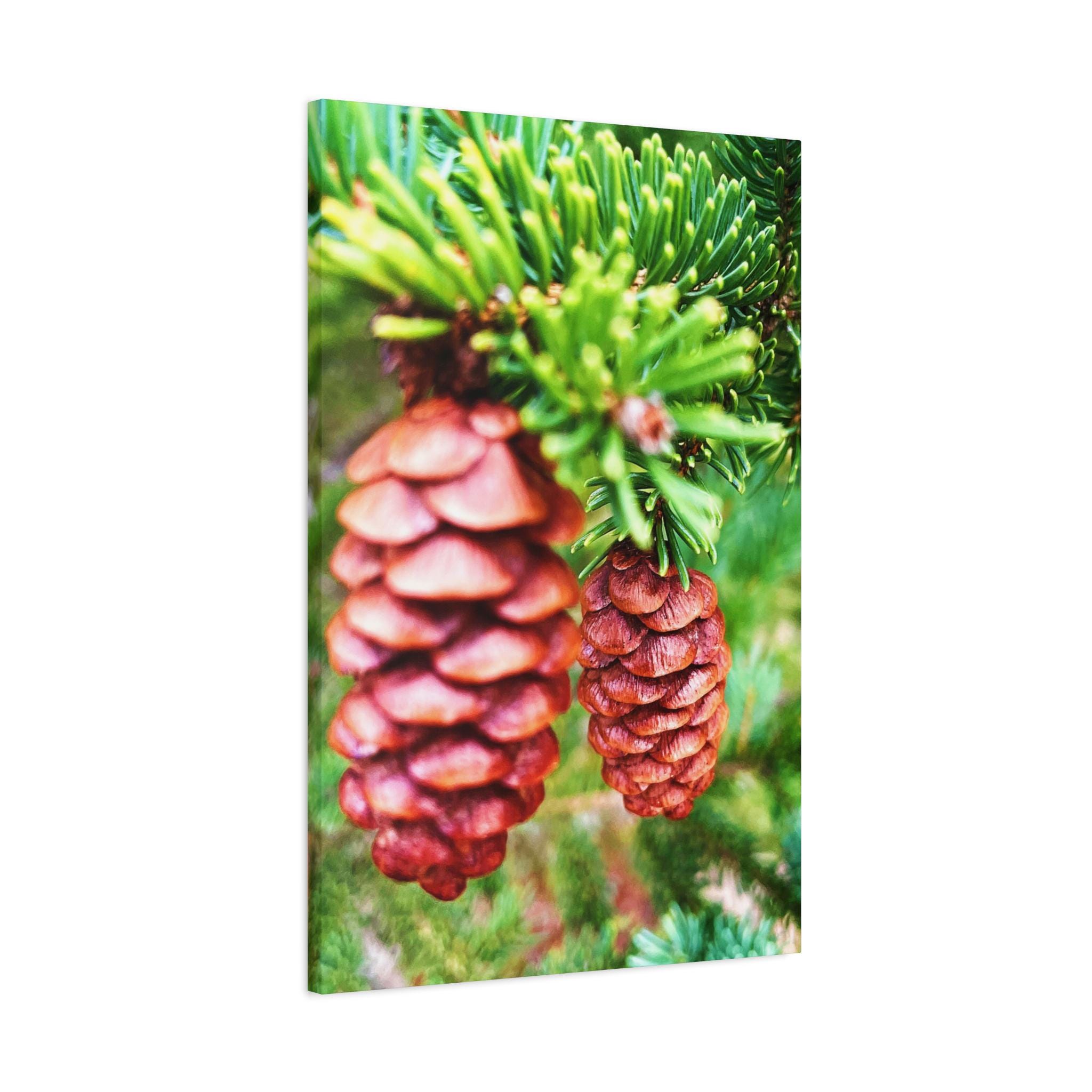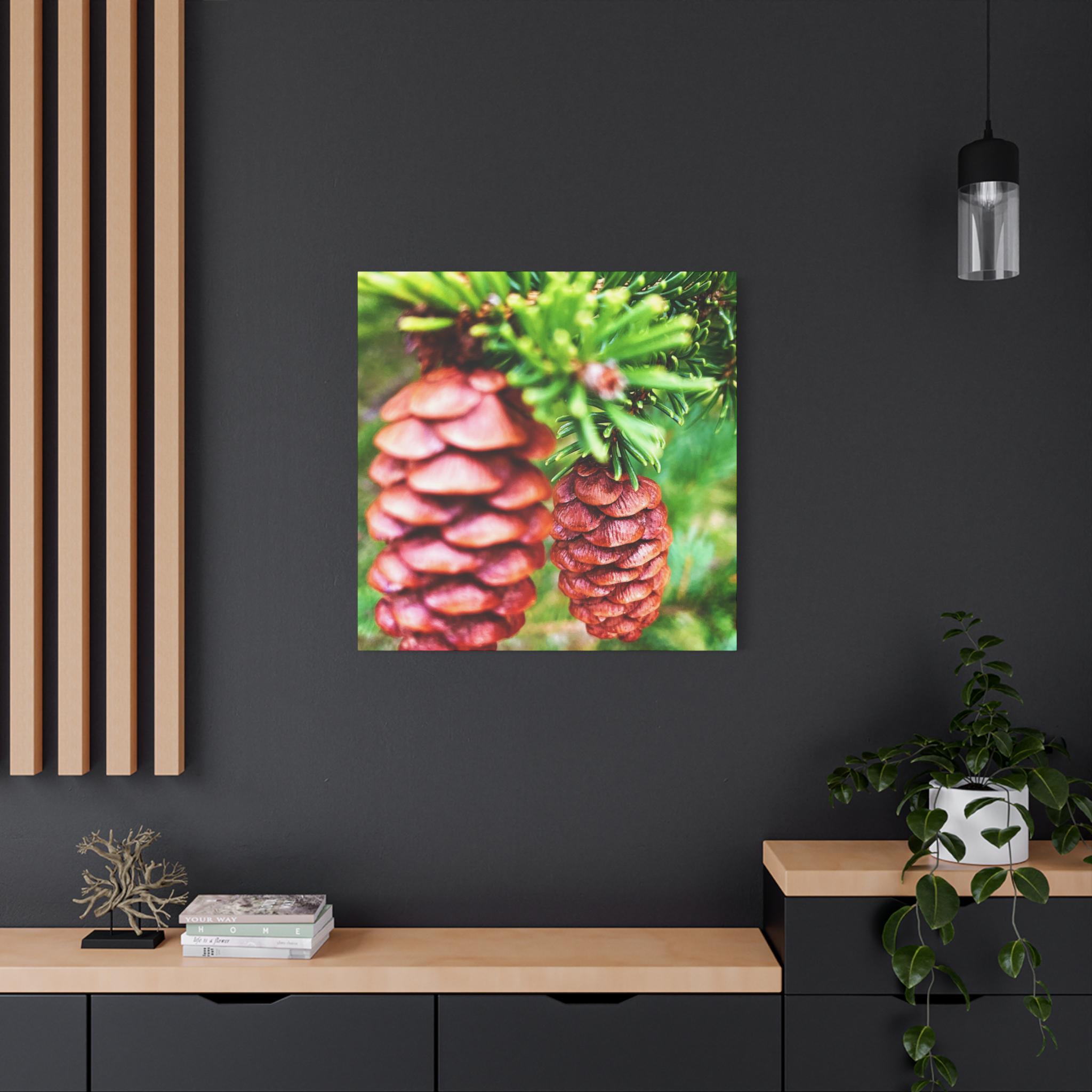 This vibrant close-up photograph showcases the beauty of pinecones nestled within fresh green pine branches. The natural textures and earthy colors bring a cozy, rustic feel—perfect for woodland-inspired spaces, cabin décor, or seasonal holiday displays.