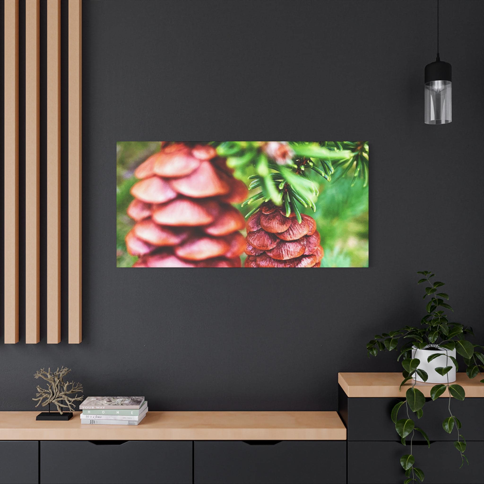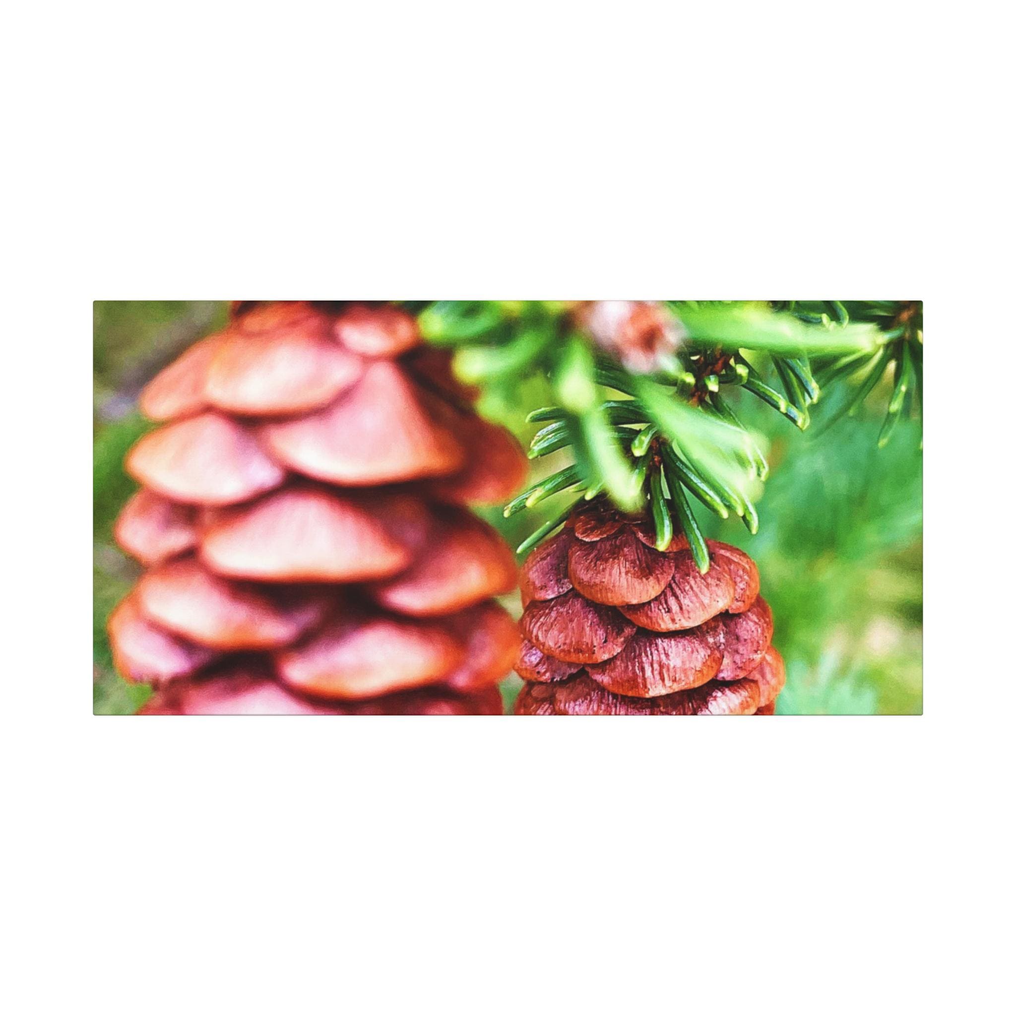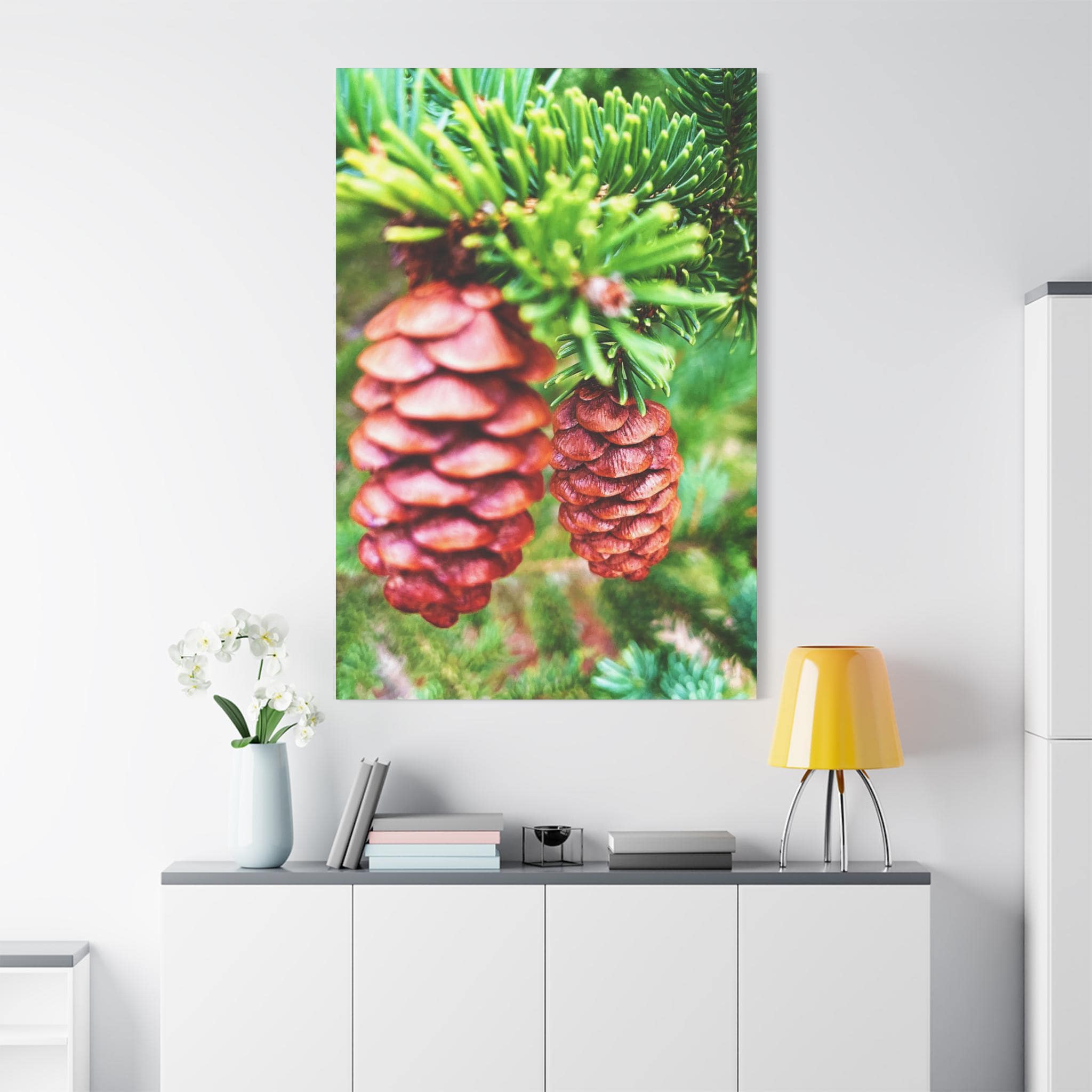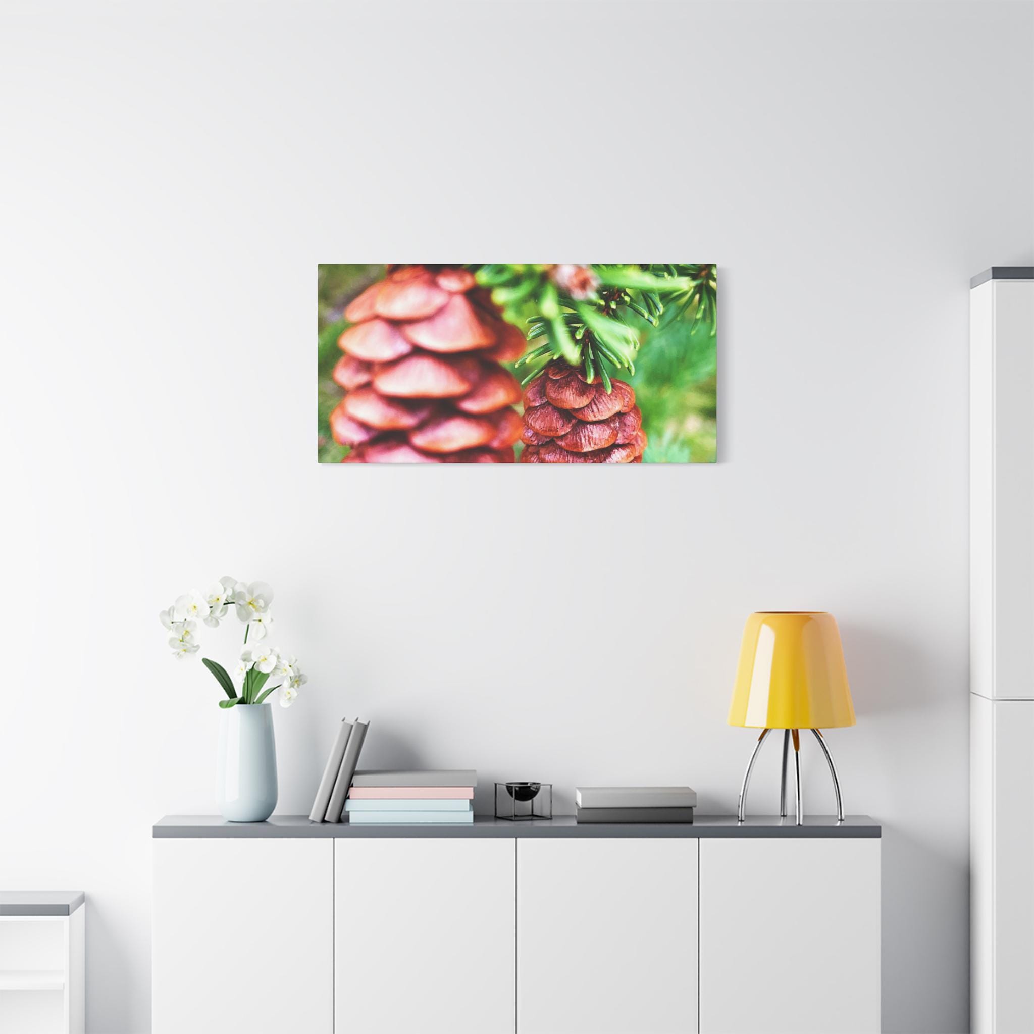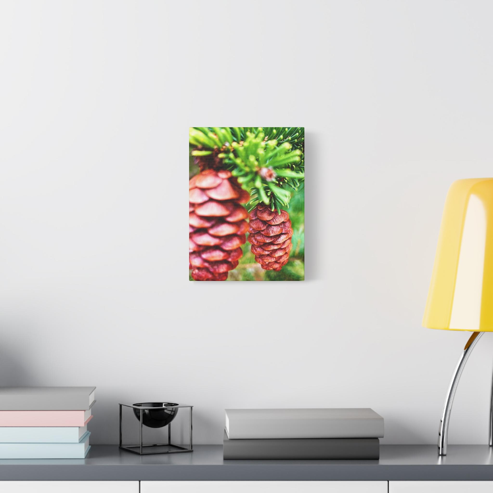 This vibrant close-up photograph showcases the beauty of pinecones nestled within fresh green pine branches. The natural textures and earthy colors bring a cozy, rustic feel—perfect for woodland-inspired spaces, cabin décor, or seasonal holiday displays.