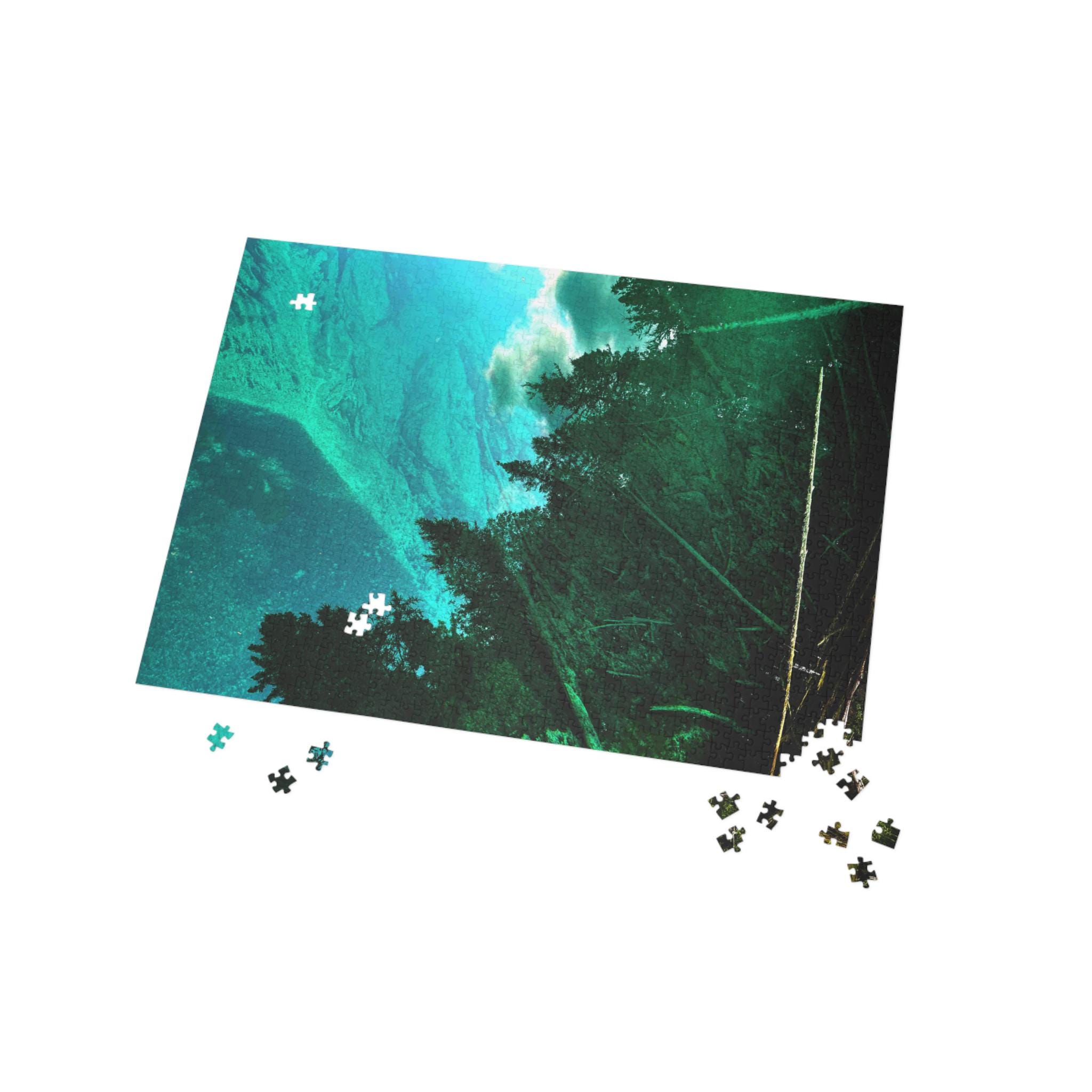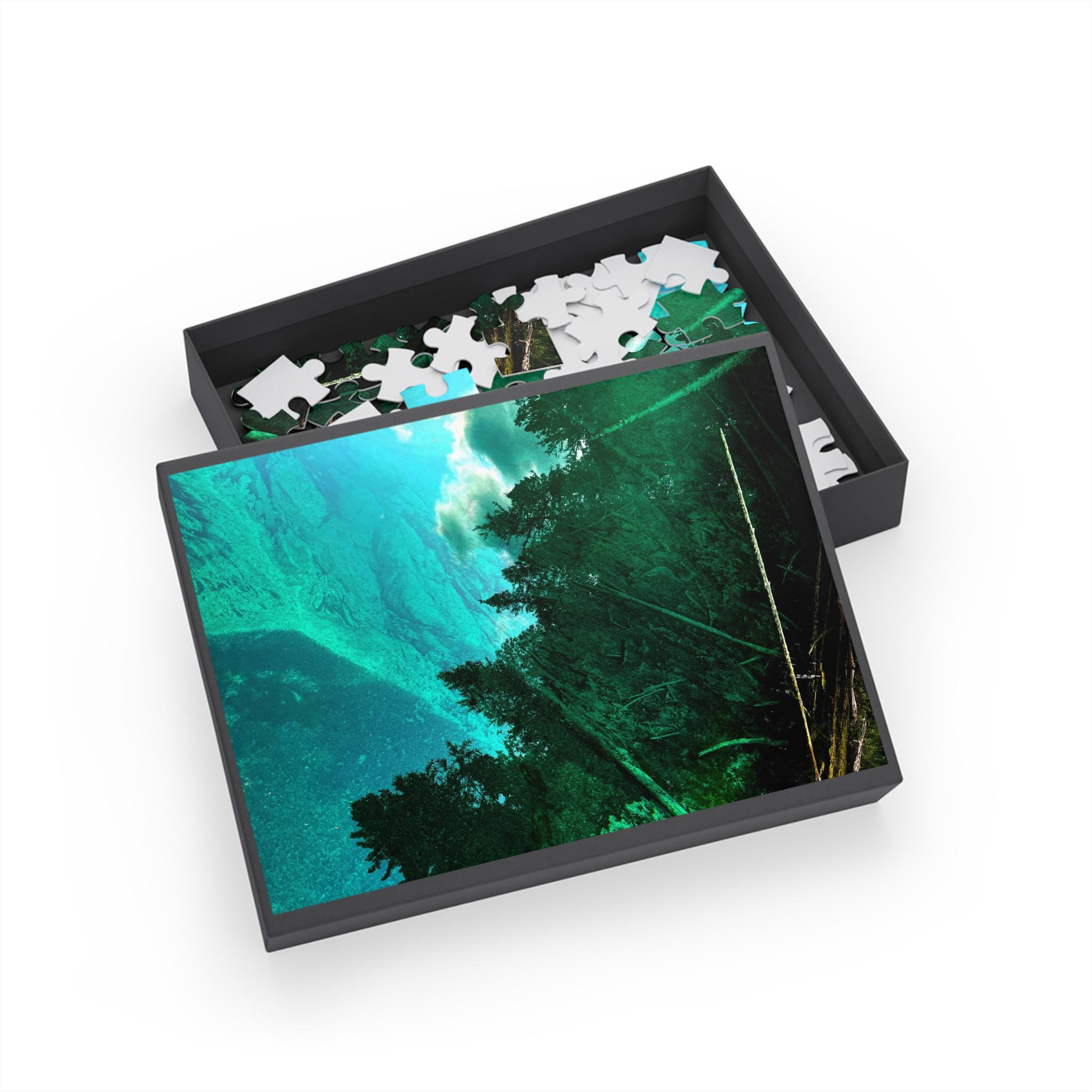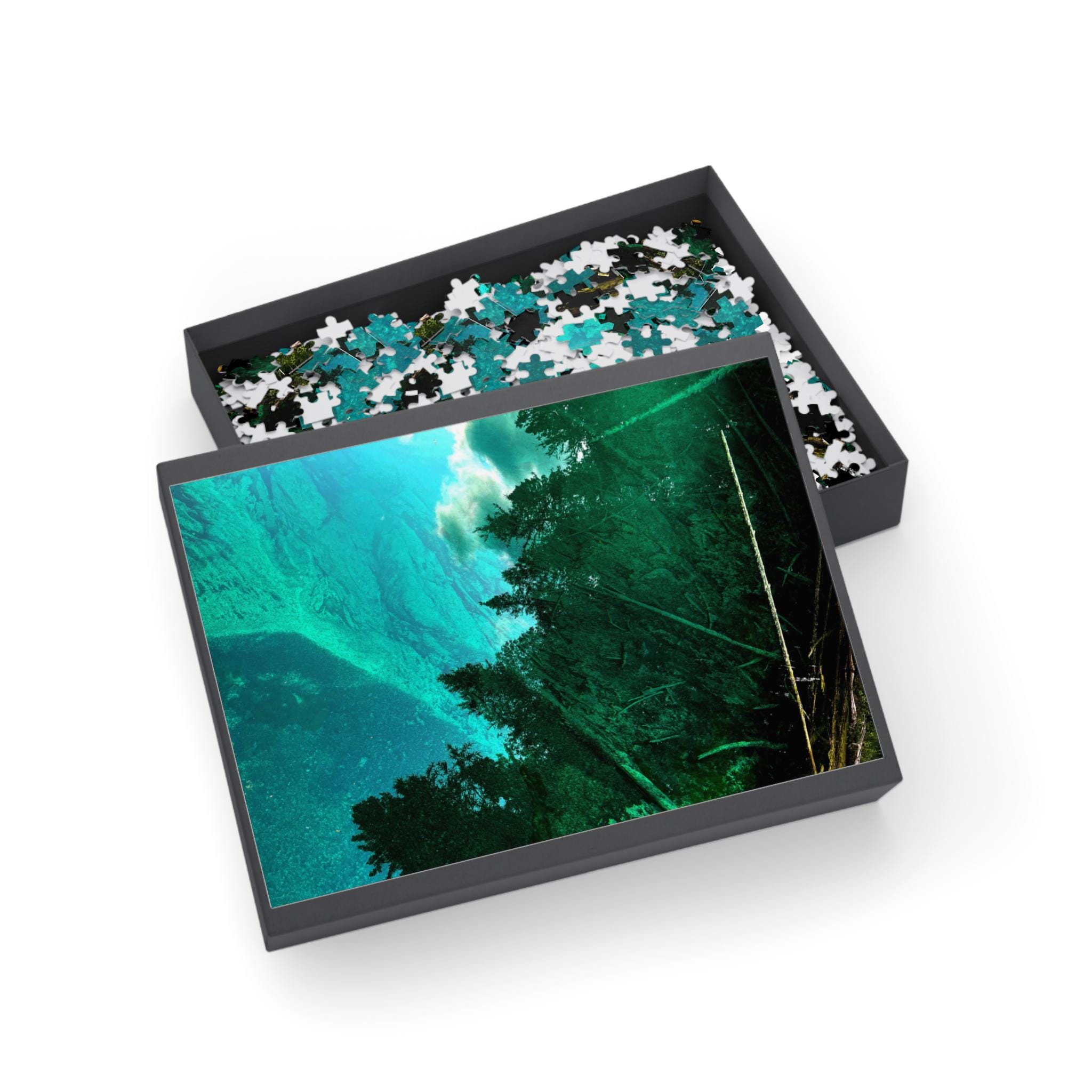 Step into the beauty of the wild with this forest reflections puzzle. Featuring tree silhouettes set against turquoise water, this puzzle offers bold contrasts and a moody design for puzzle lovers who want something unique.