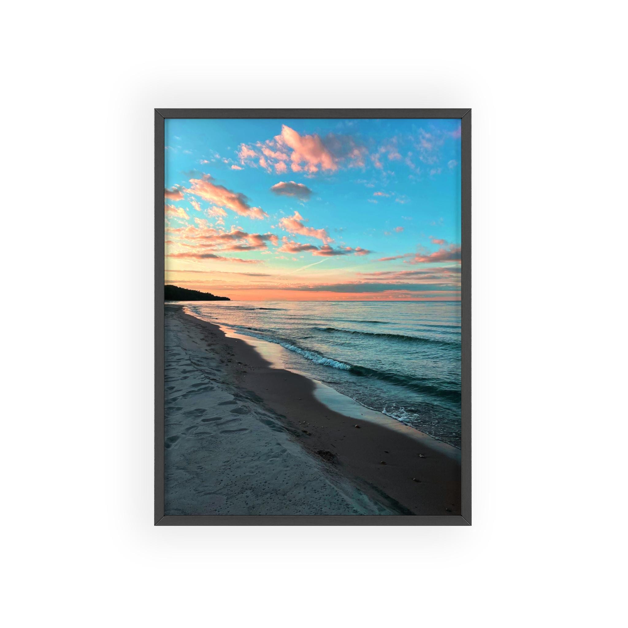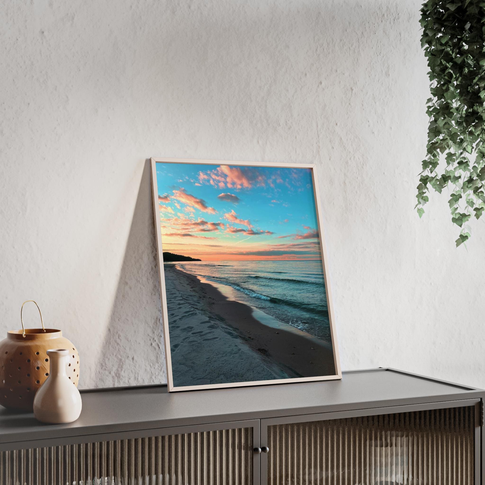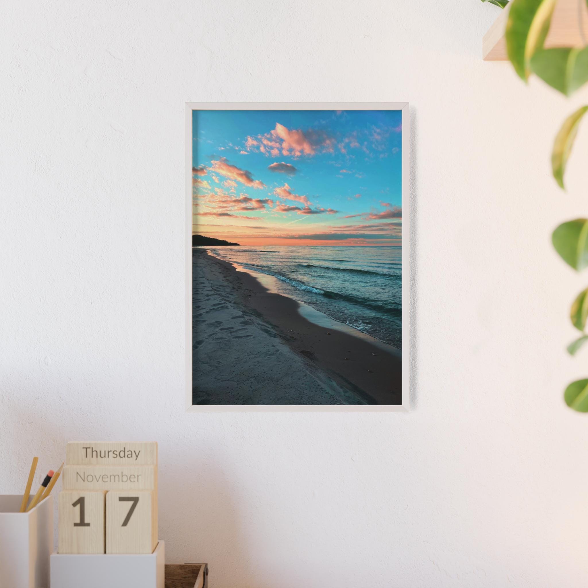Bring the calming vibes of a pink, yellow, and blue sunset on the beach into your space with these vibrant posters framed in your choice of natural wood, black, or white pinewood frame. Perfect for beach lovers and those looking to add a touch of serenity to their home decor. Ideal for decorating a beach house, dorm room, or office. Great for summer decor, coastal-themed parties, and beach-themed events.