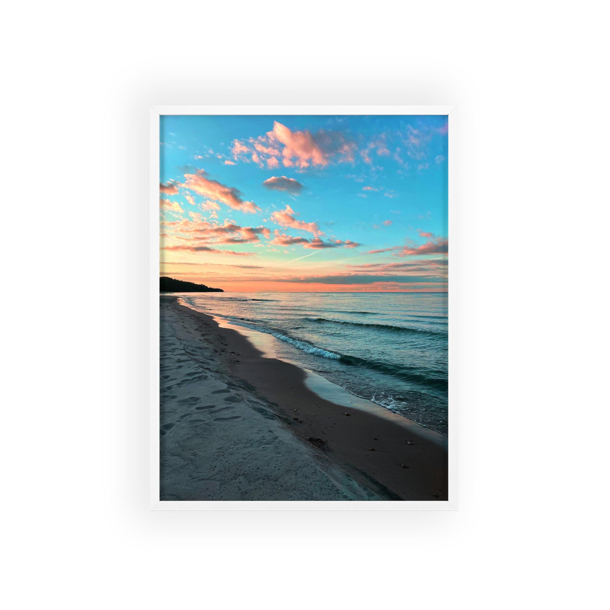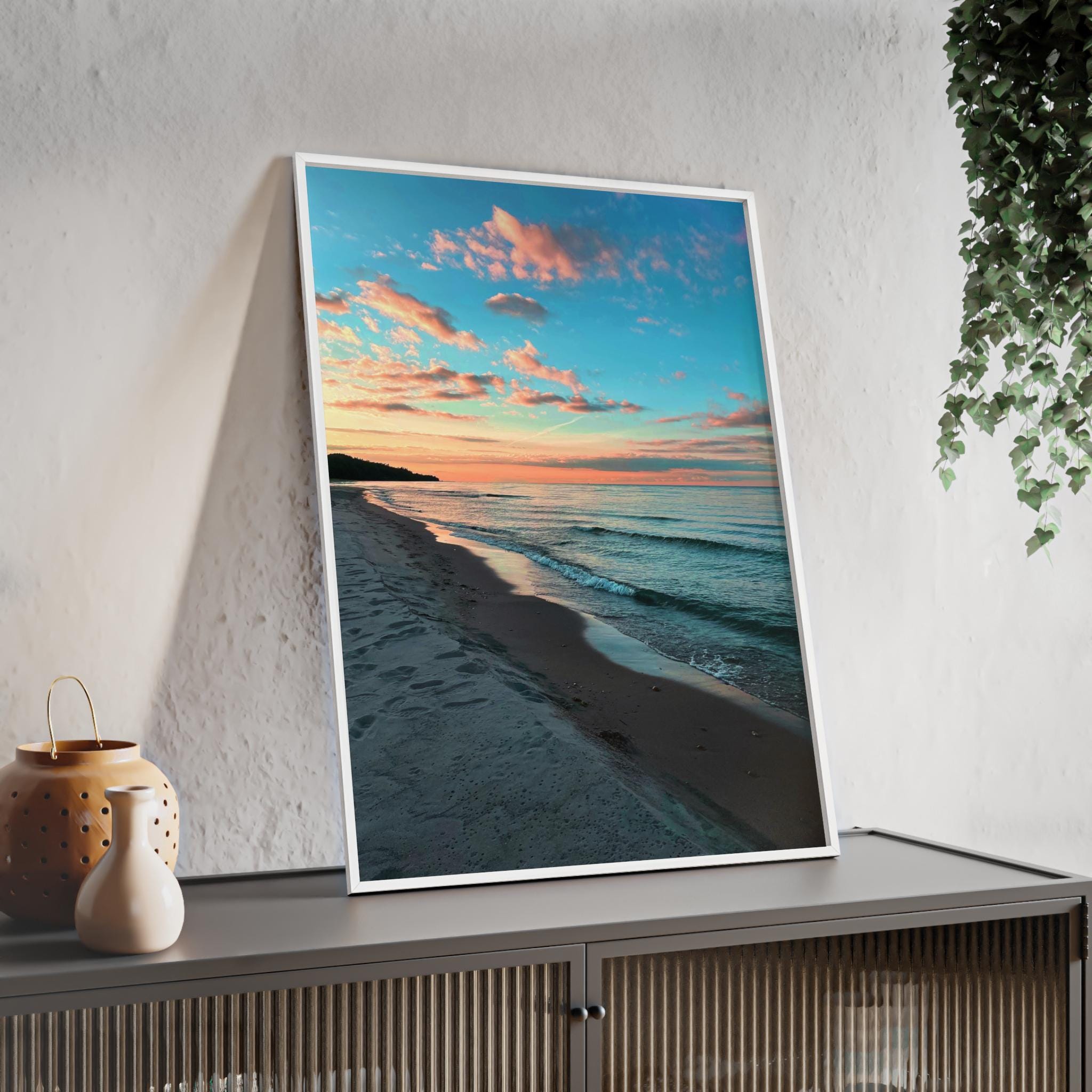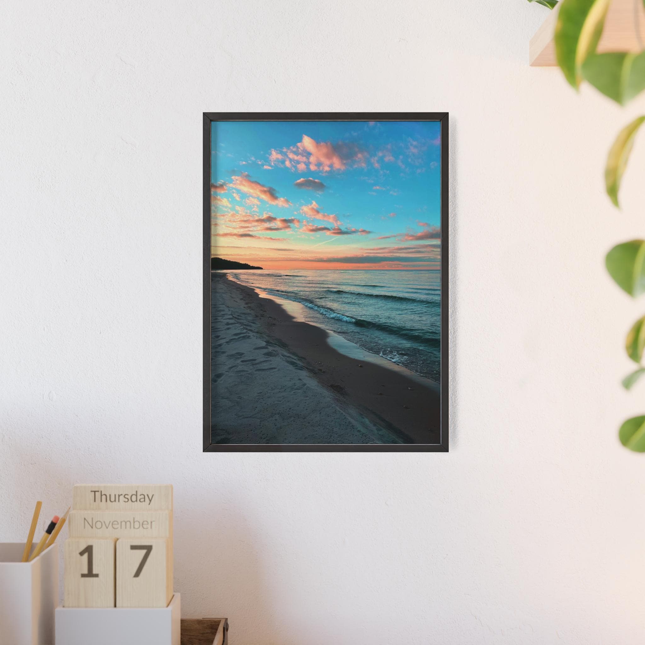 Bring the calming vibes of a pink, yellow, and blue sunset on the beach into your space with these vibrant posters framed in your choice of natural wood, black, or white pinewood frame. Perfect for beach lovers and those looking to add a touch of serenity to their home decor. Ideal for decorating a beach house, dorm room, or office. Great for summer decor, coastal-themed parties, and beach-themed events.