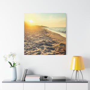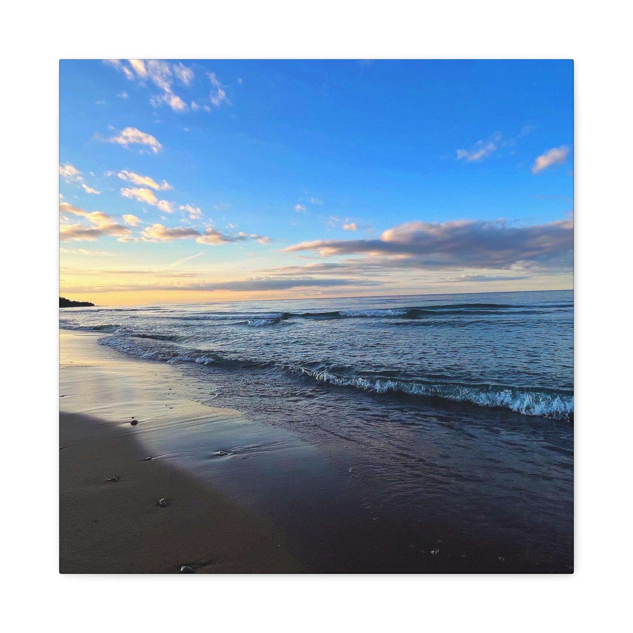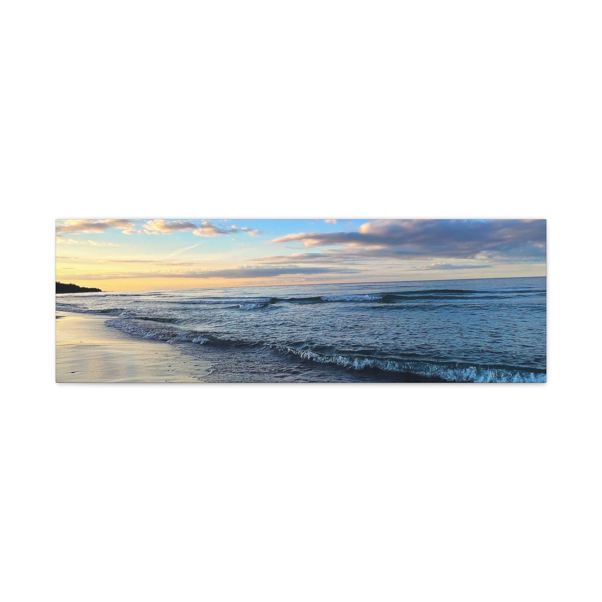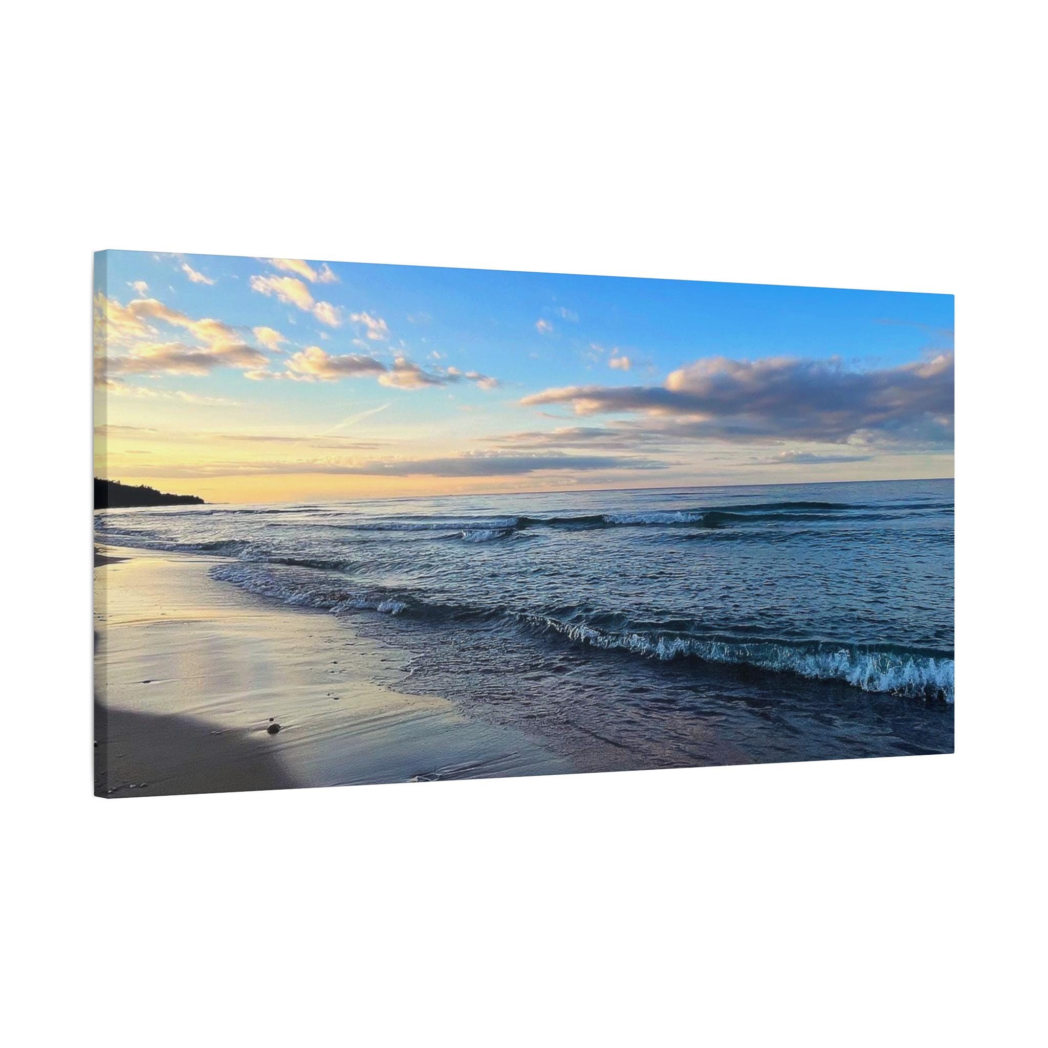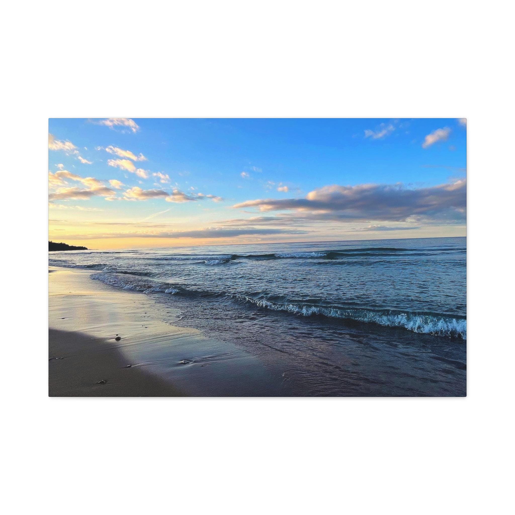 Experience the tranquility of a beautiful calm evening on the beach at golden hour with this stunning canvas print. Perfect for creating a relaxing atmosphere in any space, this print is ideal for beach lovers and those who appreciate serene coastal scenes. Great for adding a touch of coastal charm to your home decor, this canvas print is also a wonderful gift for birthdays, holidays, or housewarmings.