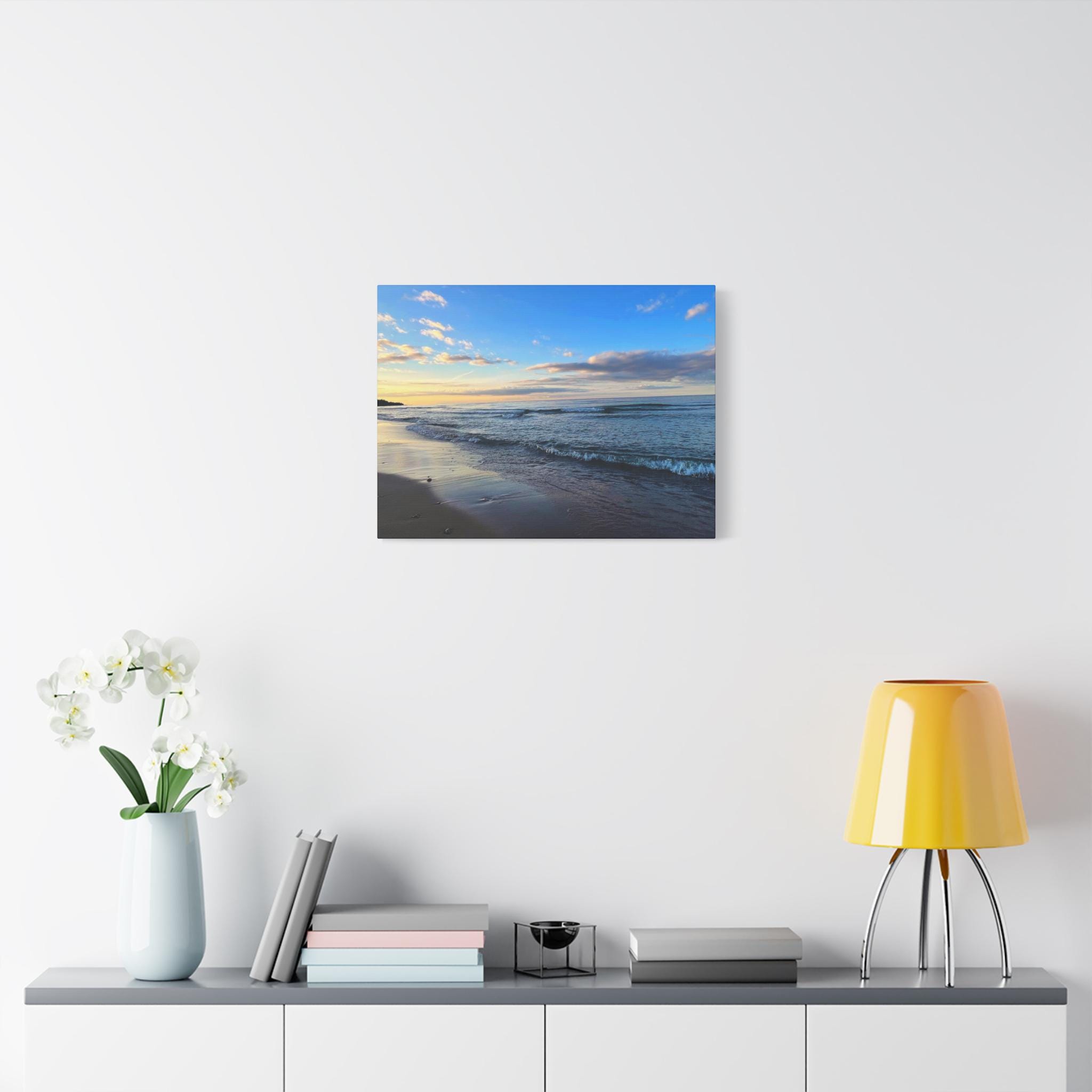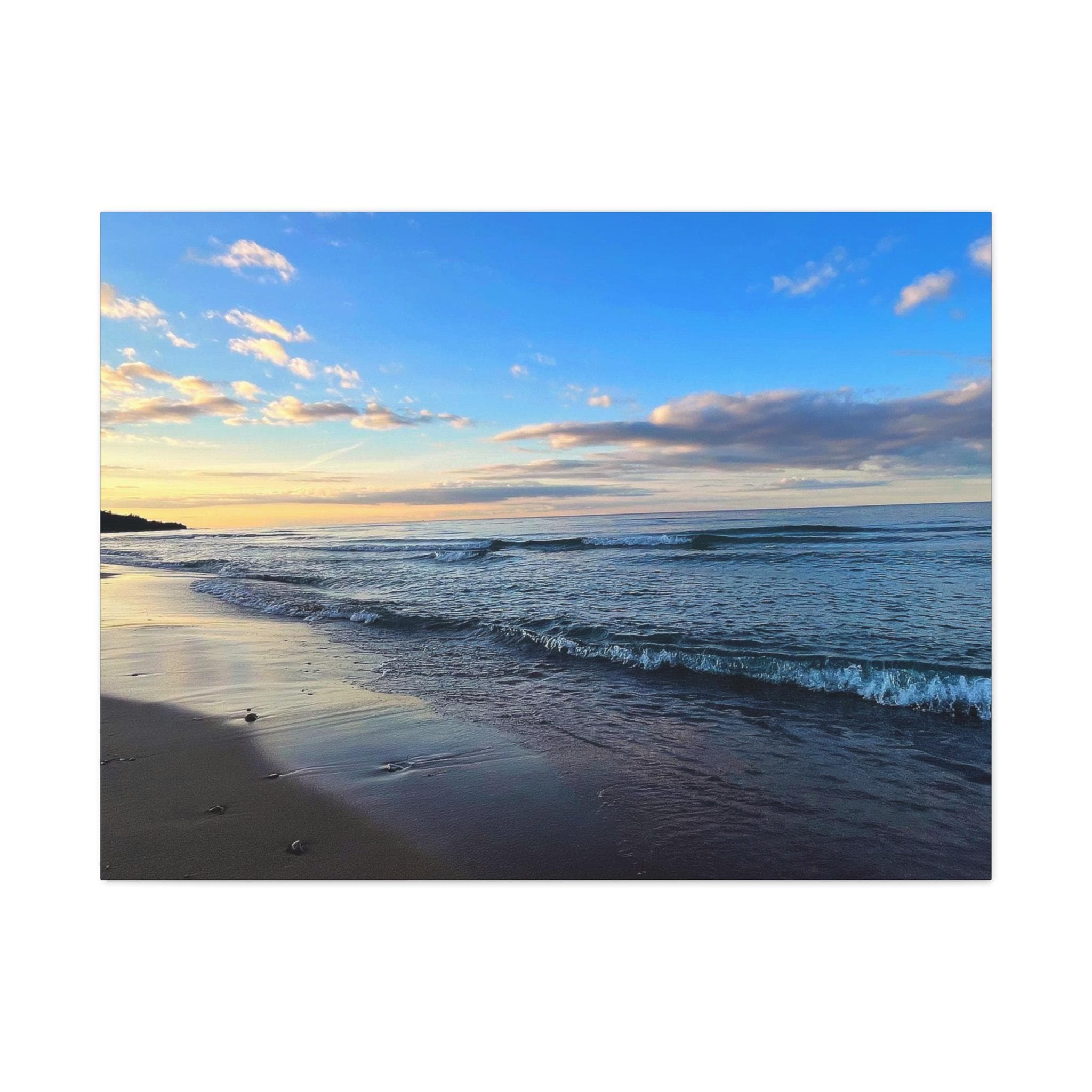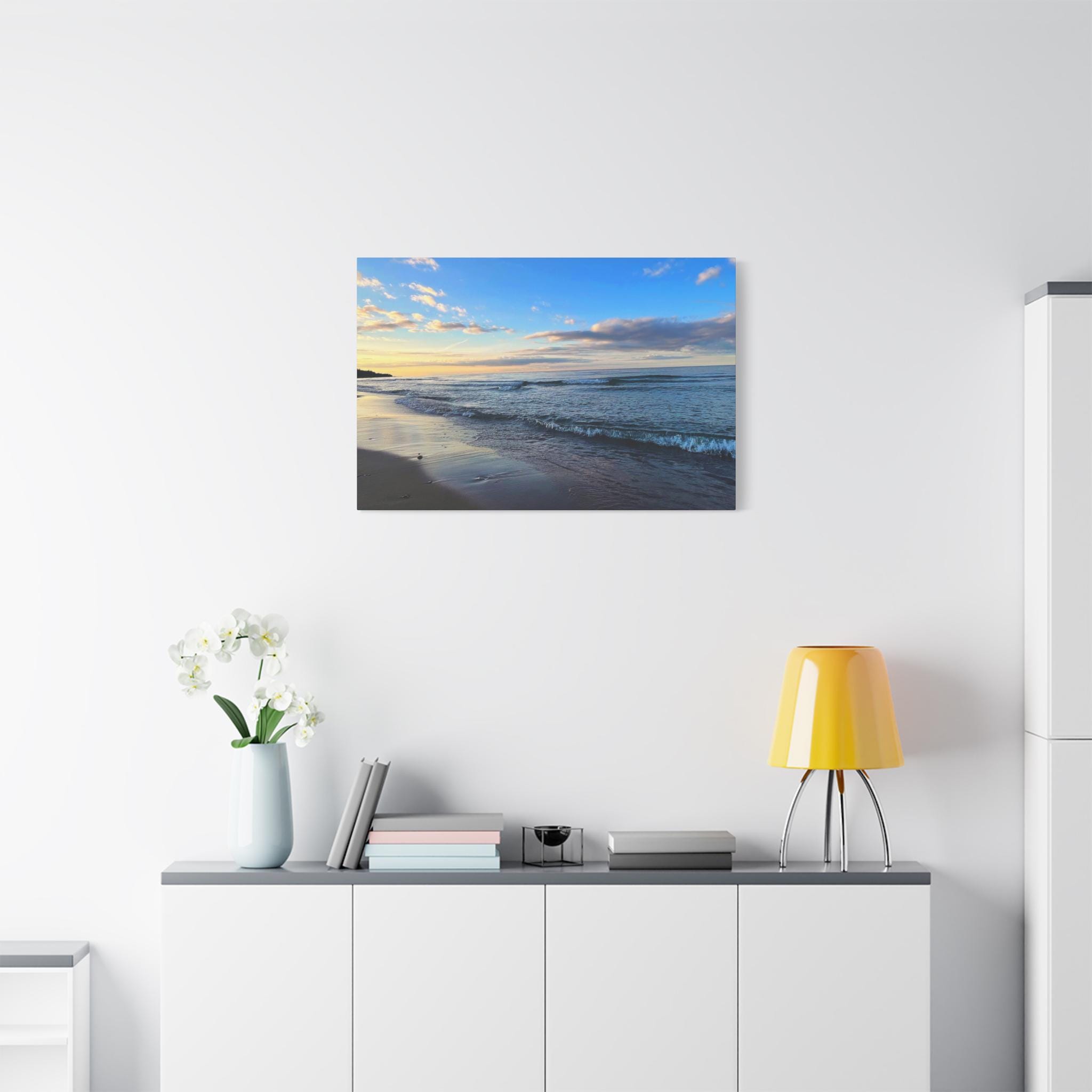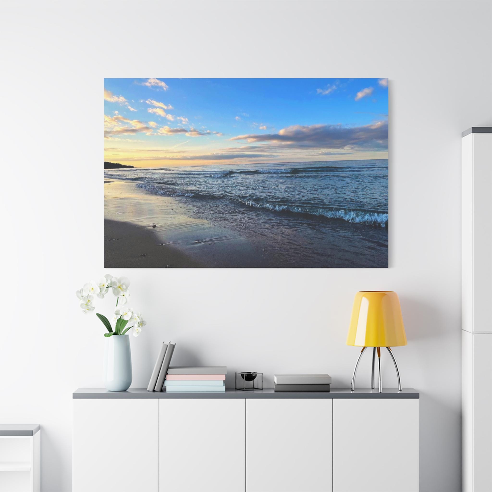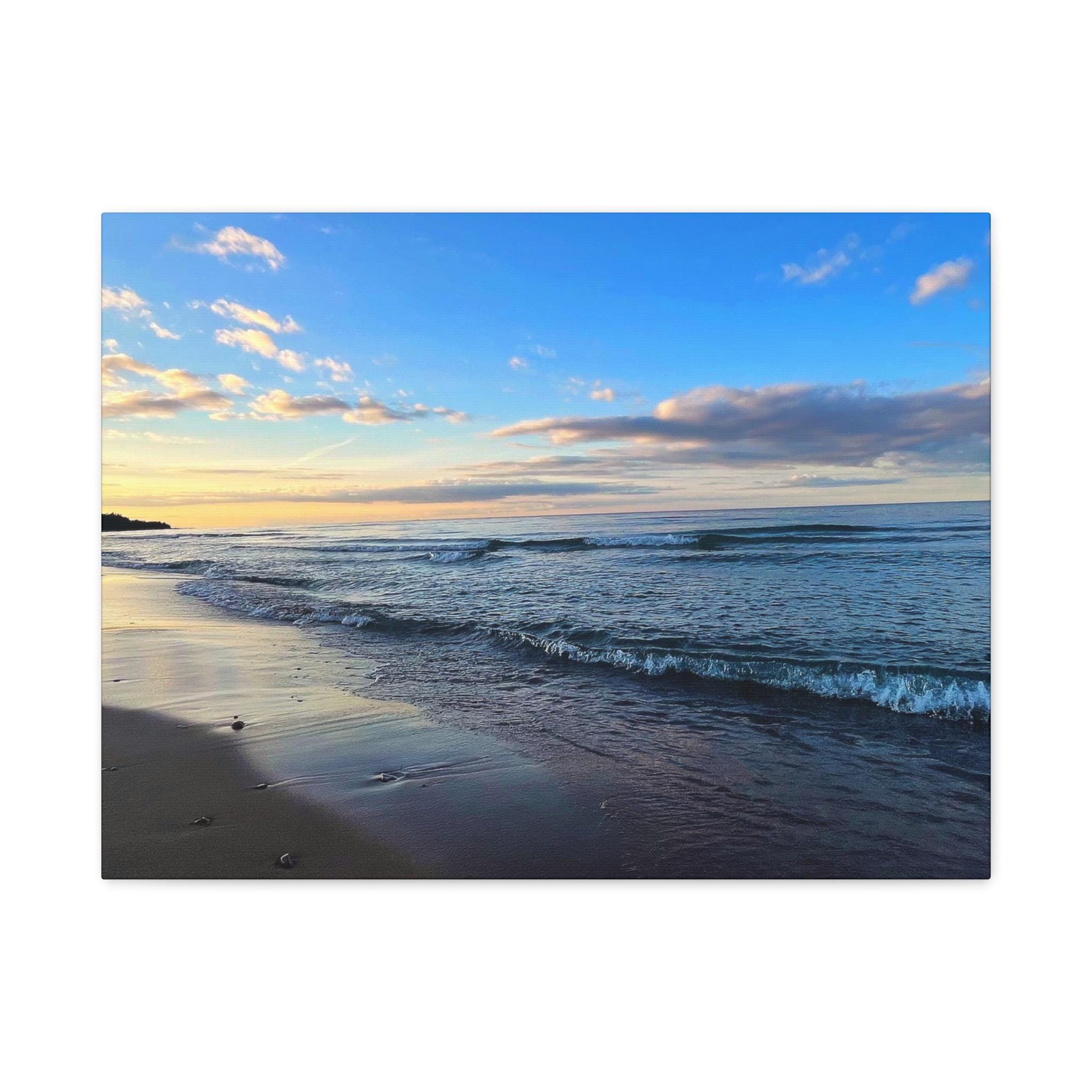 Experience the tranquility of a beautiful calm evening on the beach at golden hour with this stunning canvas print. Perfect for creating a relaxing atmosphere in any space, this print is ideal for beach lovers and those who appreciate serene coastal scenes. Great for adding a touch of coastal charm to your home decor, this canvas print is also a wonderful gift for birthdays, holidays, or housewarmings.