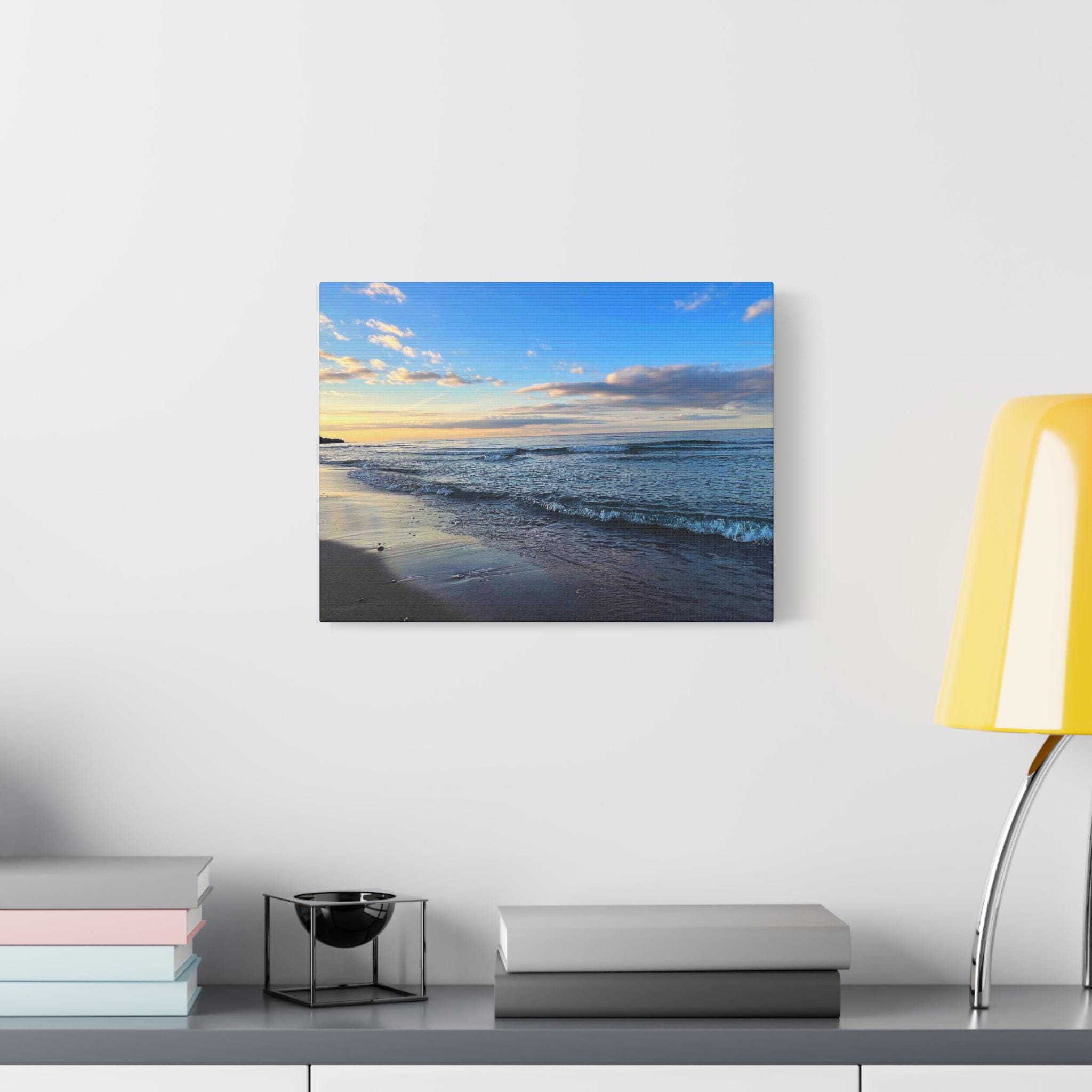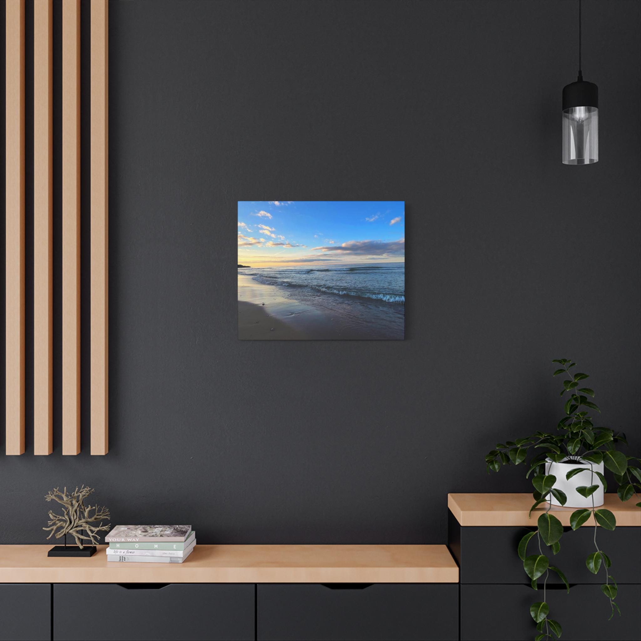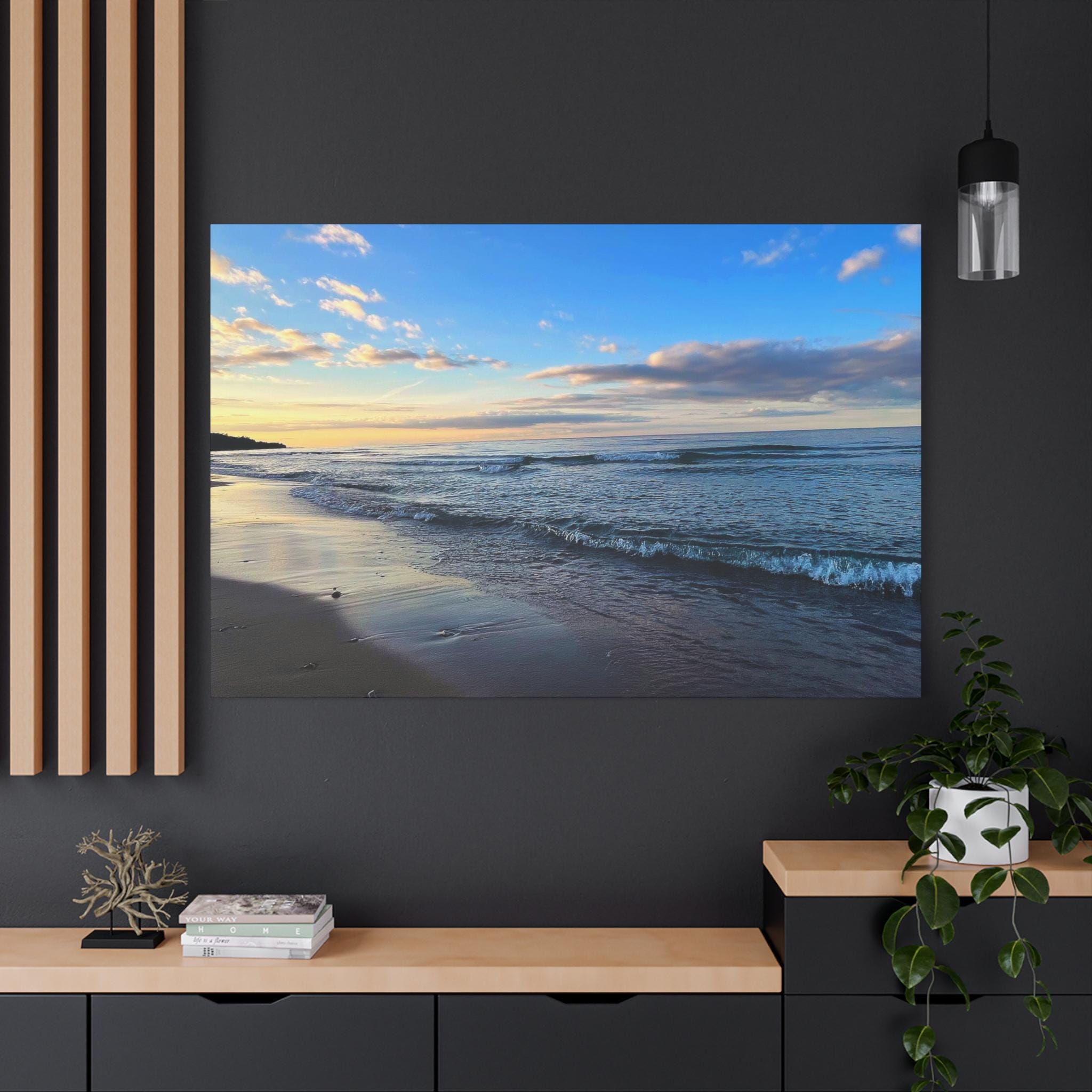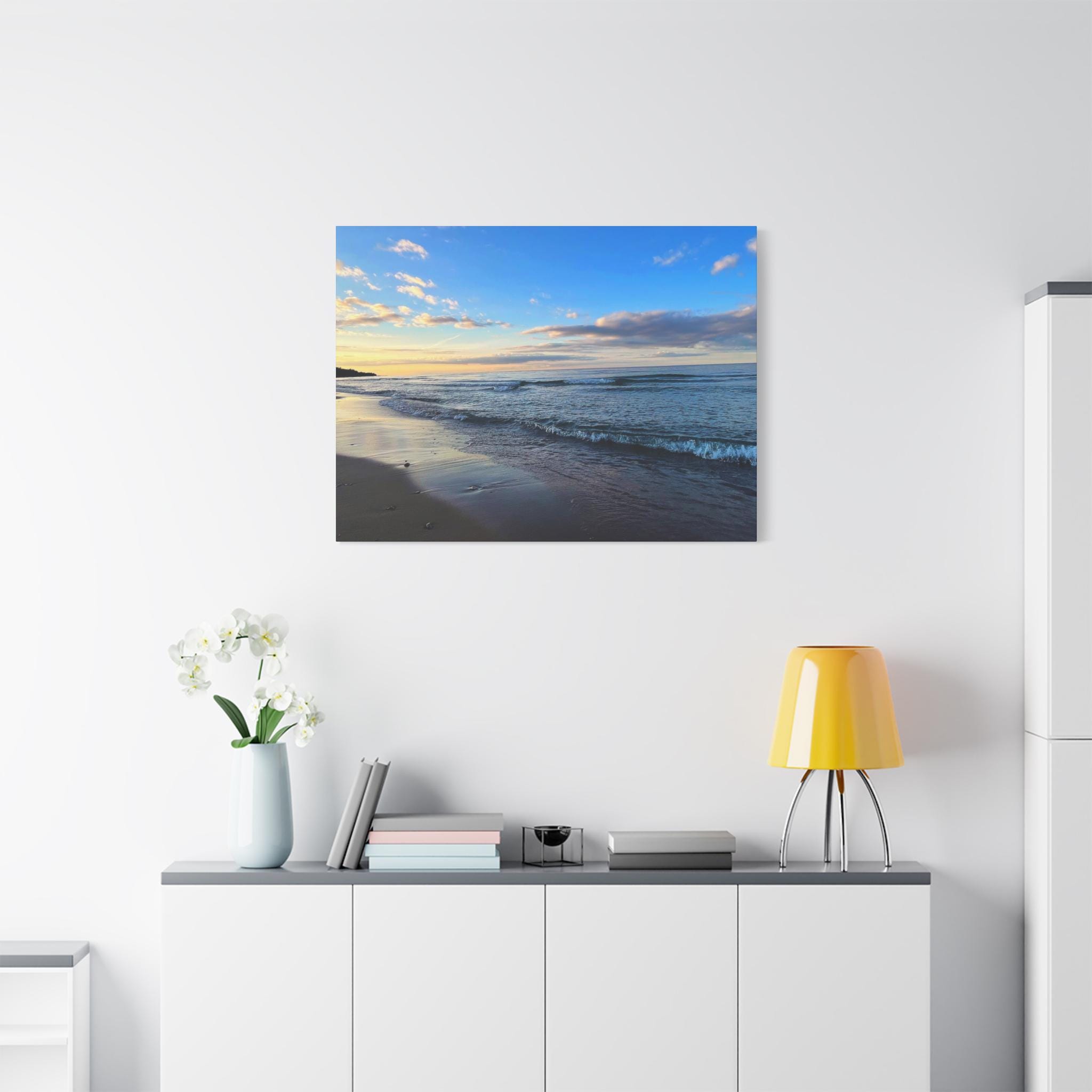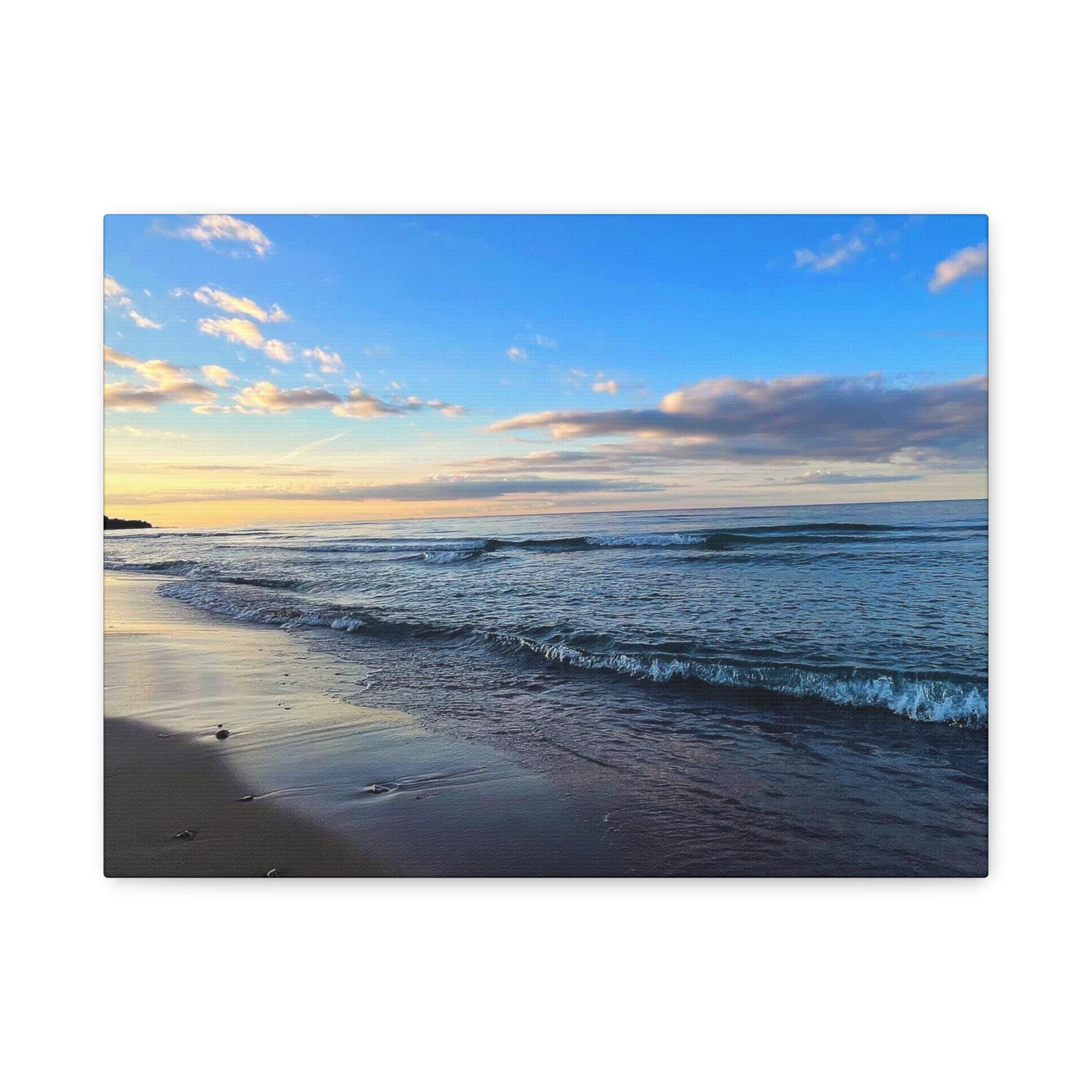 Experience the tranquility of a beautiful calm evening on the beach at golden hour with this stunning canvas print. Perfect for creating a relaxing atmosphere in any space, this print is ideal for beach lovers and those who appreciate serene coastal scenes. Great for adding a touch of coastal charm to your home decor, this canvas print is also a wonderful gift for birthdays, holidays, or housewarmings.