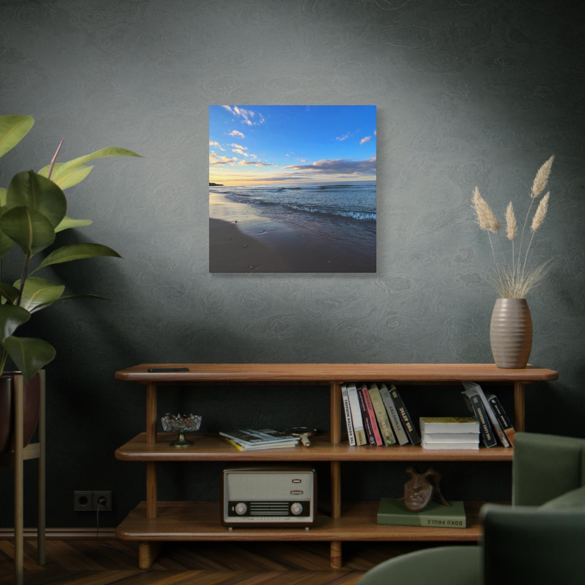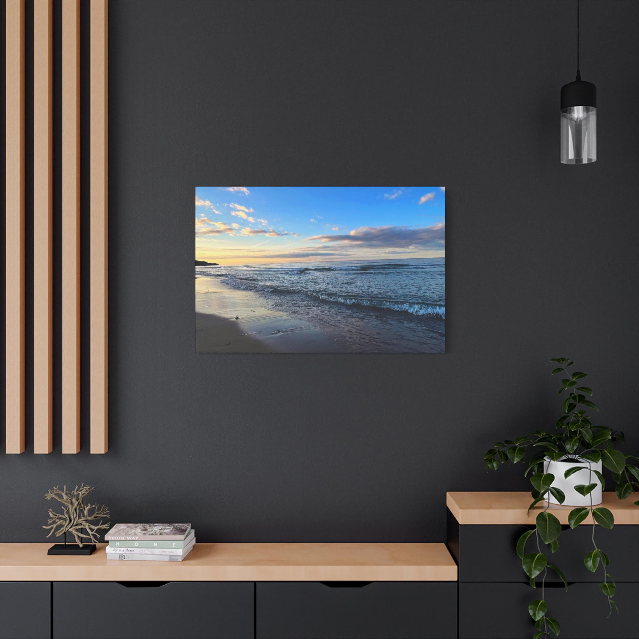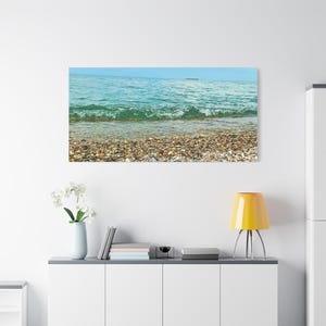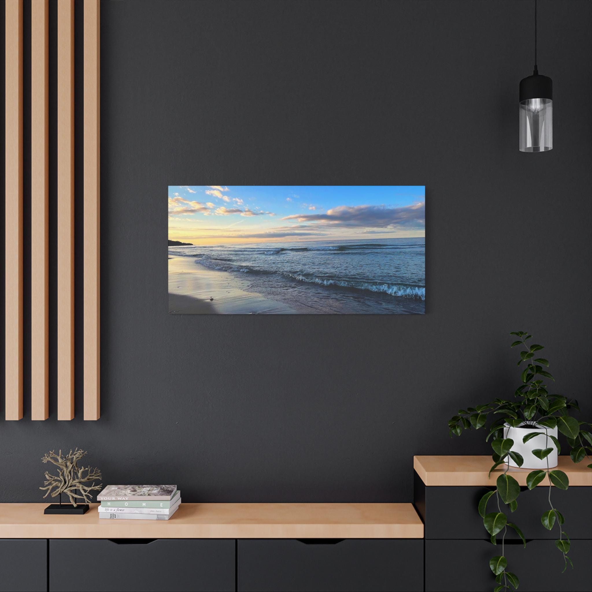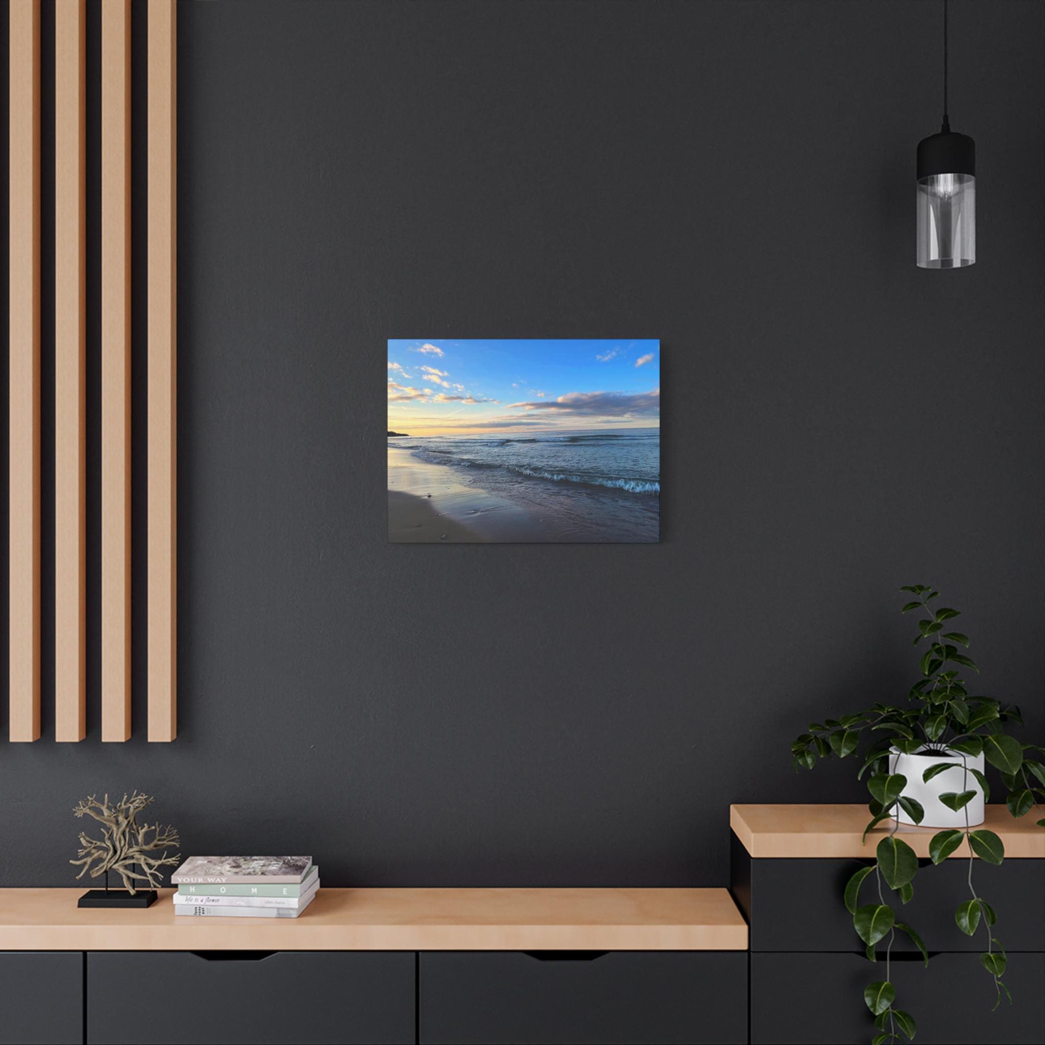 Experience the tranquility of a beautiful calm evening on the beach at golden hour with this stunning canvas print. Perfect for creating a relaxing atmosphere in any space, this print is ideal for beach lovers and those who appreciate serene coastal scenes. Great for adding a touch of coastal charm to your home decor, this canvas print is also a wonderful gift for birthdays, holidays, or housewarmings.