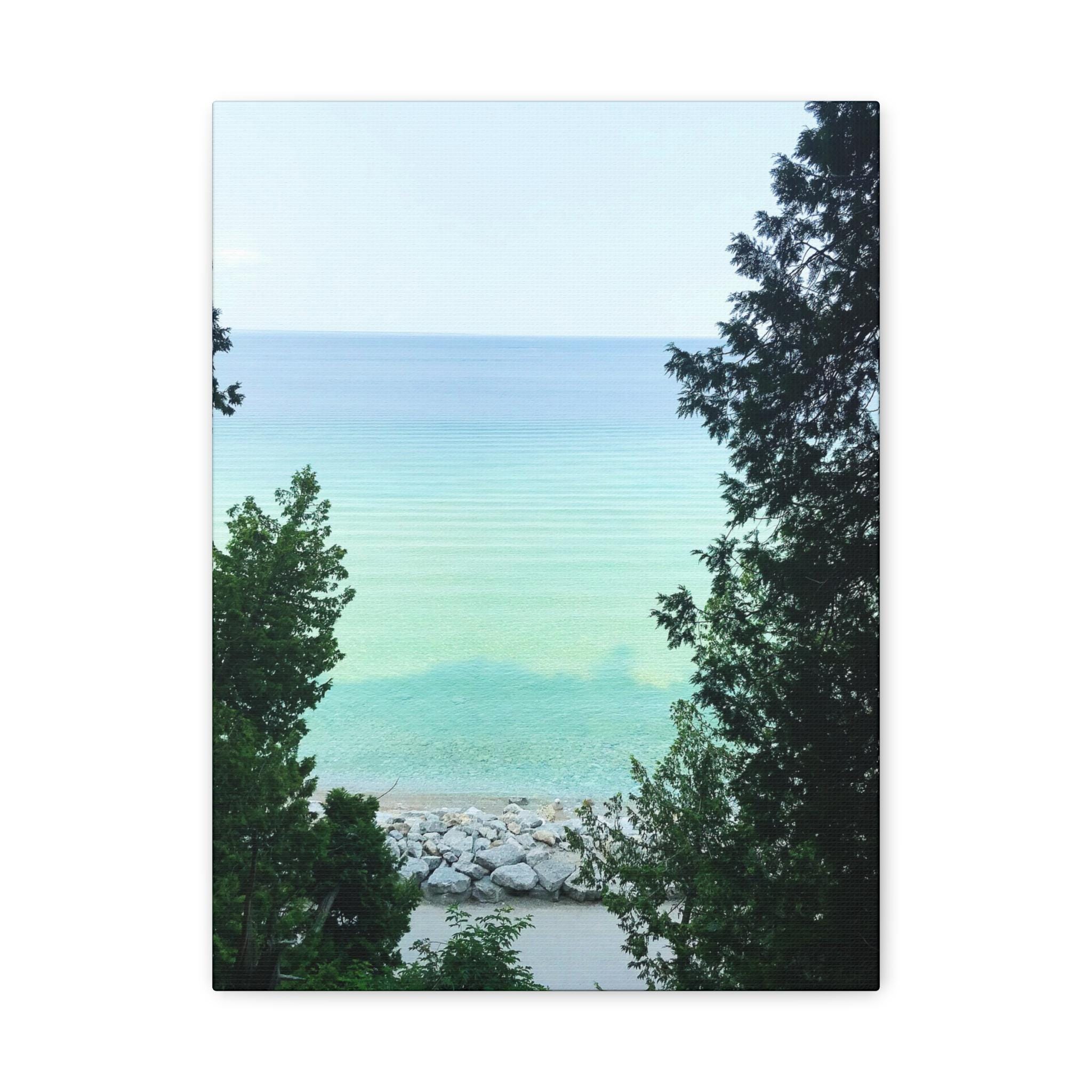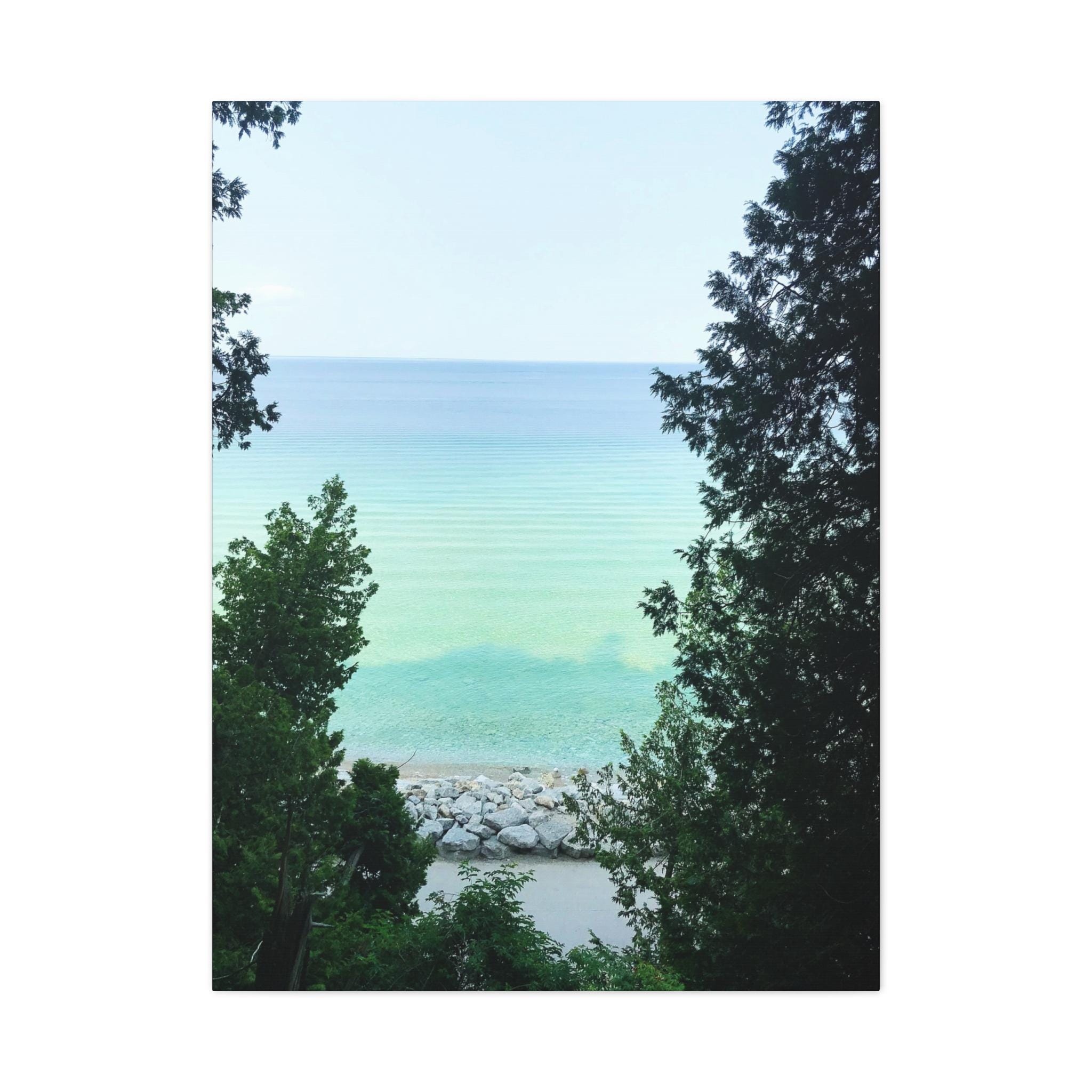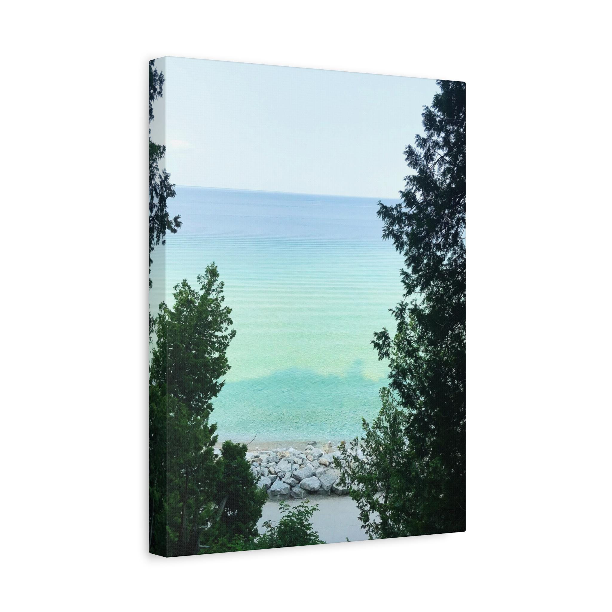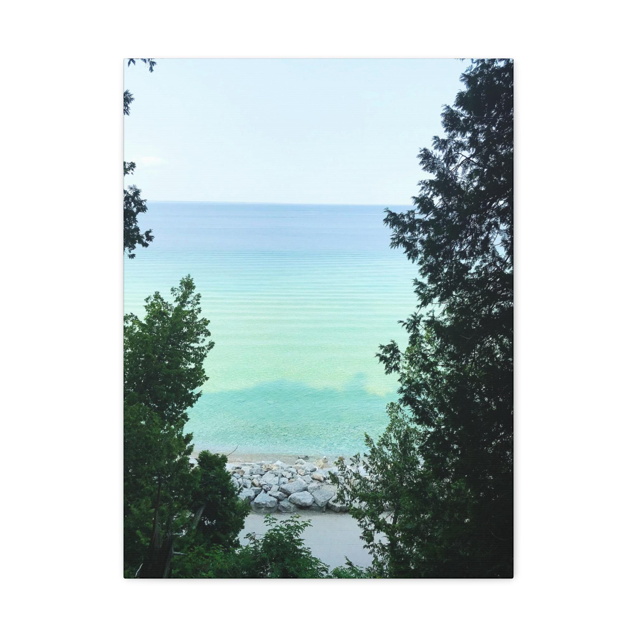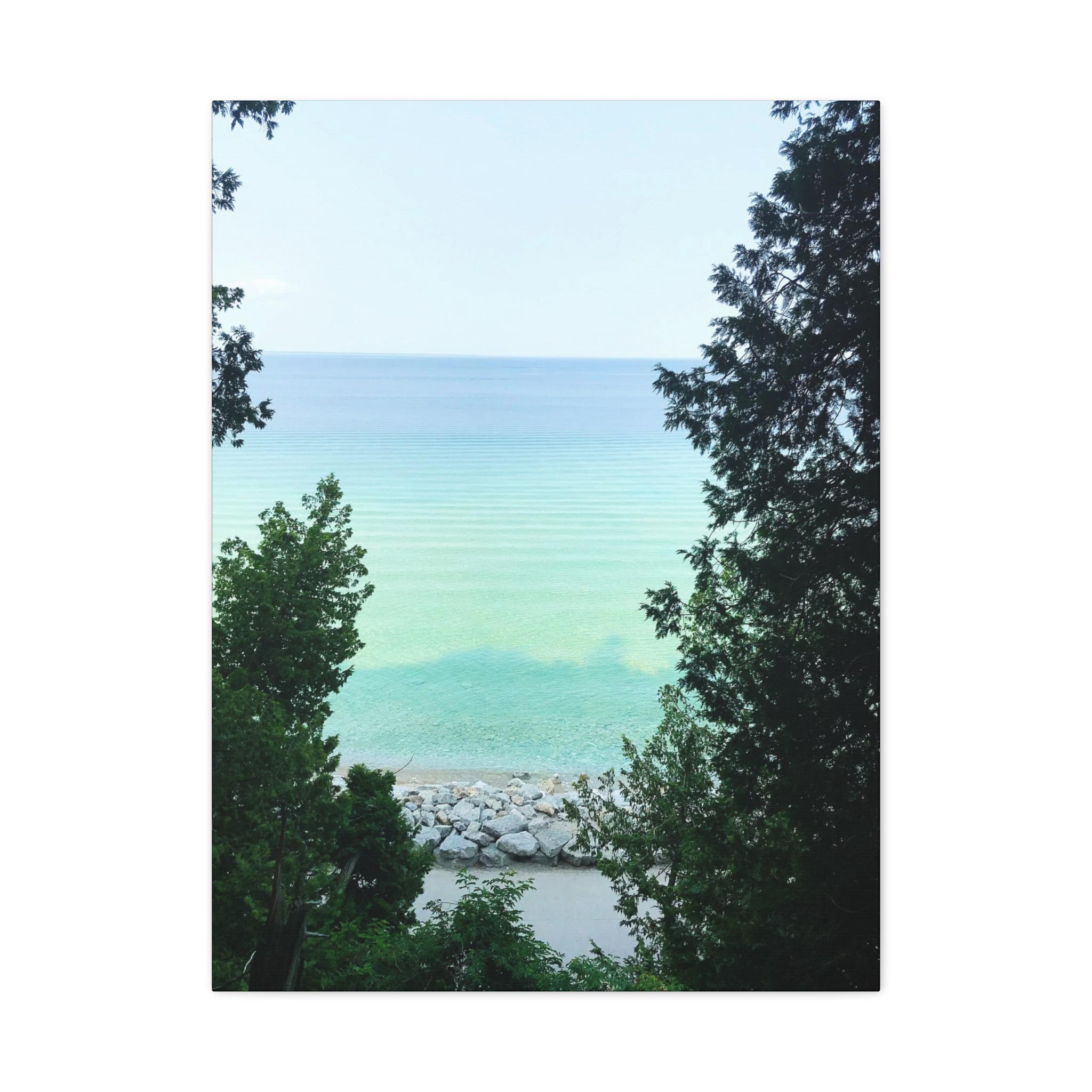 Bring the refreshing calm of the water into your home with this turquoise lake canvas wall art. Captured through a natural frame of lush green trees, the photo opens to reveal clear aqua water meeting the horizon. The layered shades of blue and green create a soothing, coastal atmosphere that instantly brightens any room.