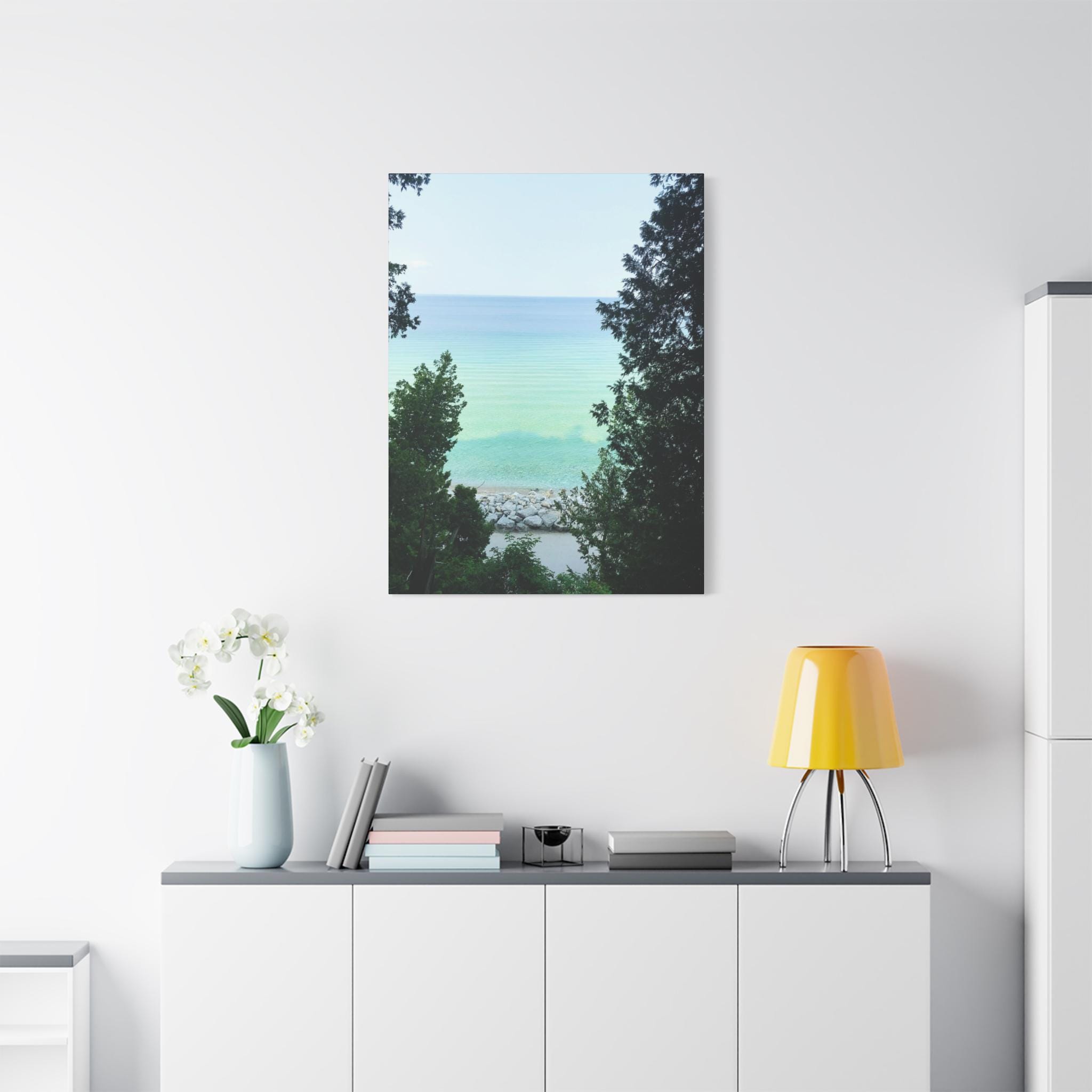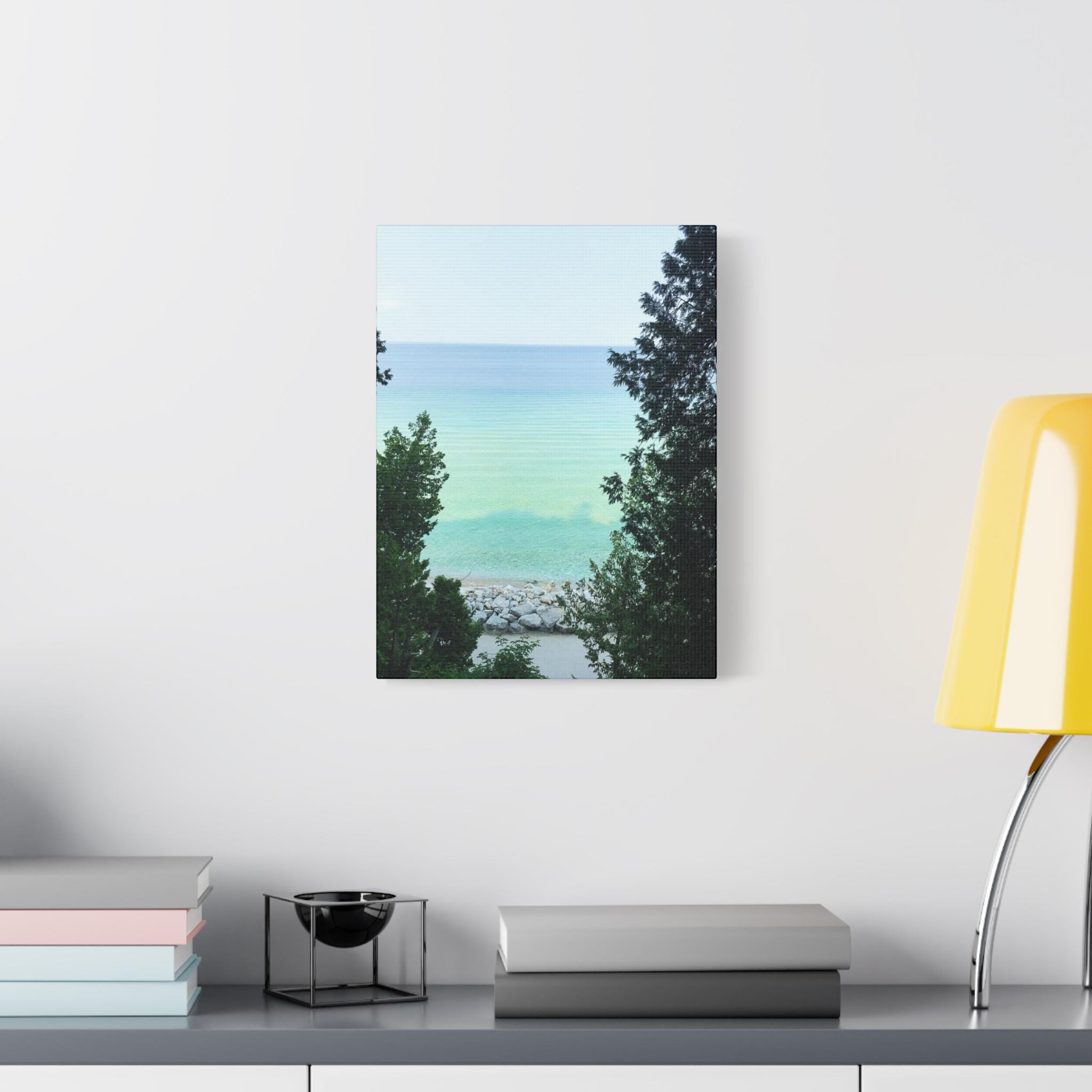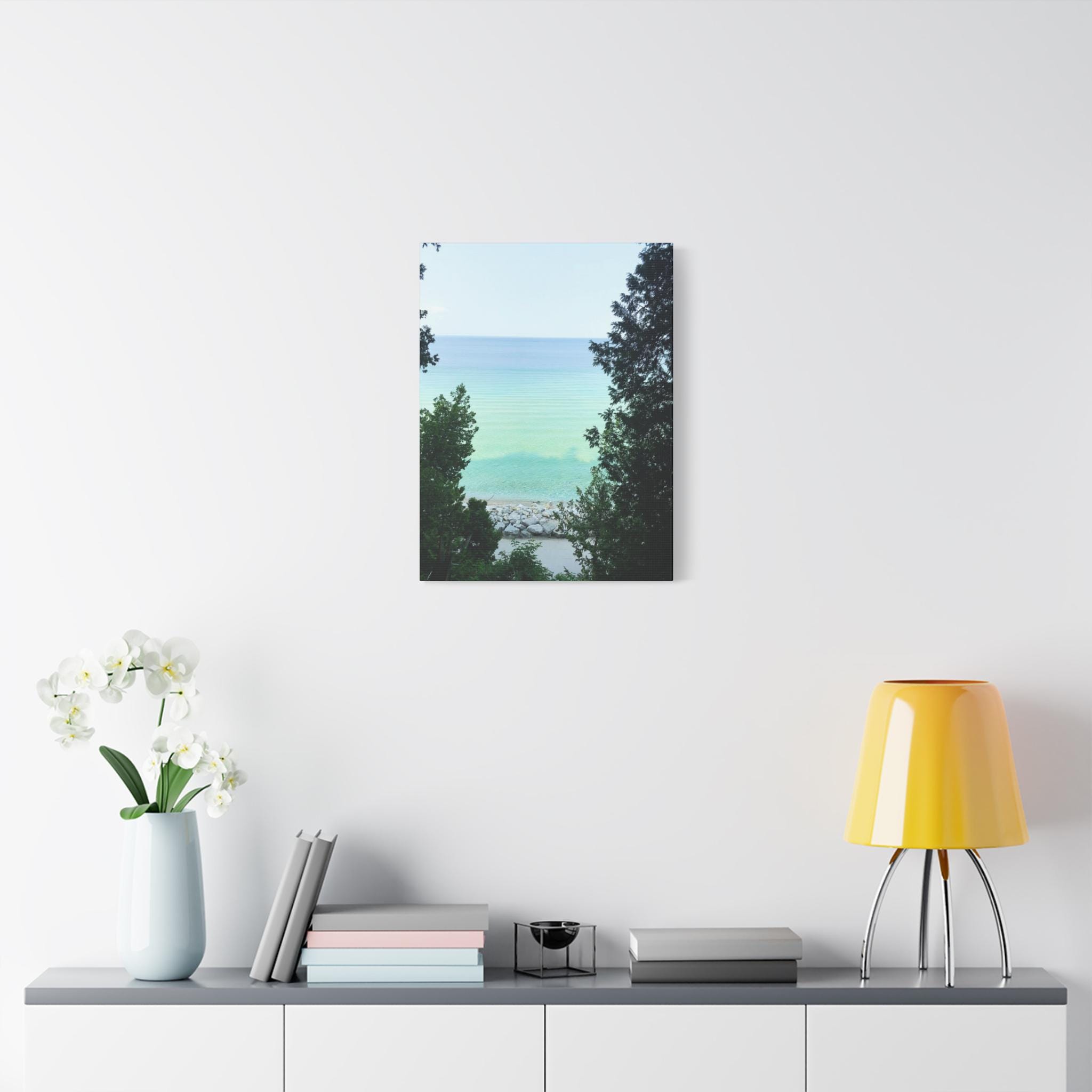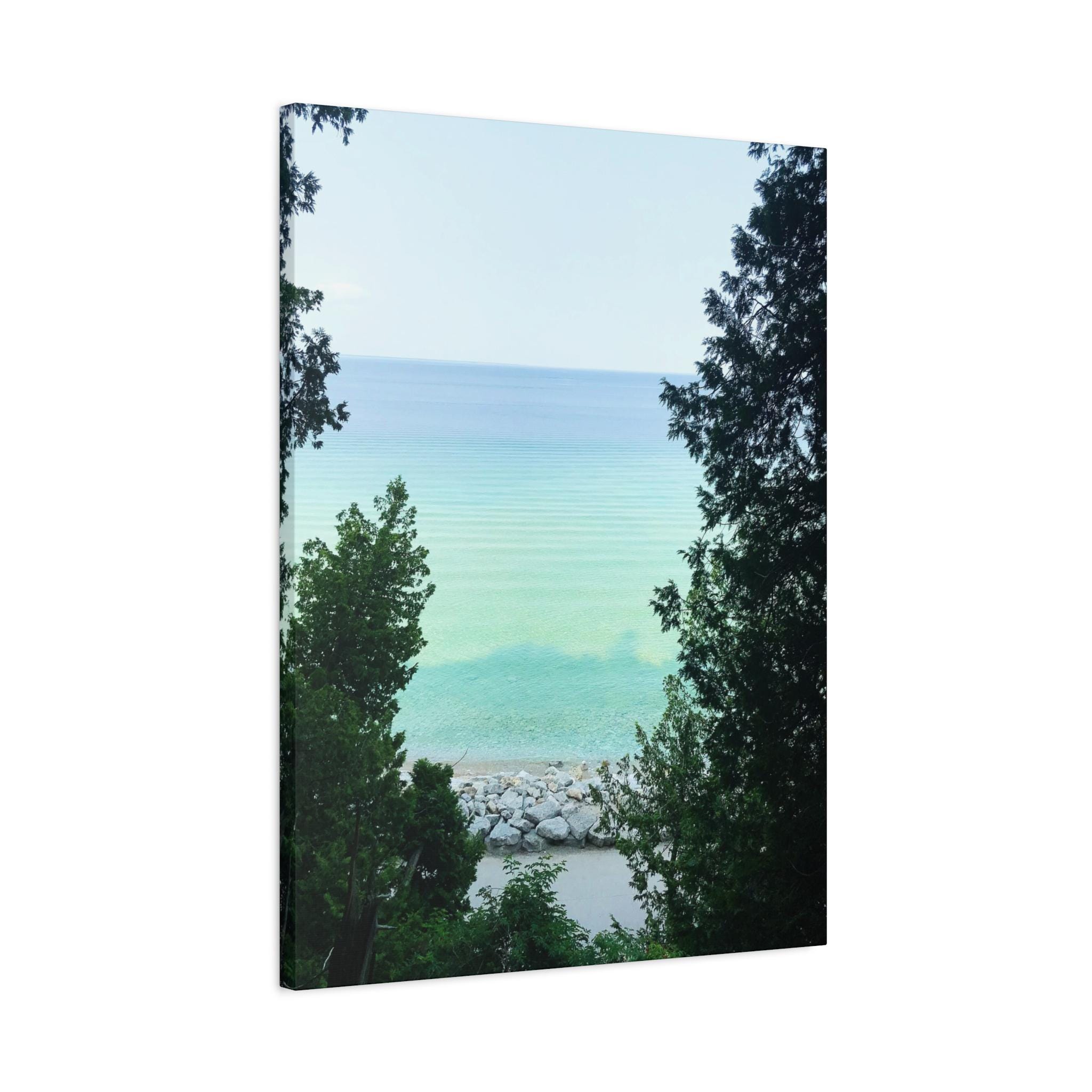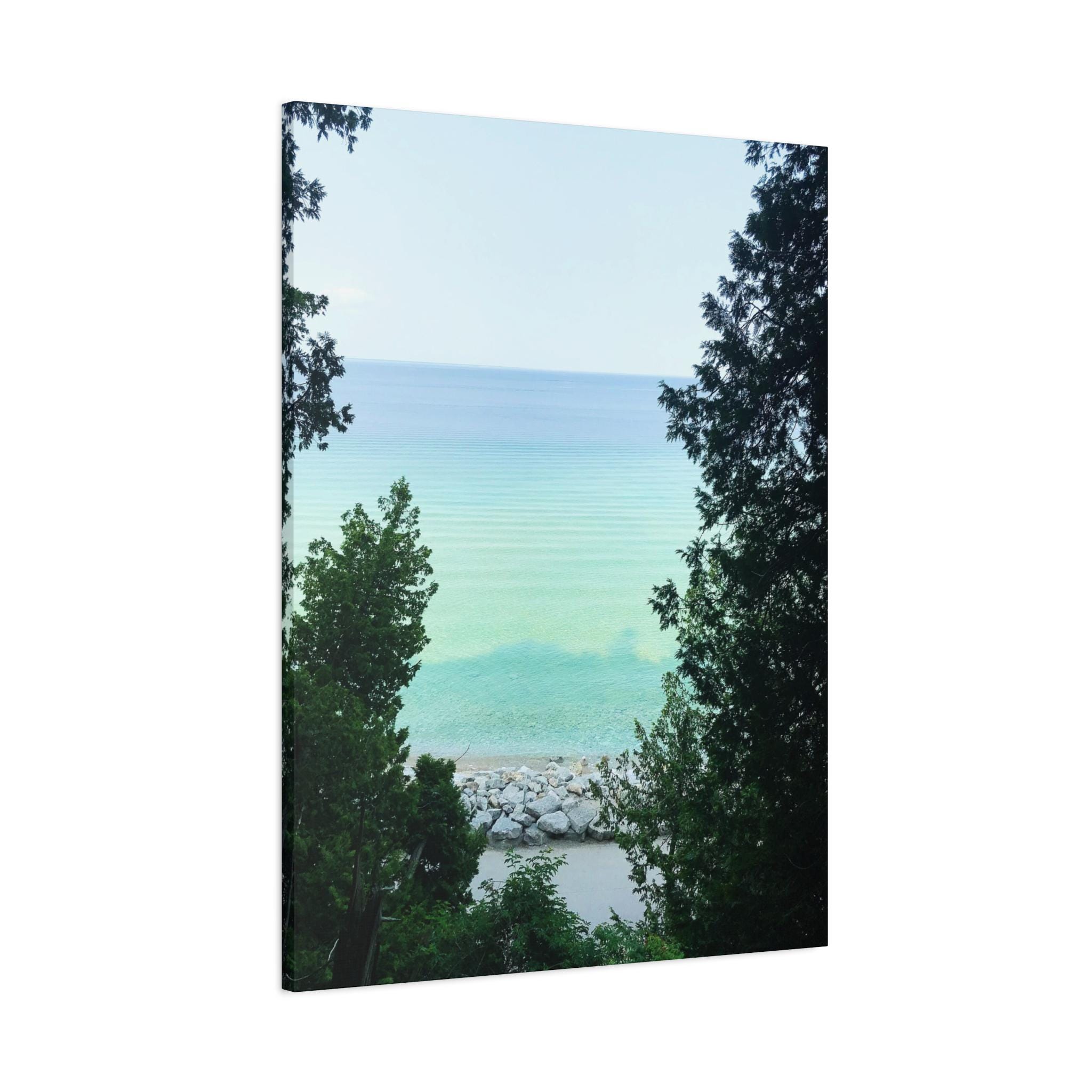 Bring the refreshing calm of the water into your home with this turquoise lake canvas wall art. Captured through a natural frame of lush green trees, the photo opens to reveal clear aqua water meeting the horizon. The layered shades of blue and green create a soothing, coastal atmosphere that instantly brightens any room.