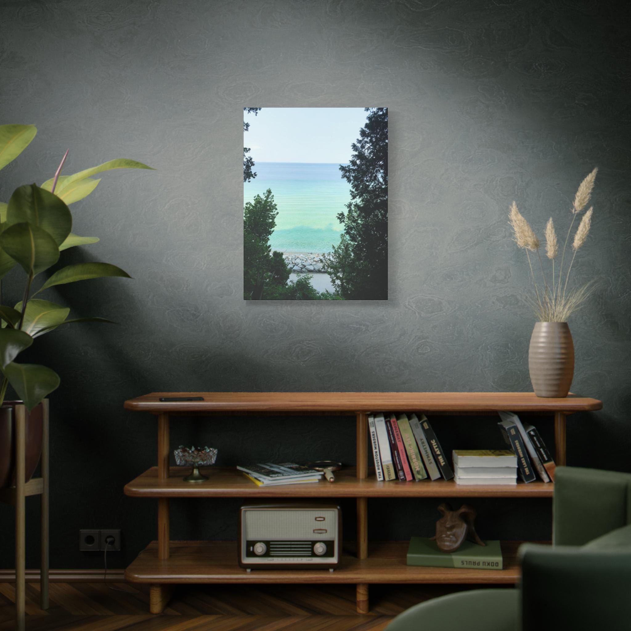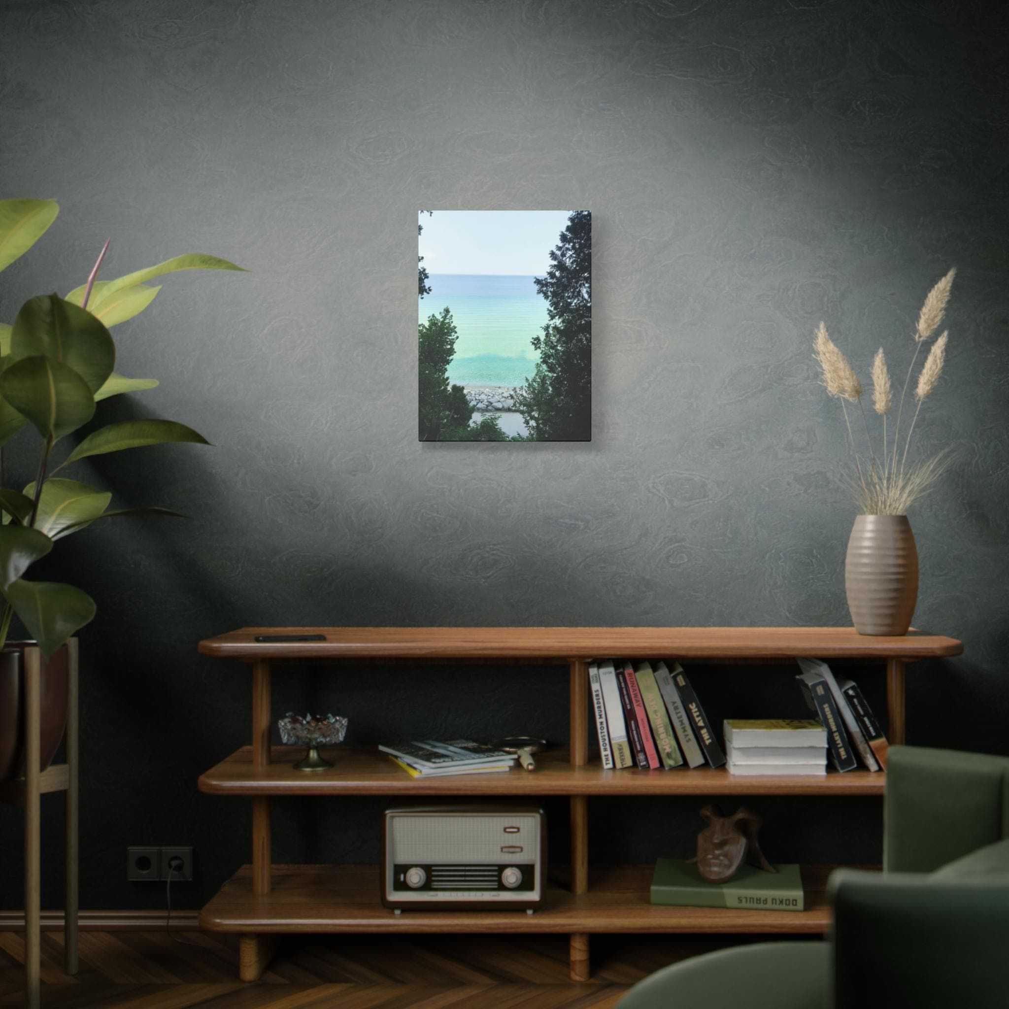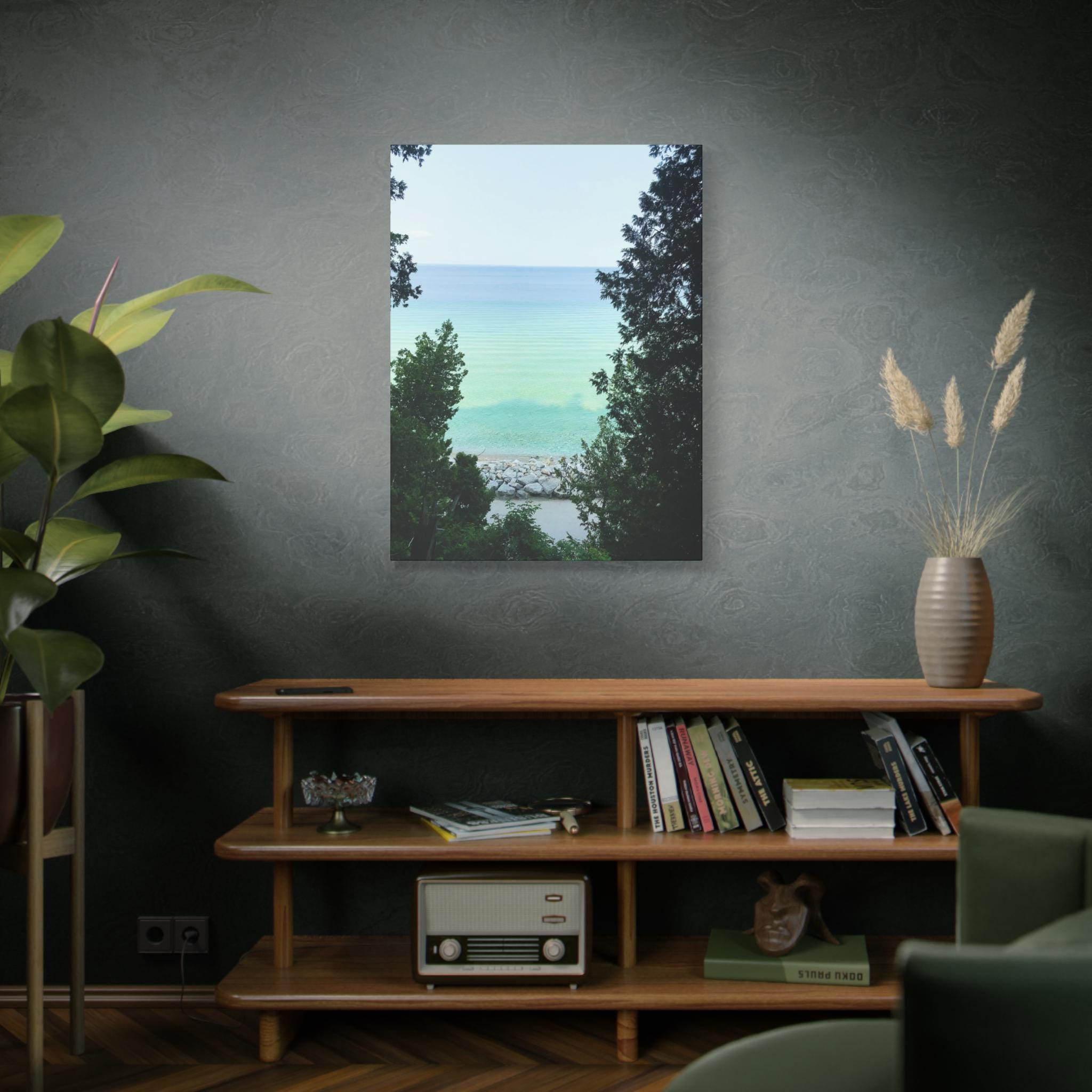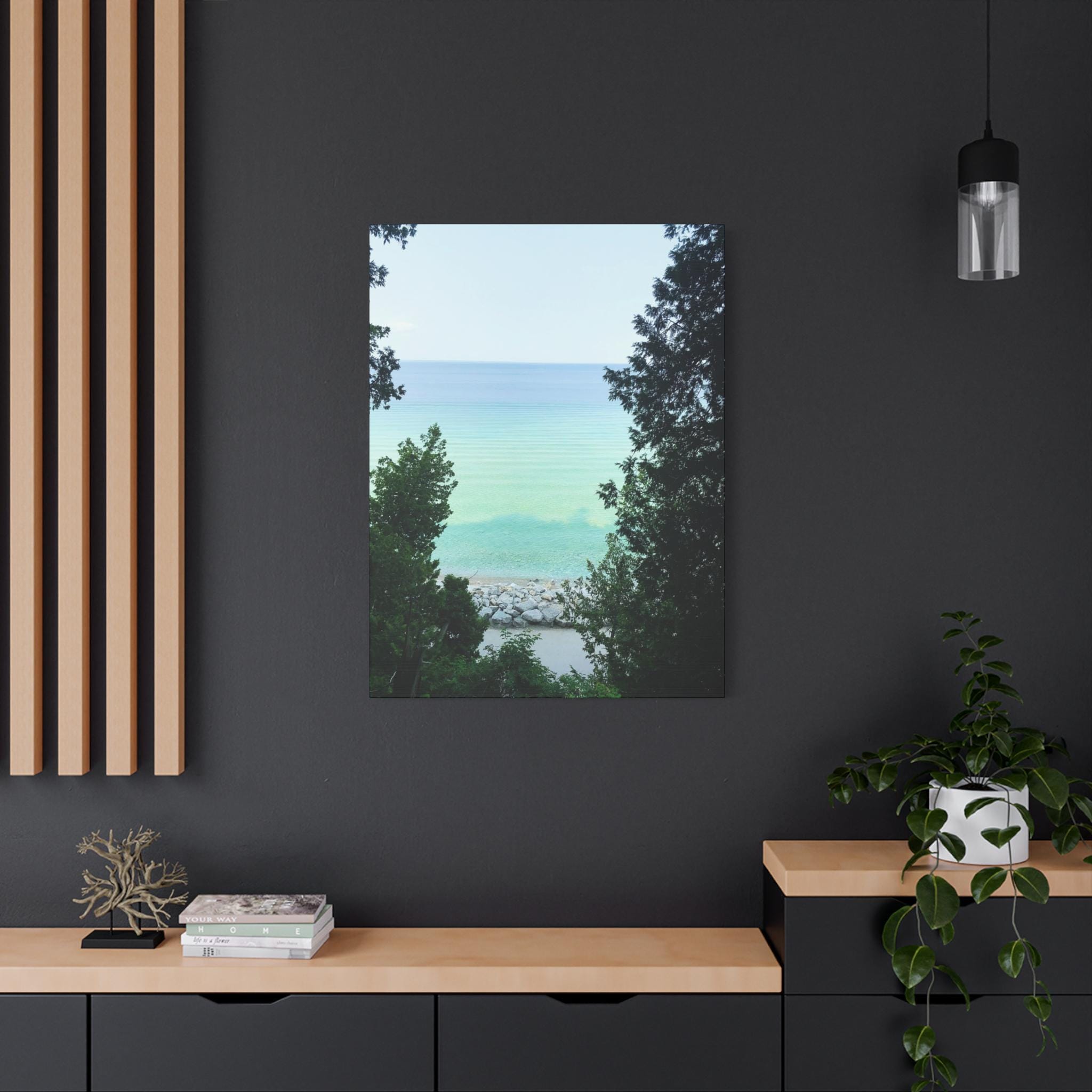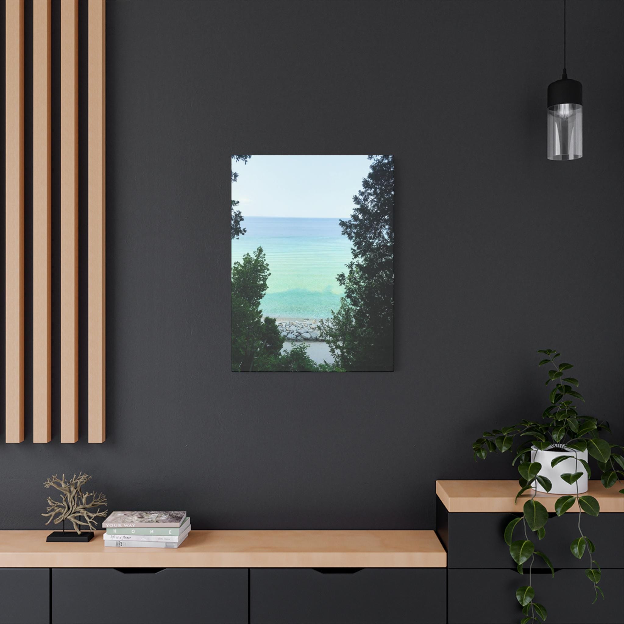Bring the refreshing calm of the water into your home with this turquoise lake canvas wall art. Captured through a natural frame of lush green trees, the photo opens to reveal clear aqua water meeting the horizon. The layered shades of blue and green create a soothing, coastal atmosphere that instantly brightens any room.