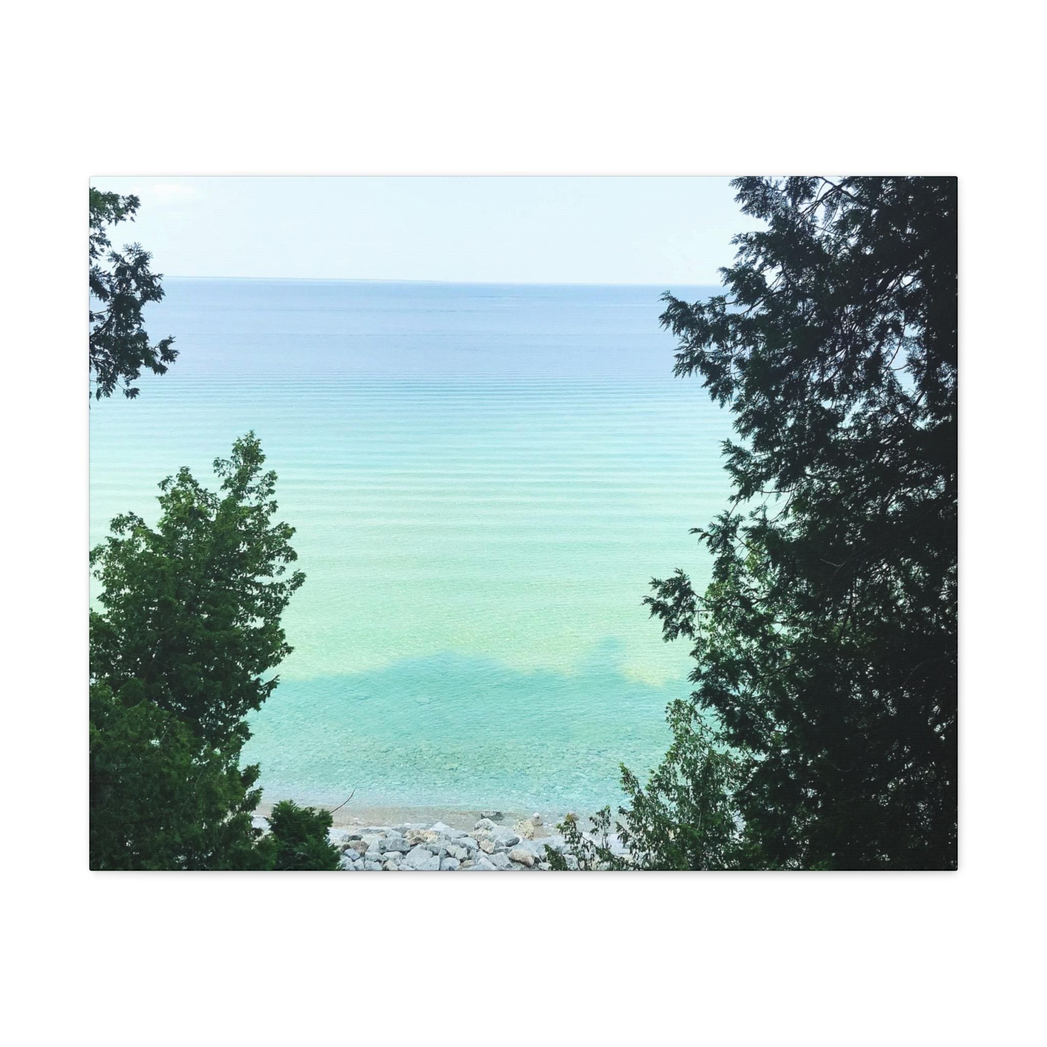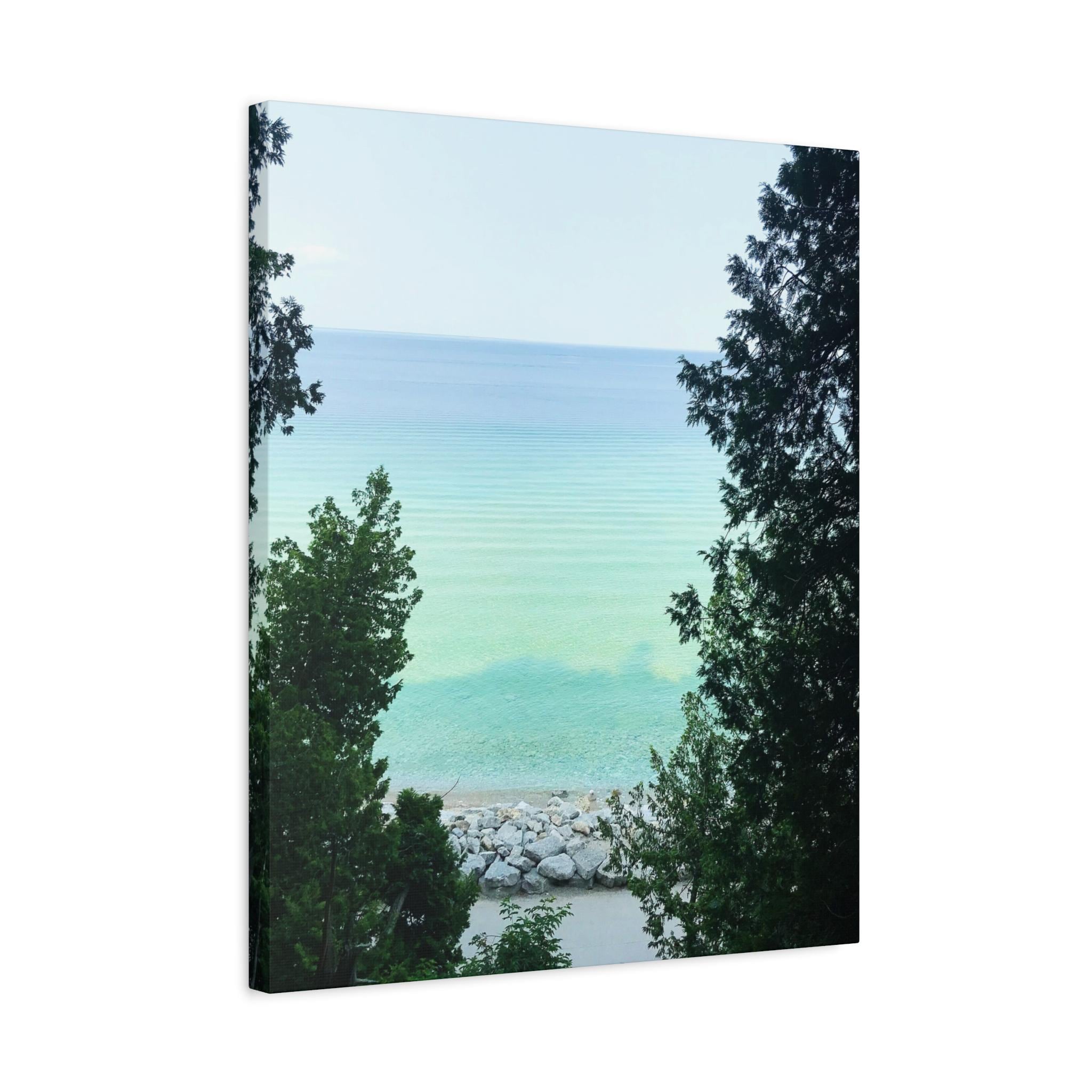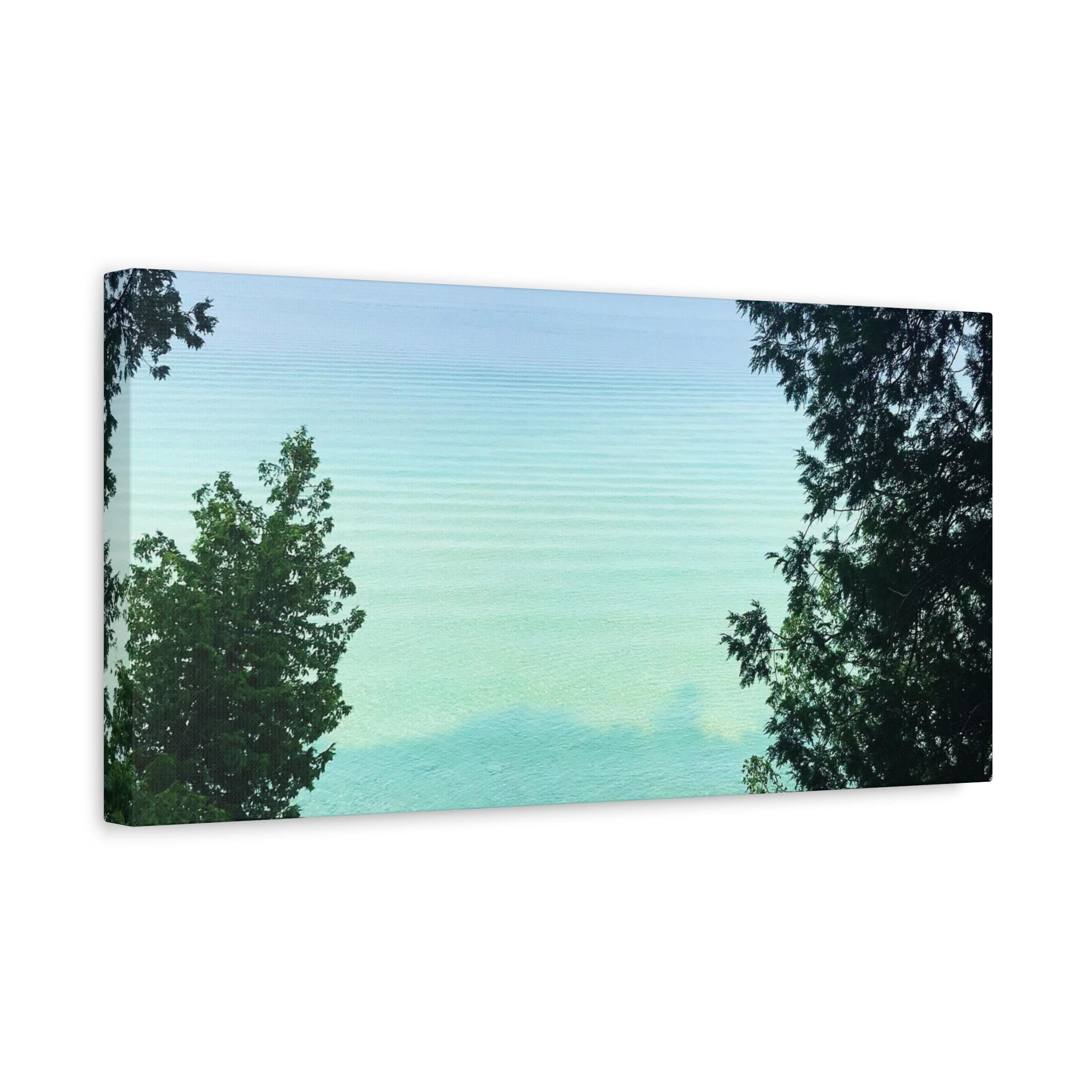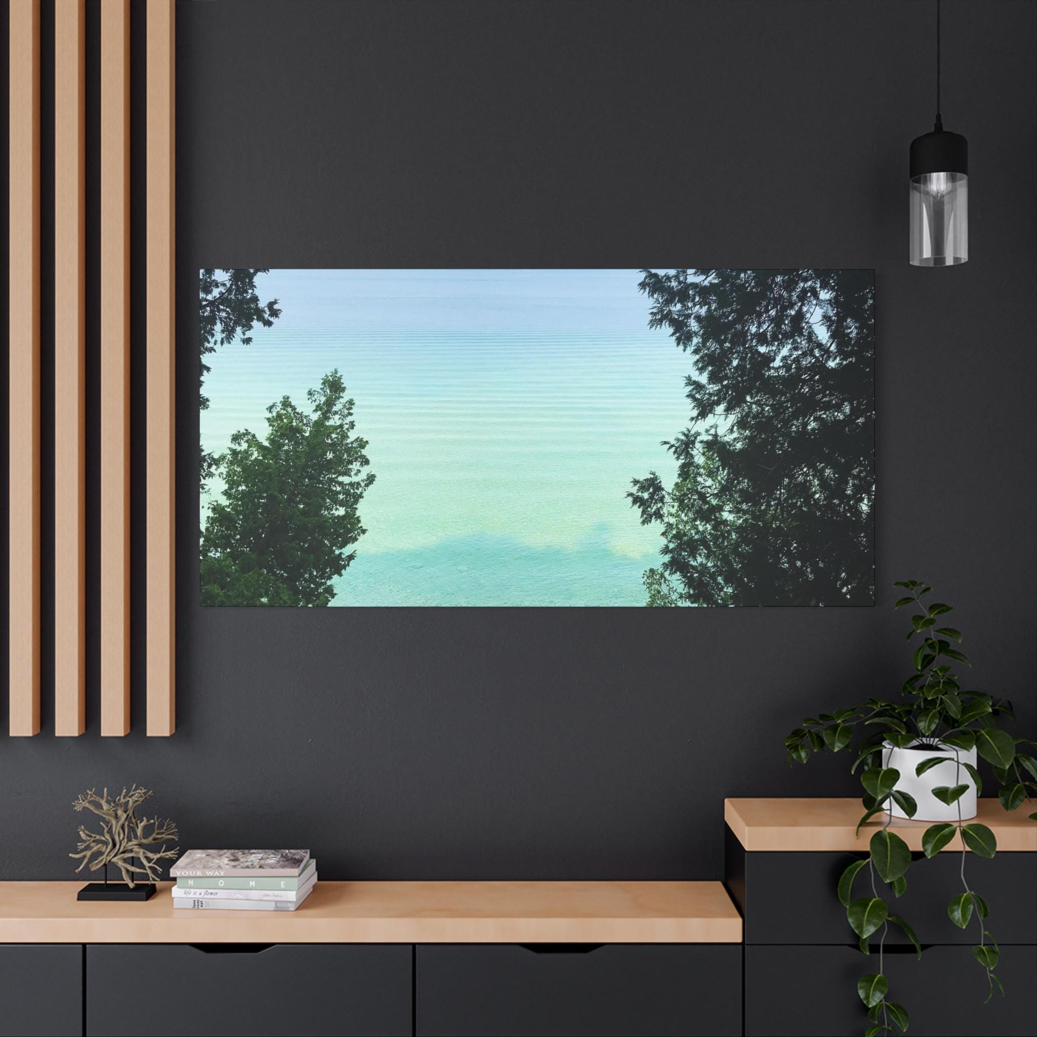 Bring the refreshing calm of the water into your home with this turquoise lake canvas wall art. Captured through a natural frame of lush green trees, the photo opens to reveal clear aqua water meeting the horizon. The layered shades of blue and green create a soothing, coastal atmosphere that instantly brightens any room.