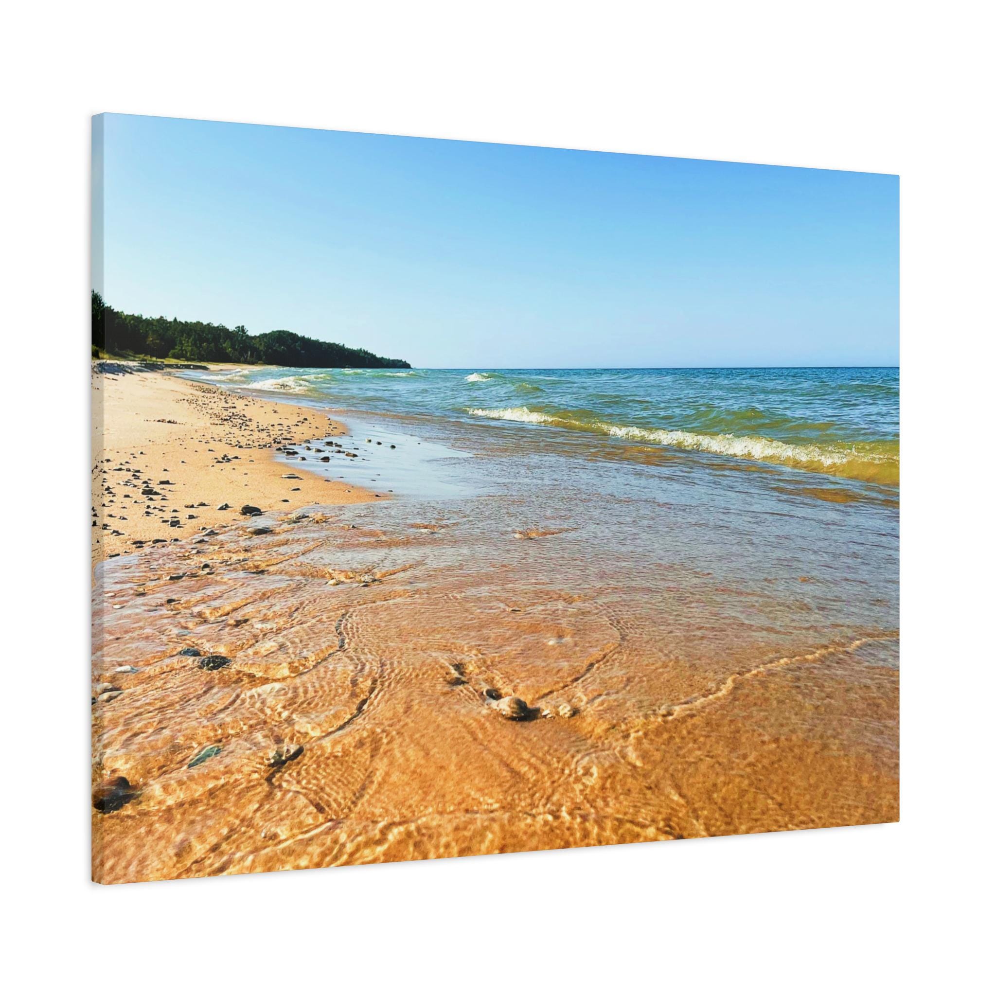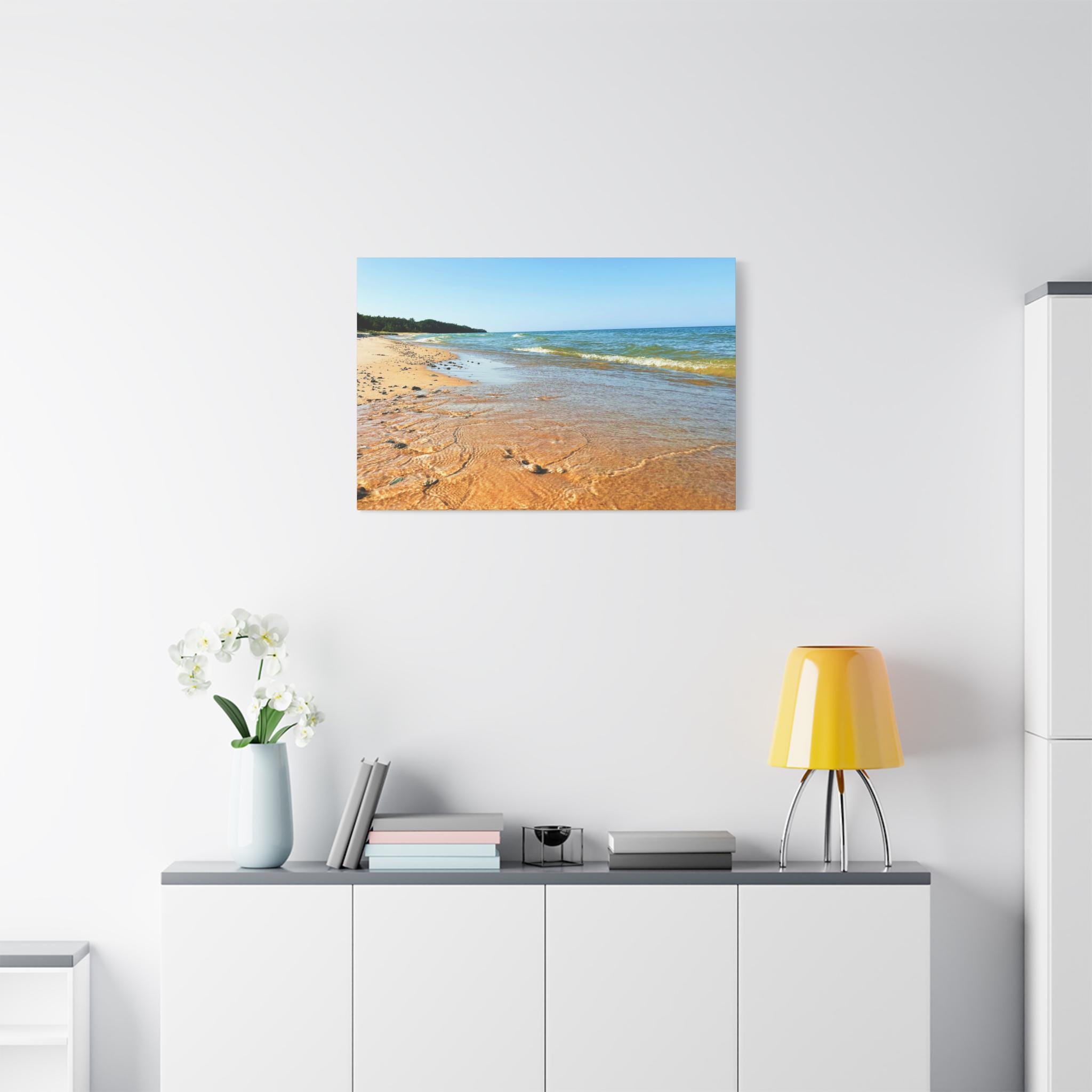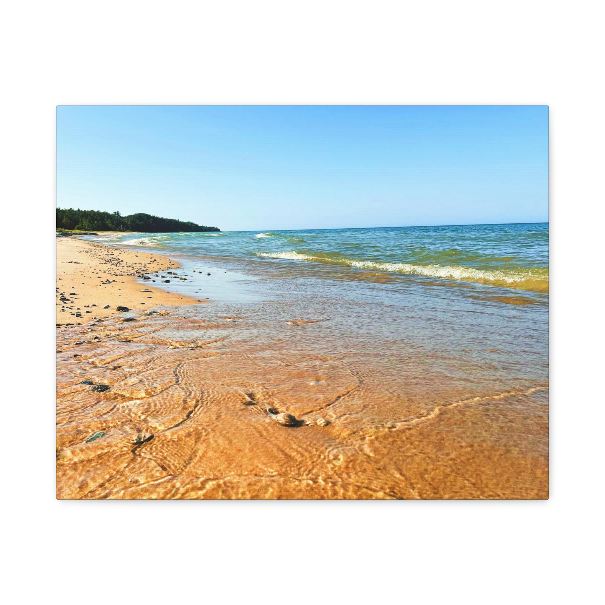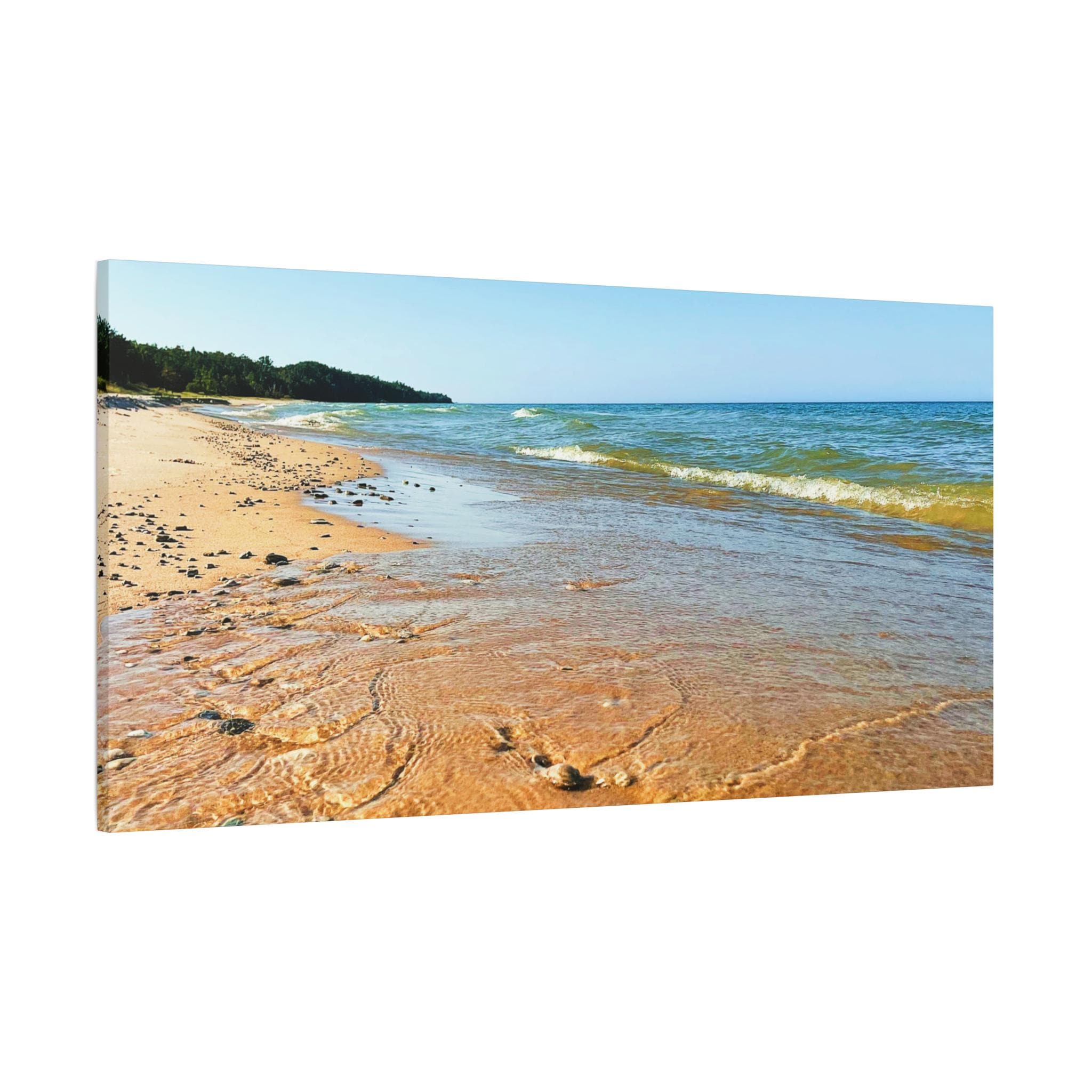 Bring the peaceful beauty of the coast into your home with this sandy beach canvas wall art. Captured on a clear, sunny day, the golden shoreline glows under bright blue skies while soft waves ripple along the coast. Perfect for anyone who loves the beach, this artwork adds warmth, light, and serenity to any space.