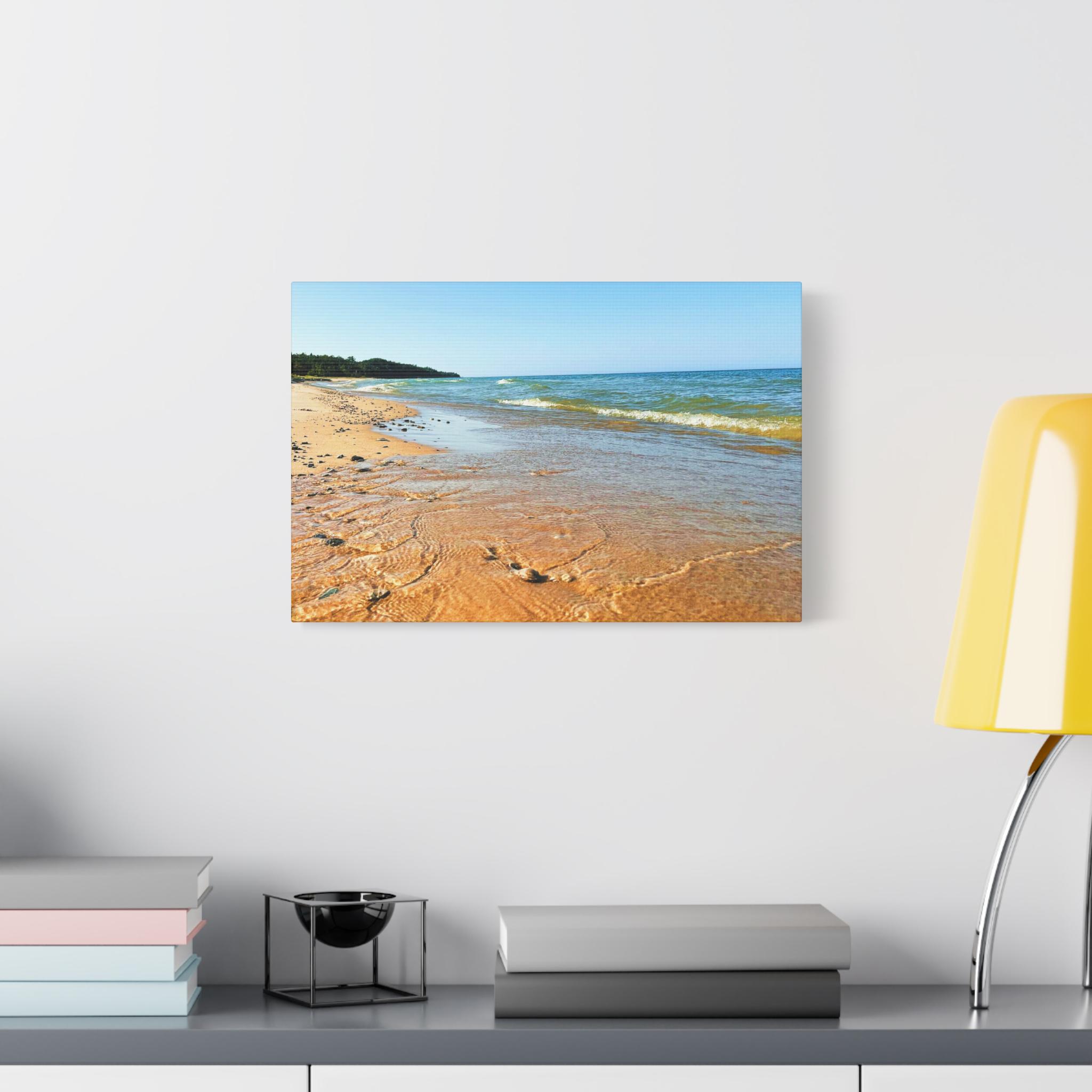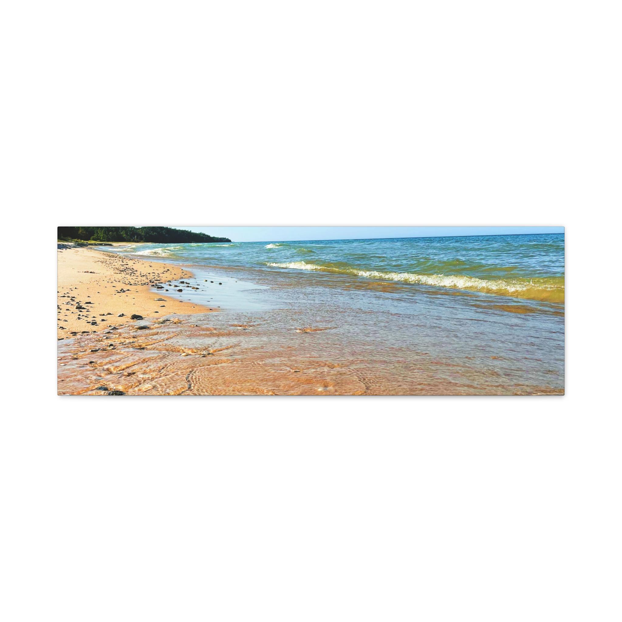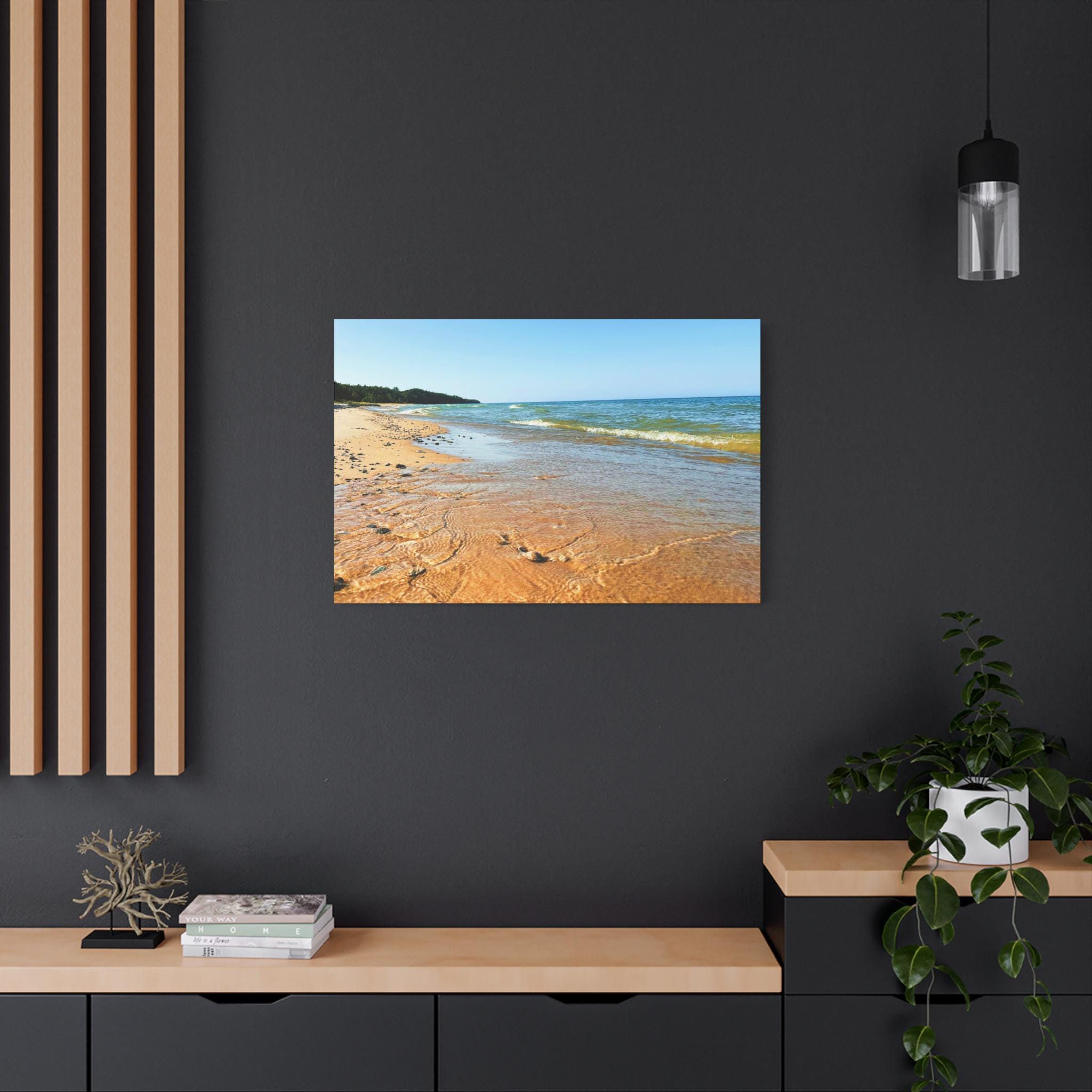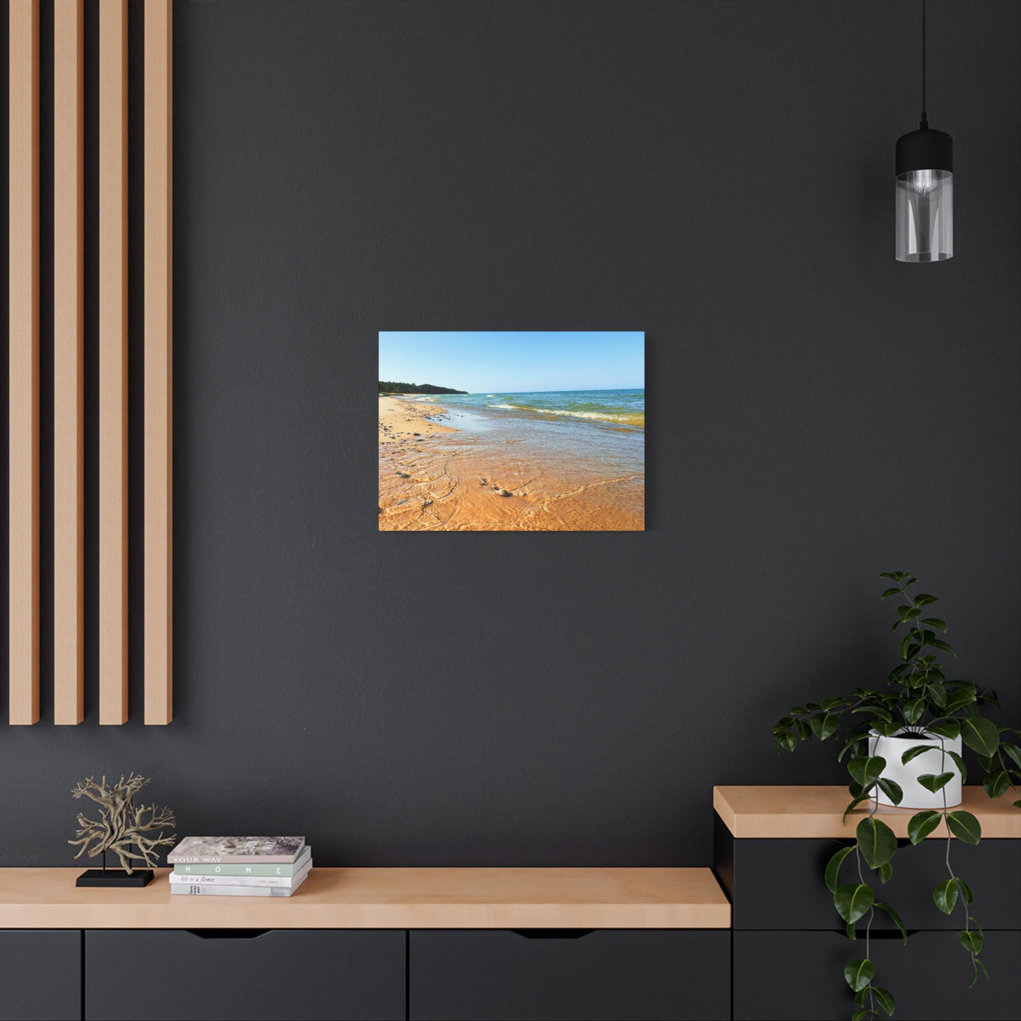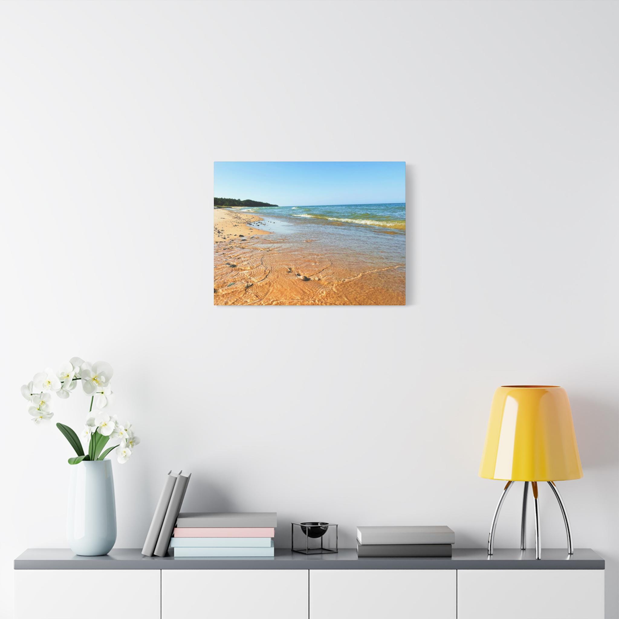 Bring the peaceful beauty of the coast into your home with this sandy beach canvas wall art. Captured on a clear, sunny day, the golden shoreline glows under bright blue skies while soft waves ripple along the coast. Perfect for anyone who loves the beach, this artwork adds warmth, light, and serenity to any space.