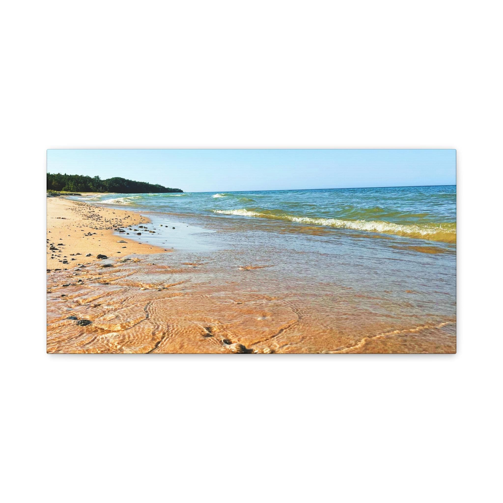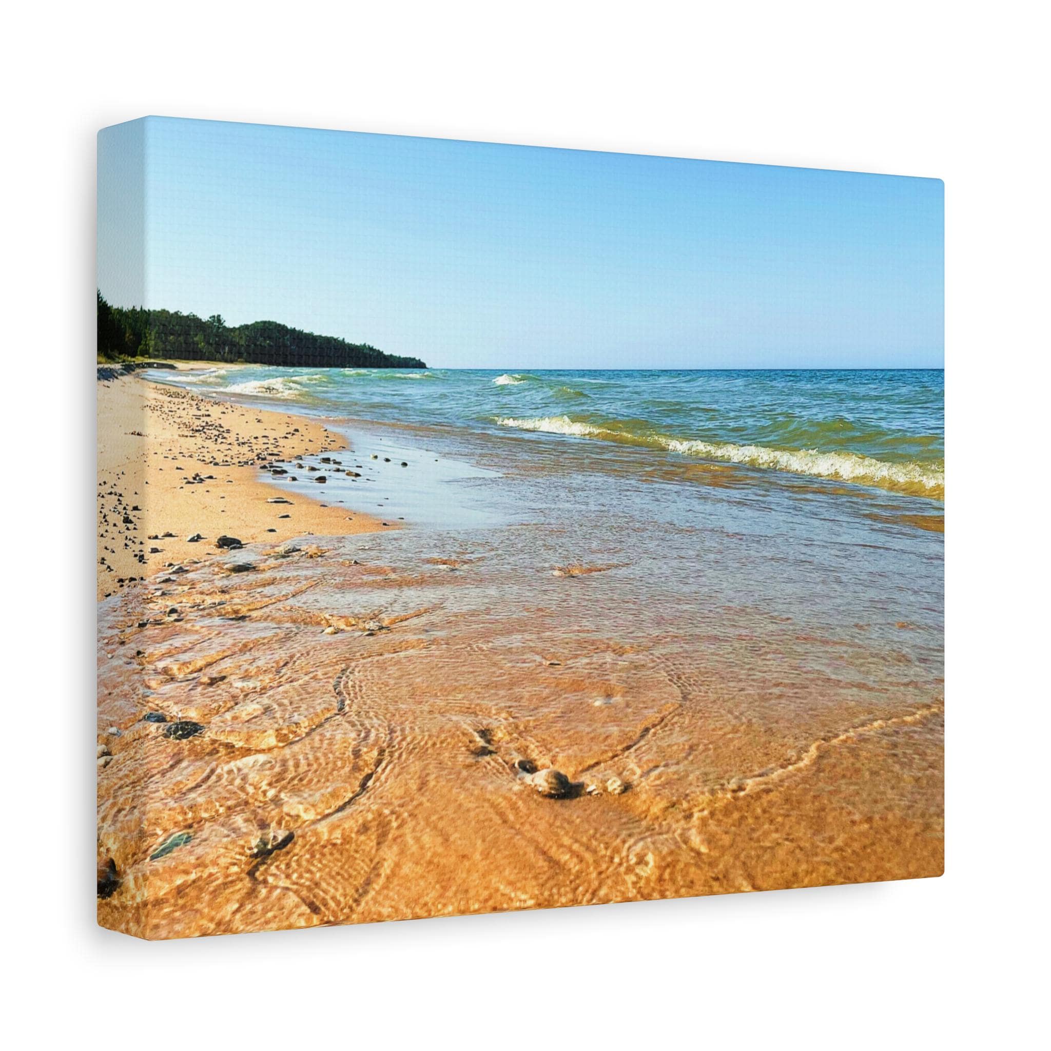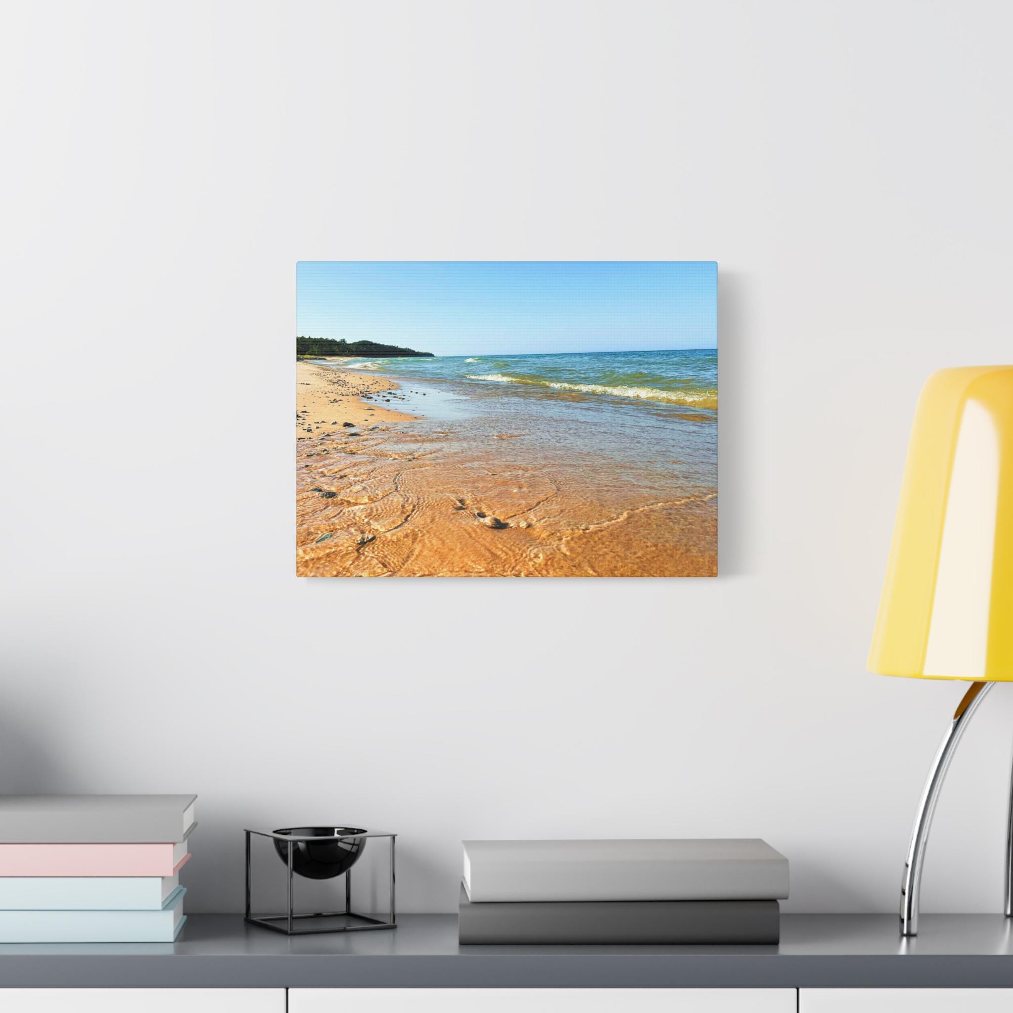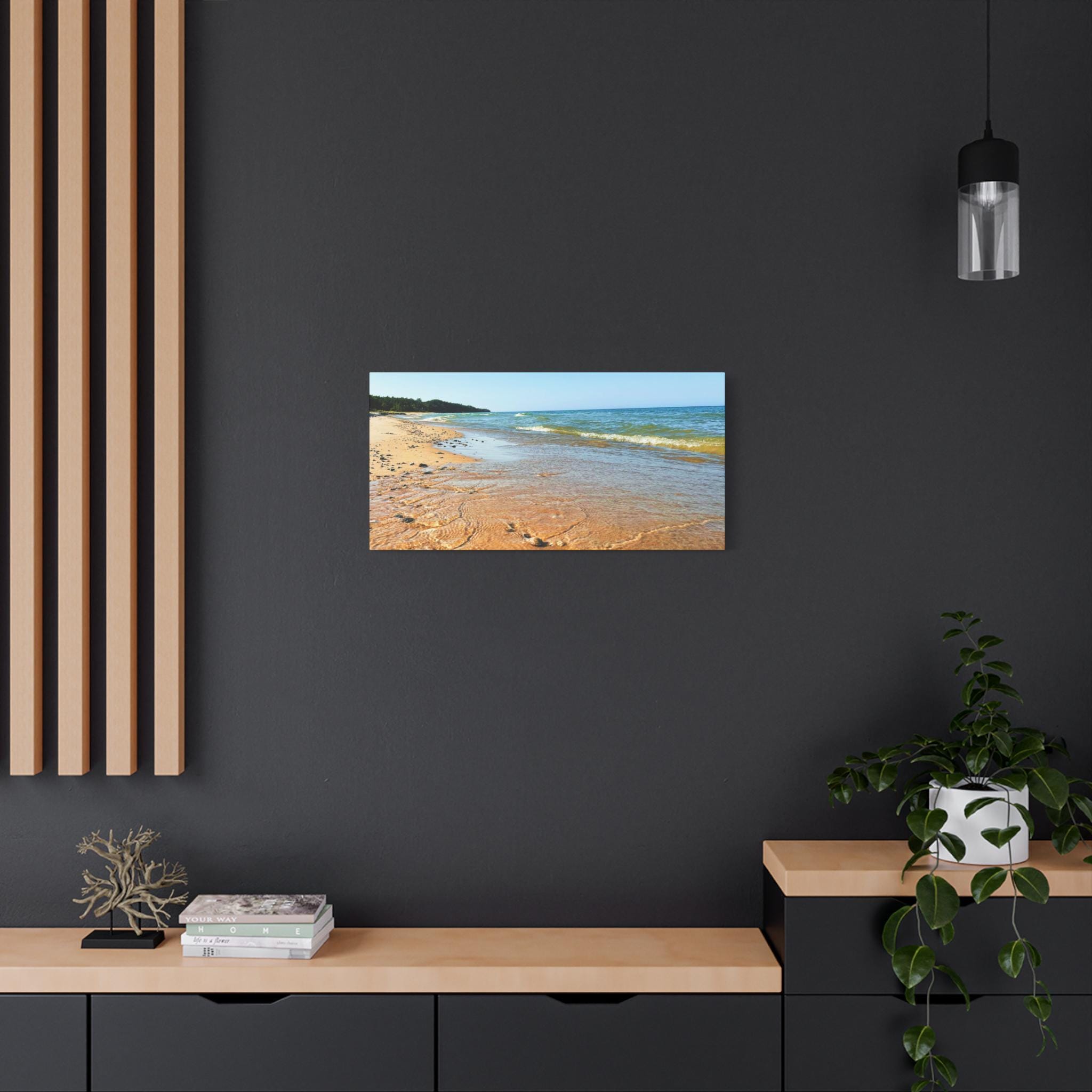 Bring the peaceful beauty of the coast into your home with this sandy beach canvas wall art. Captured on a clear, sunny day, the golden shoreline glows under bright blue skies while soft waves ripple along the coast. Perfect for anyone who loves the beach, this artwork adds warmth, light, and serenity to any space.
