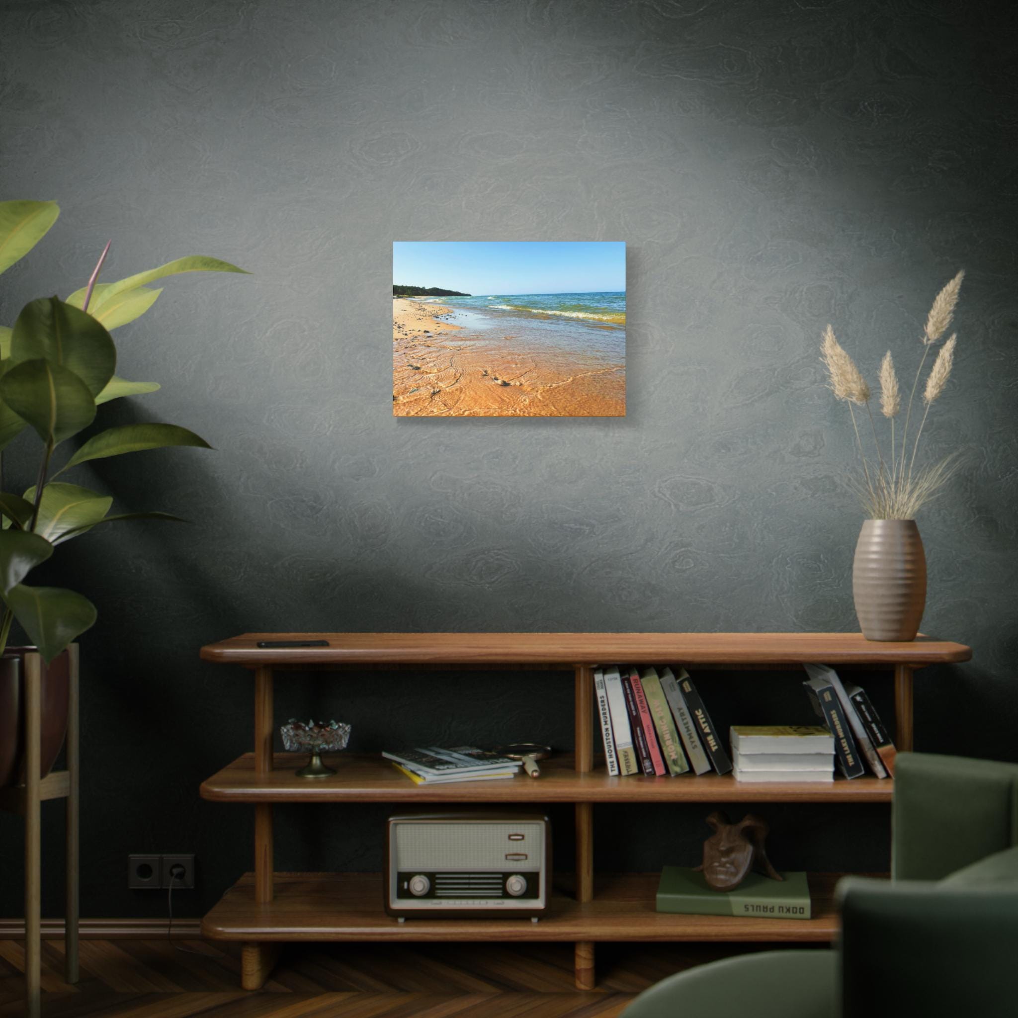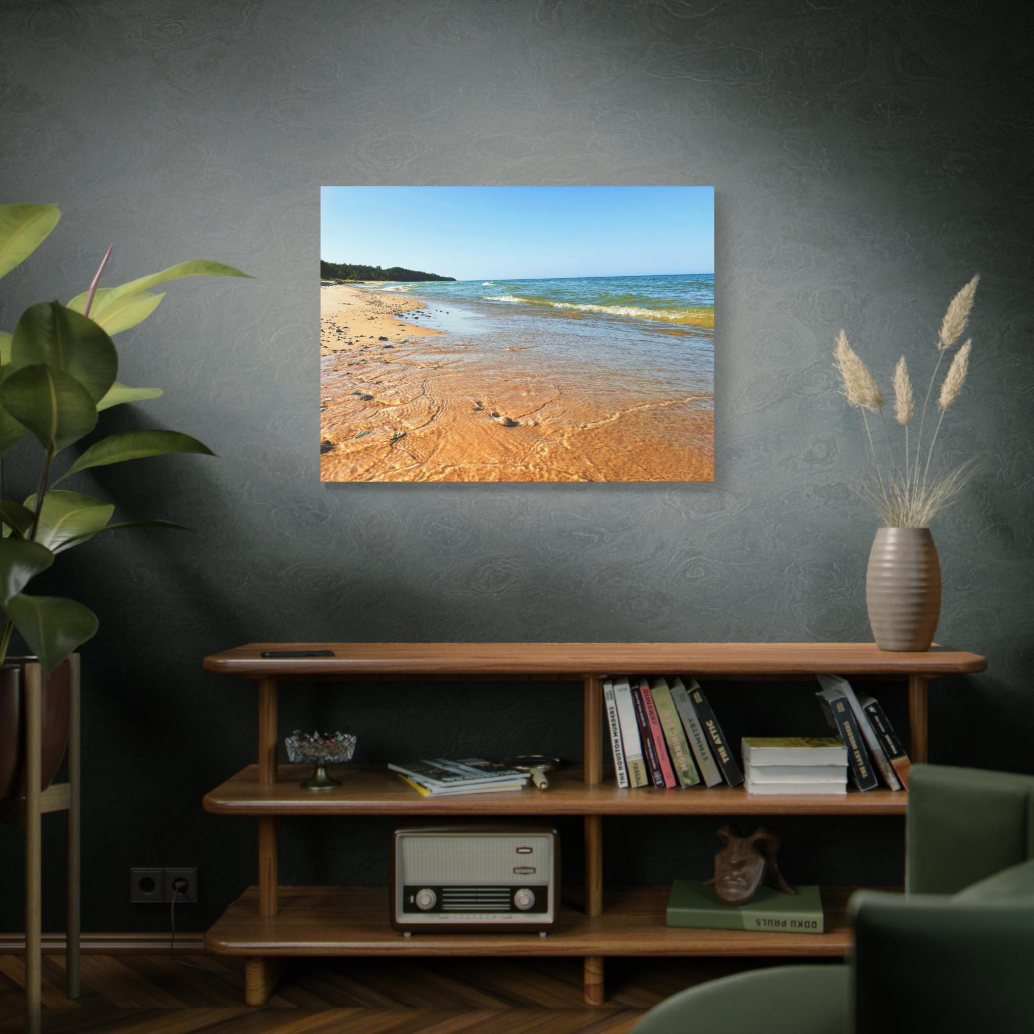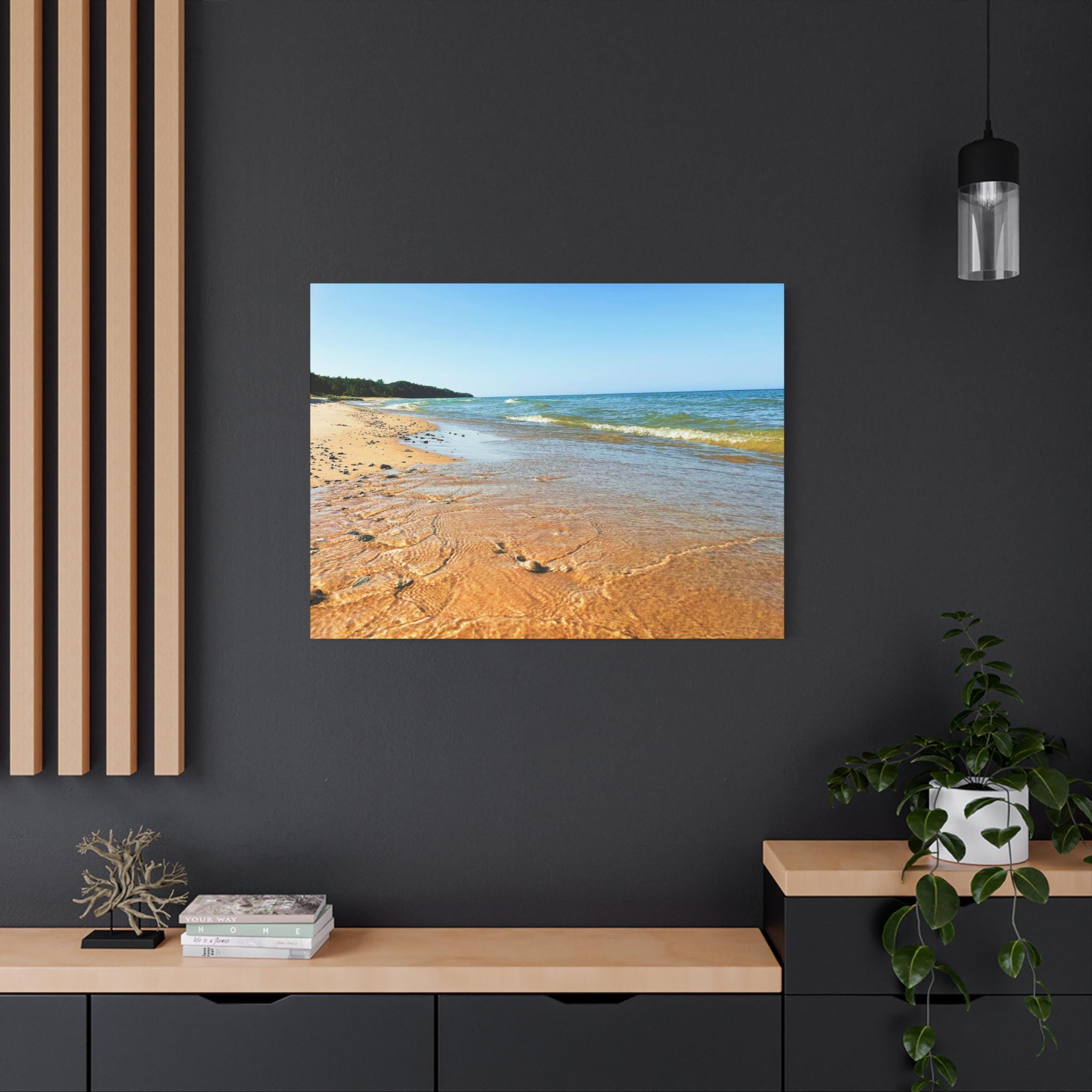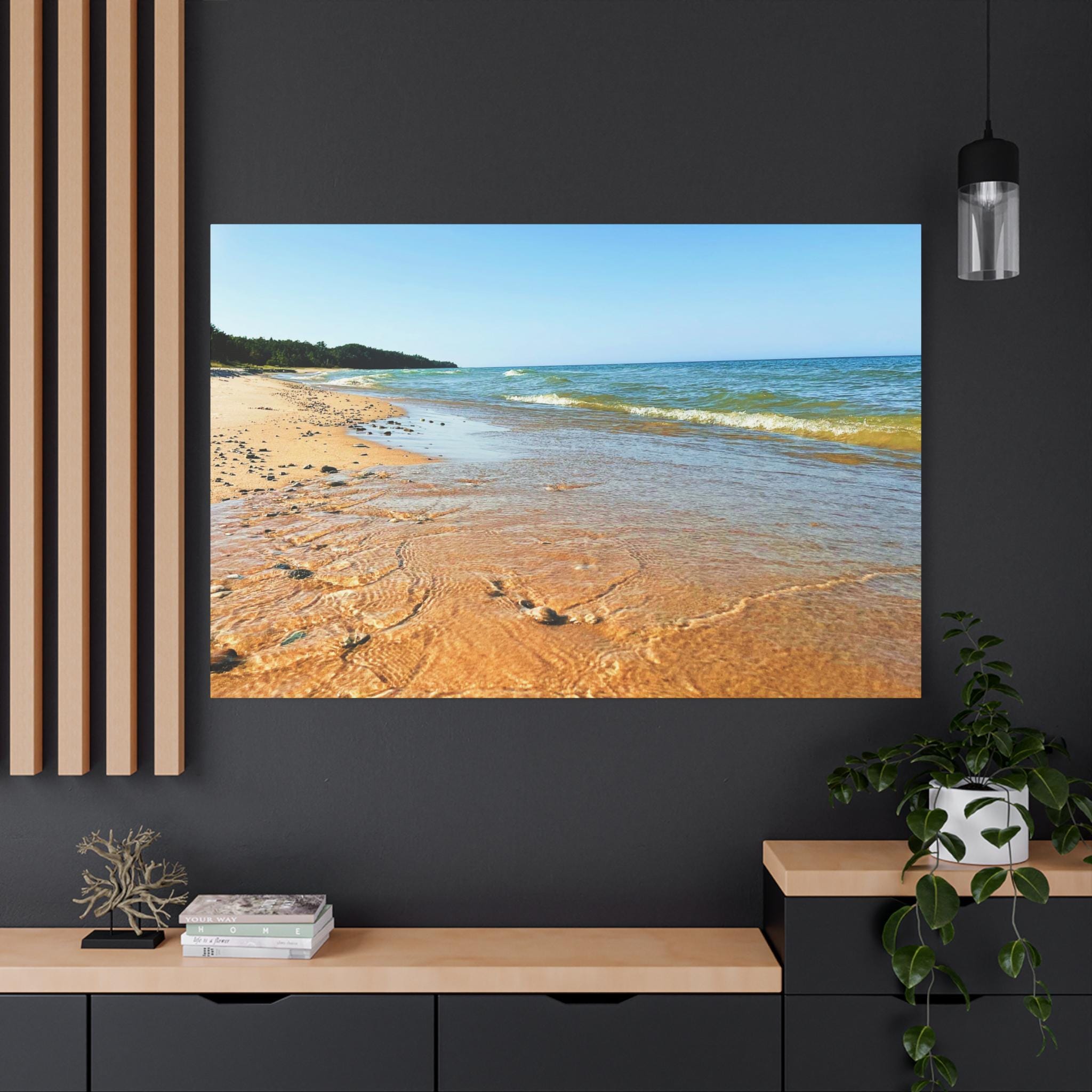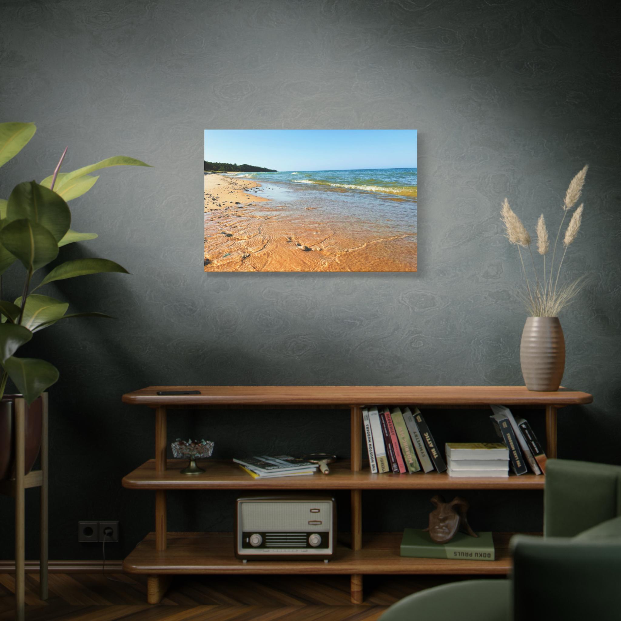 Bring the peaceful beauty of the coast into your home with this sandy beach canvas wall art. Captured on a clear, sunny day, the golden shoreline glows under bright blue skies while soft waves ripple along the coast. Perfect for anyone who loves the beach, this artwork adds warmth, light, and serenity to any space.