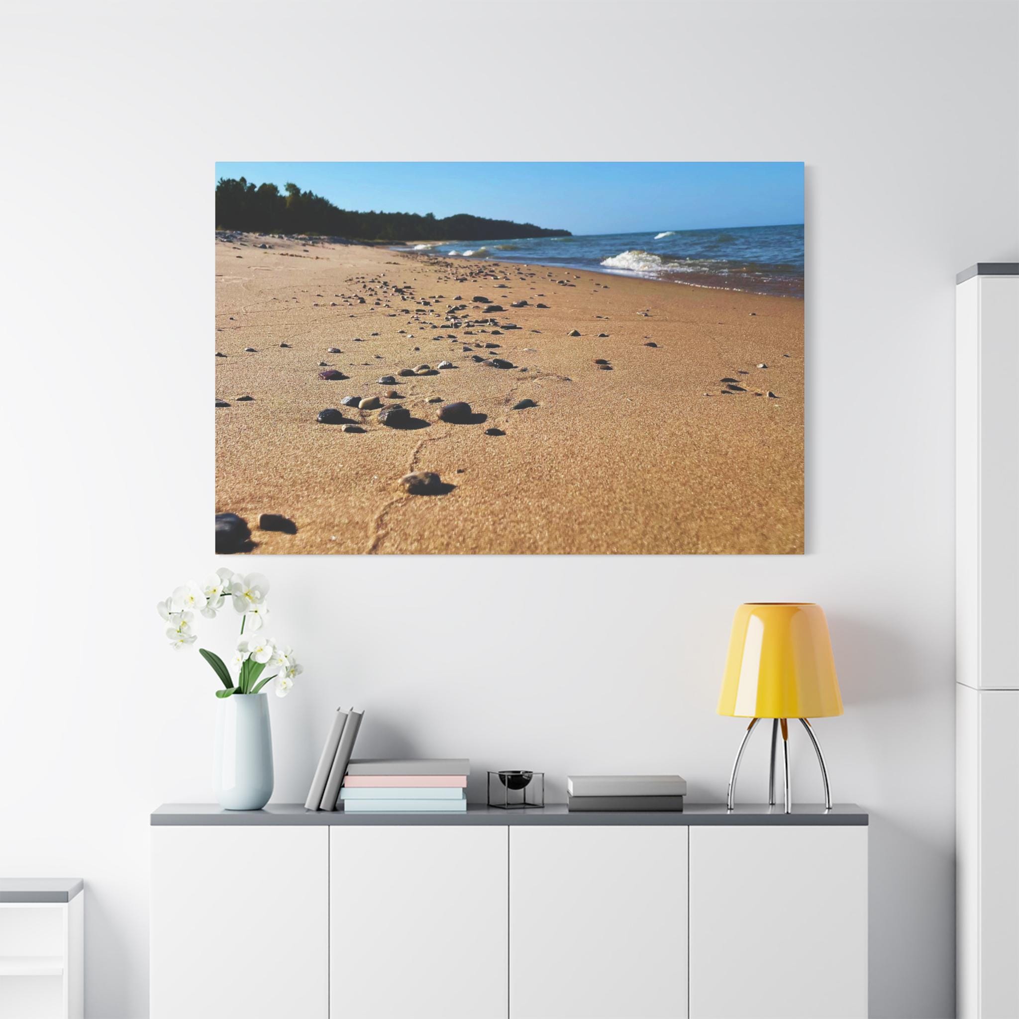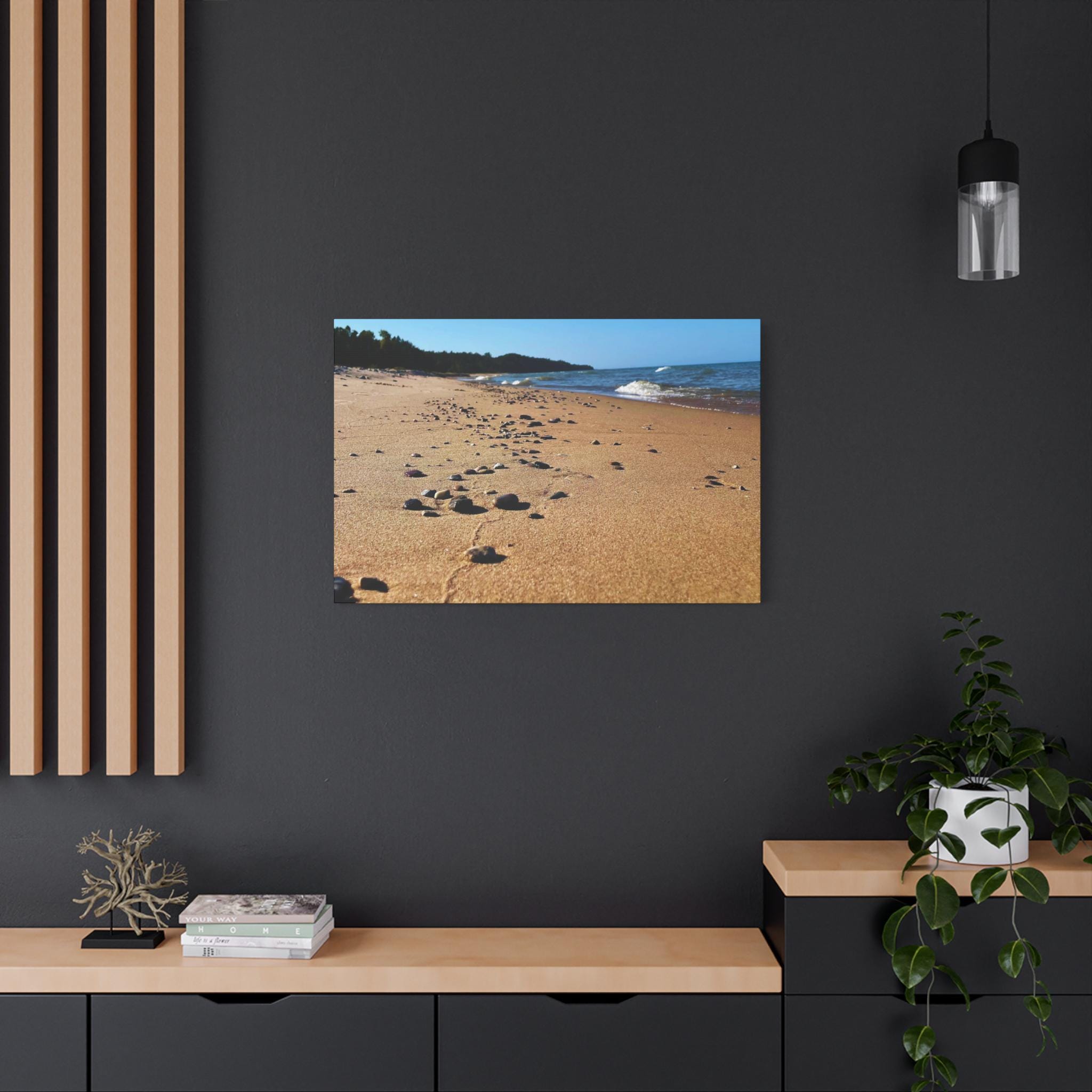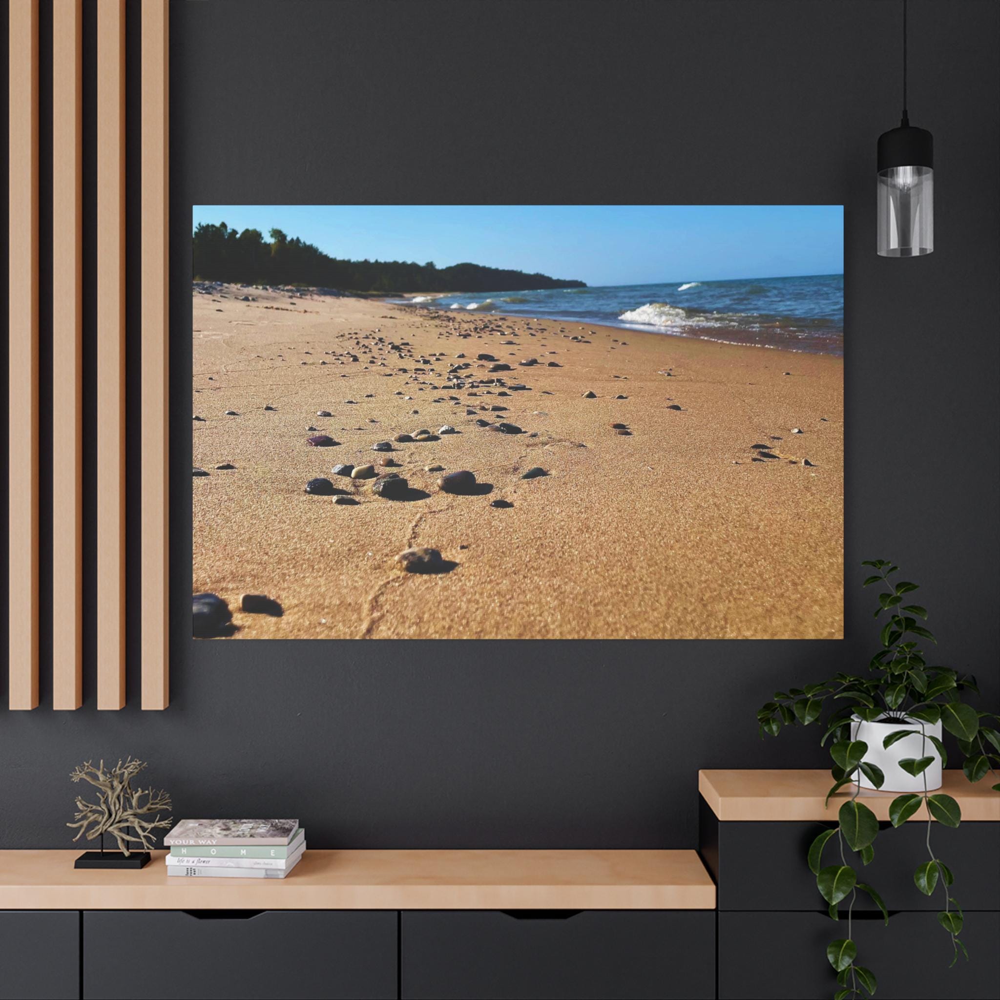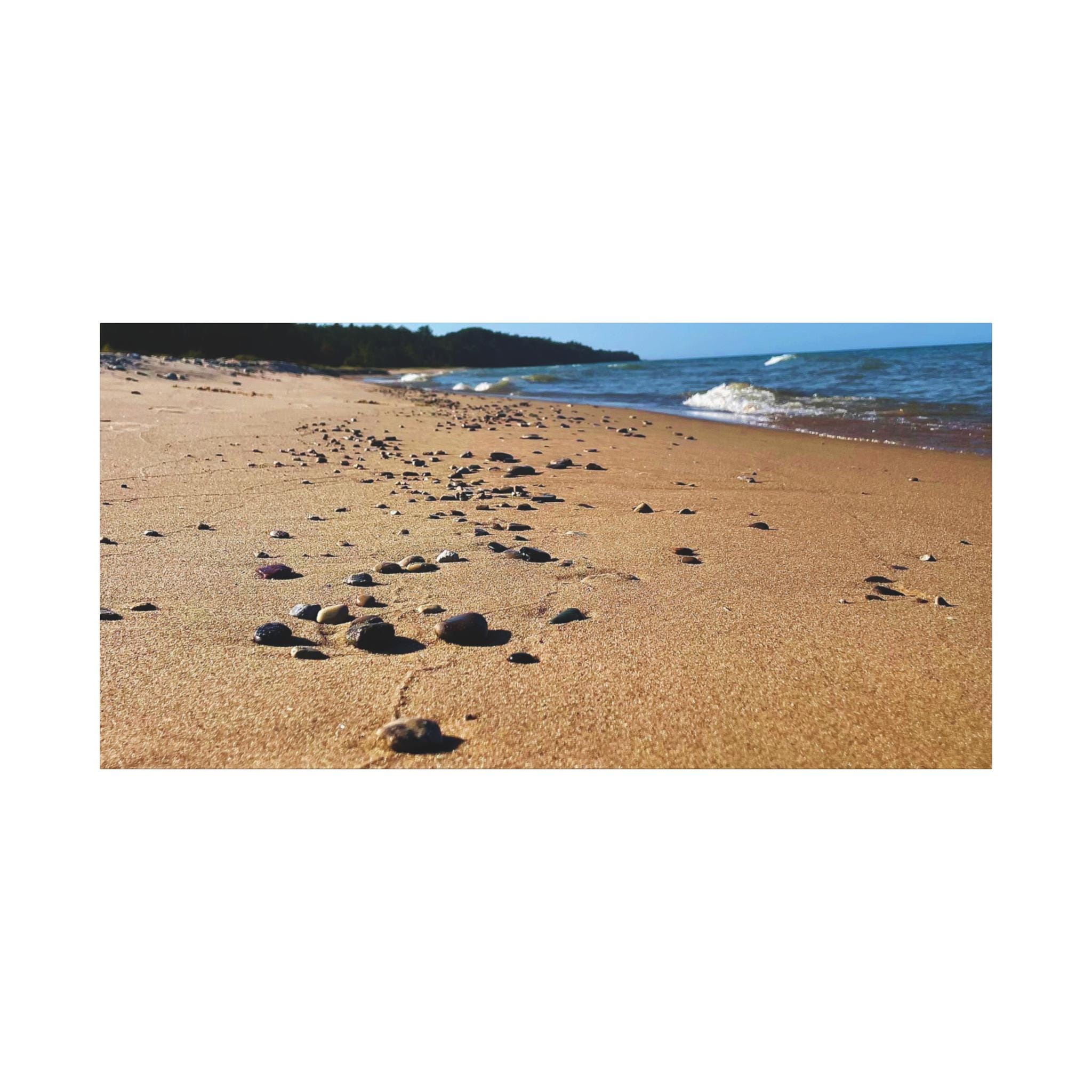 Bring the calming vibes of a sandy beach with rocks and waves into your space with this zen-like canvas print. Perfect for those looking to add a touch of tranquility to their home or office. Ideal for nature lovers, beach enthusiasts, and those seeking a peaceful atmosphere. Great for decorating homes, offices, beach houses, and meditation spaces. Perfect for coastal decor, summer holidays, and relaxation spaces.