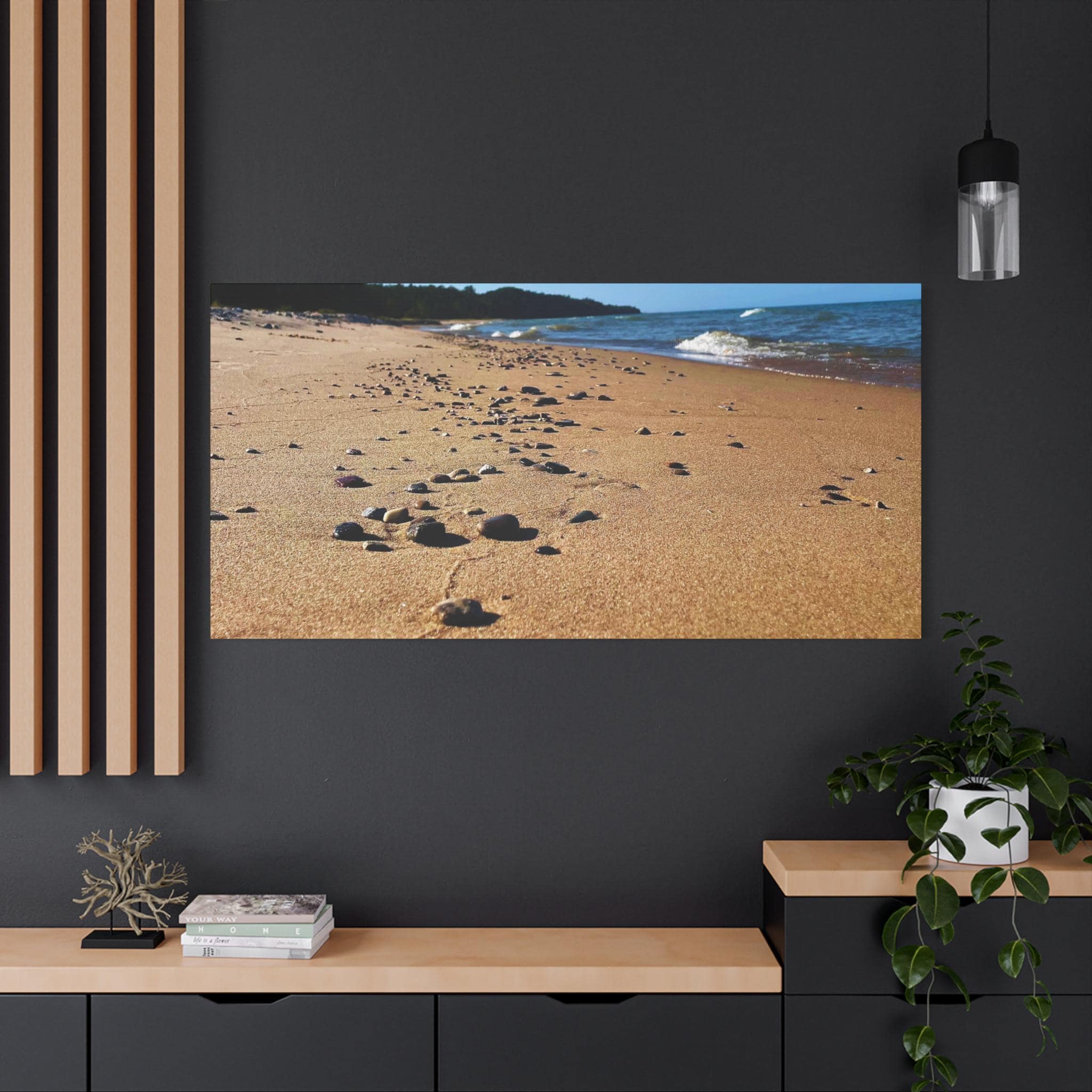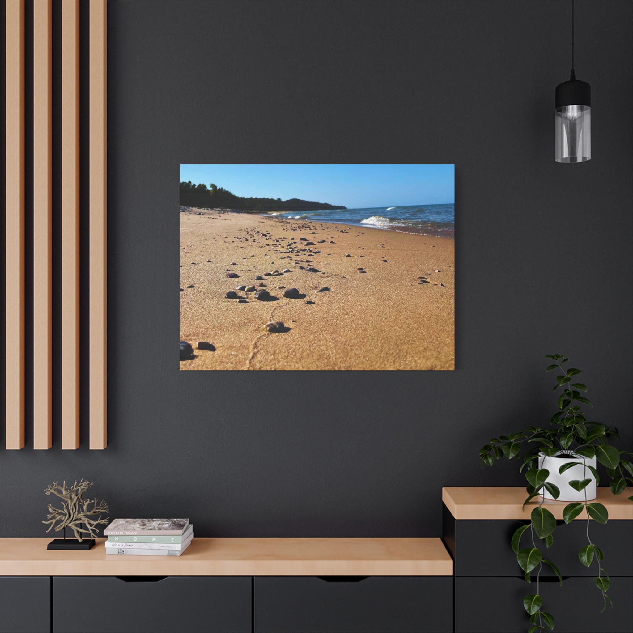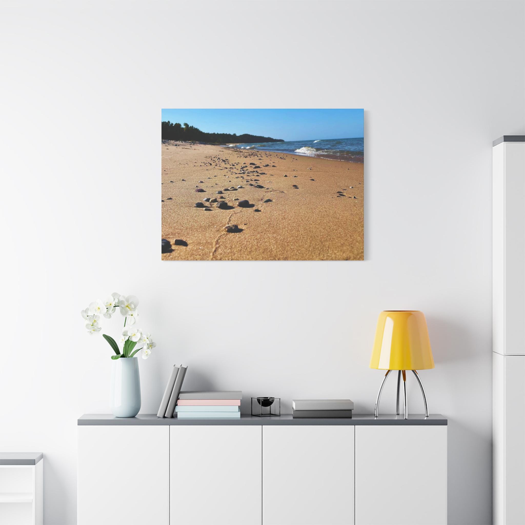 Bring the calming vibes of a sandy beach with rocks and waves into your space with this zen-like canvas print. Perfect for those looking to add a touch of tranquility to their home or office. Ideal for nature lovers, beach enthusiasts, and those seeking a peaceful atmosphere. Great for decorating homes, offices, beach houses, and meditation spaces. Perfect for coastal decor, summer holidays, and relaxation spaces.