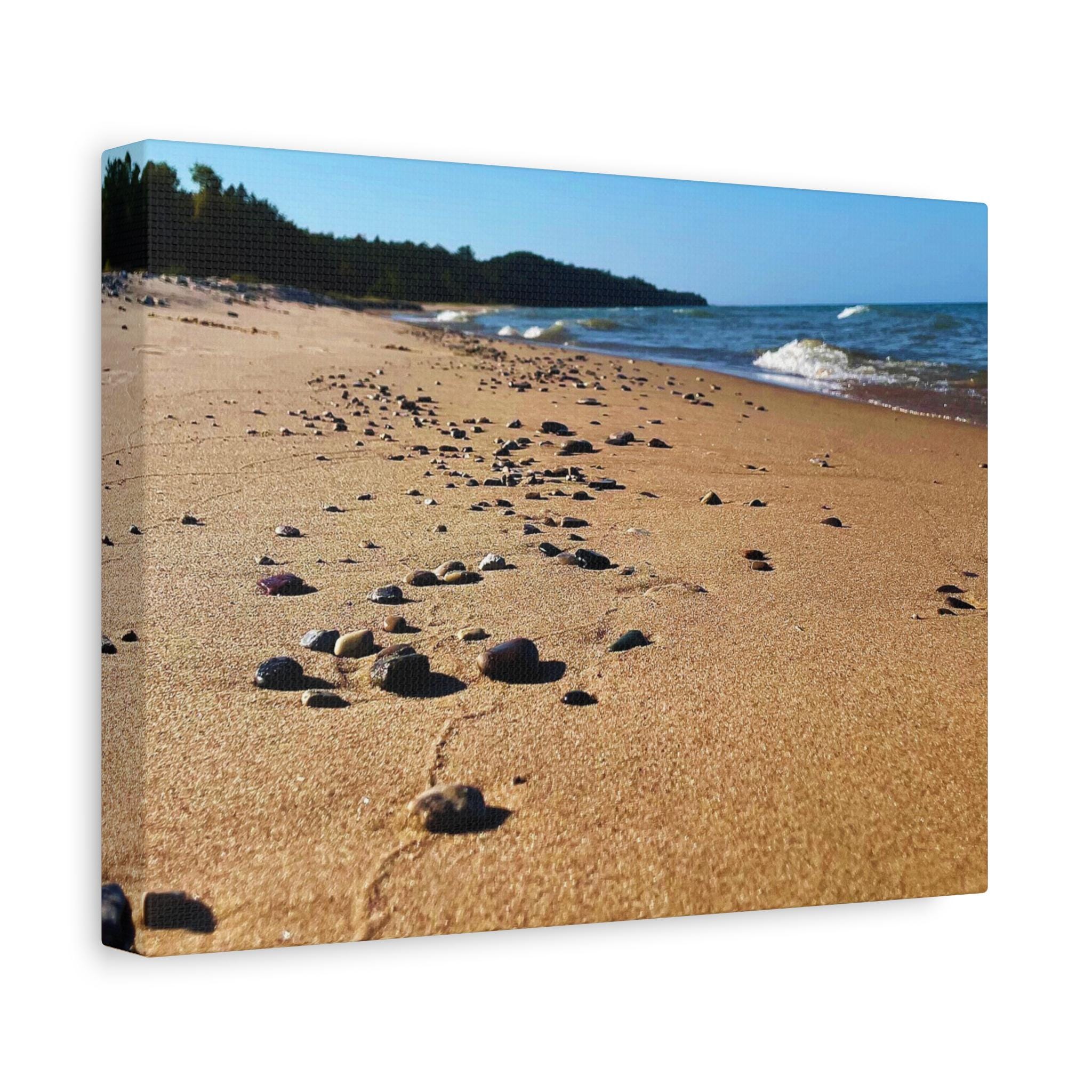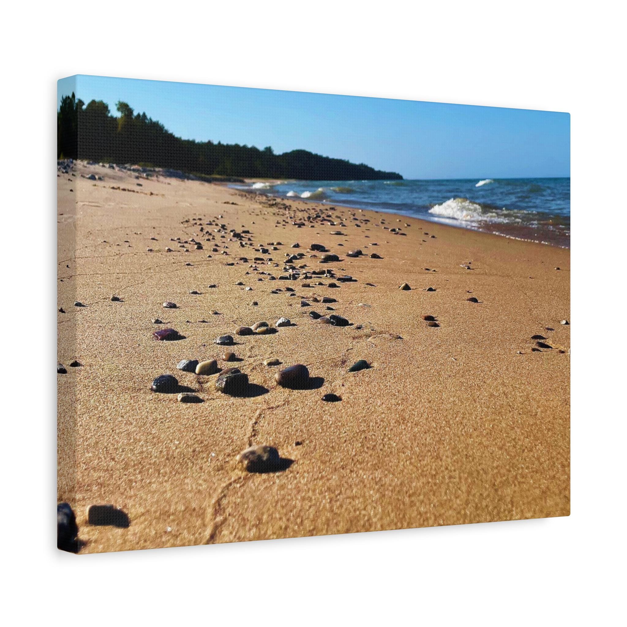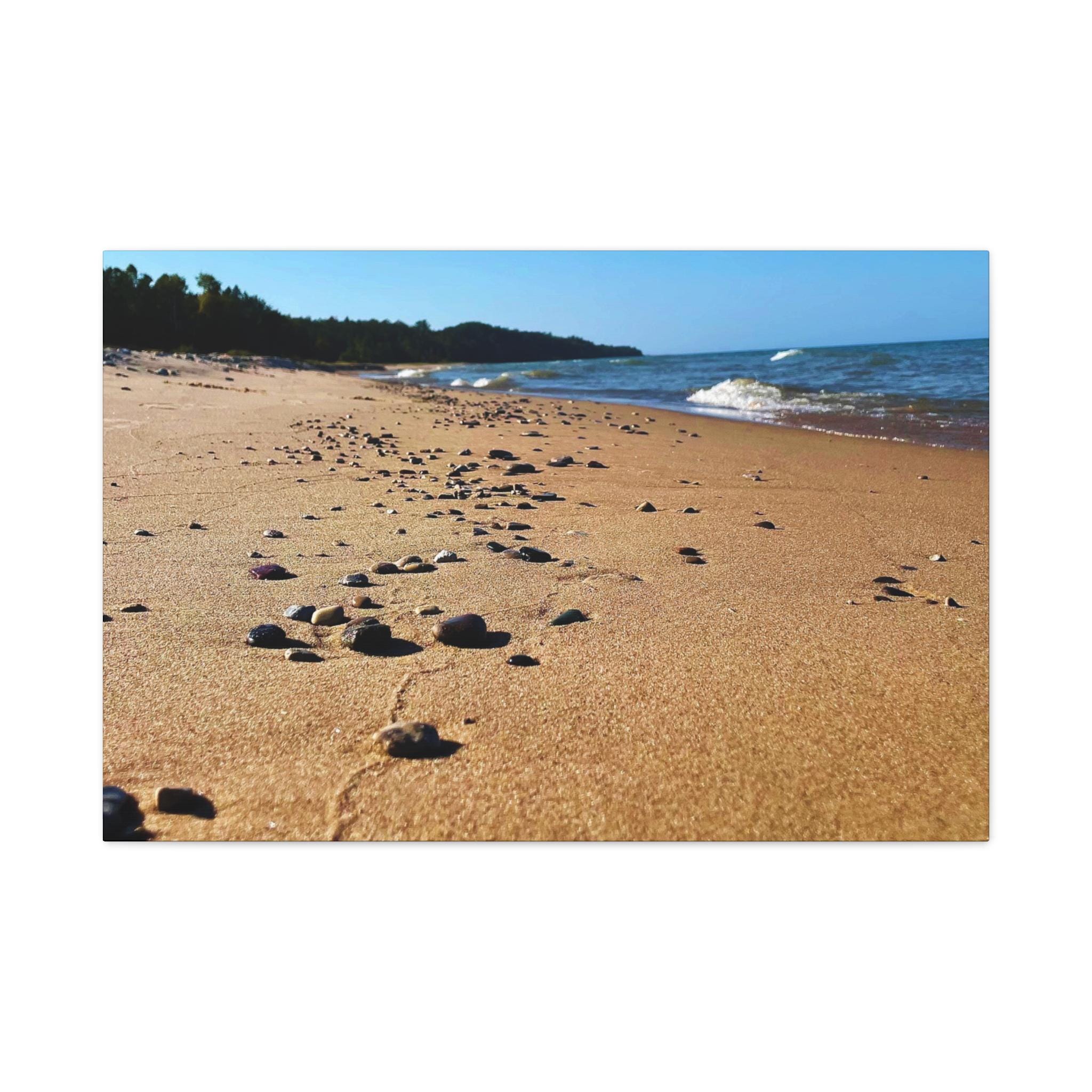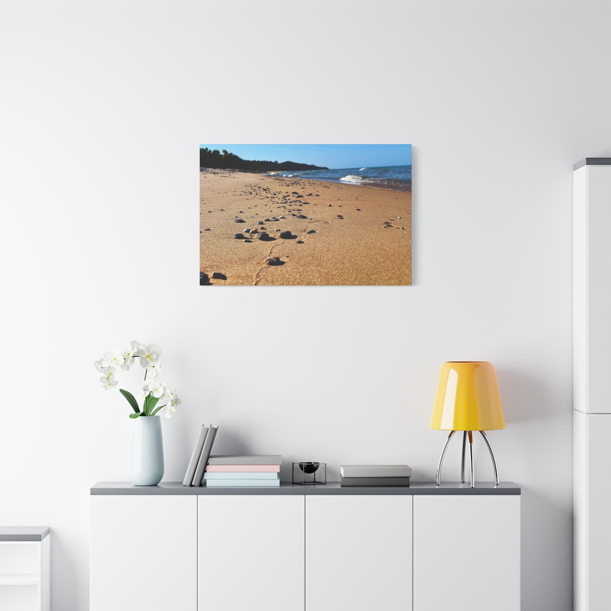 Bring the calming vibes of a sandy beach with rocks and waves into your space with this zen-like canvas print. Perfect for those looking to add a touch of tranquility to their home or office. Ideal for nature lovers, beach enthusiasts, and those seeking a peaceful atmosphere. Great for decorating homes, offices, beach houses, and meditation spaces. Perfect for coastal decor, summer holidays, and relaxation spaces.