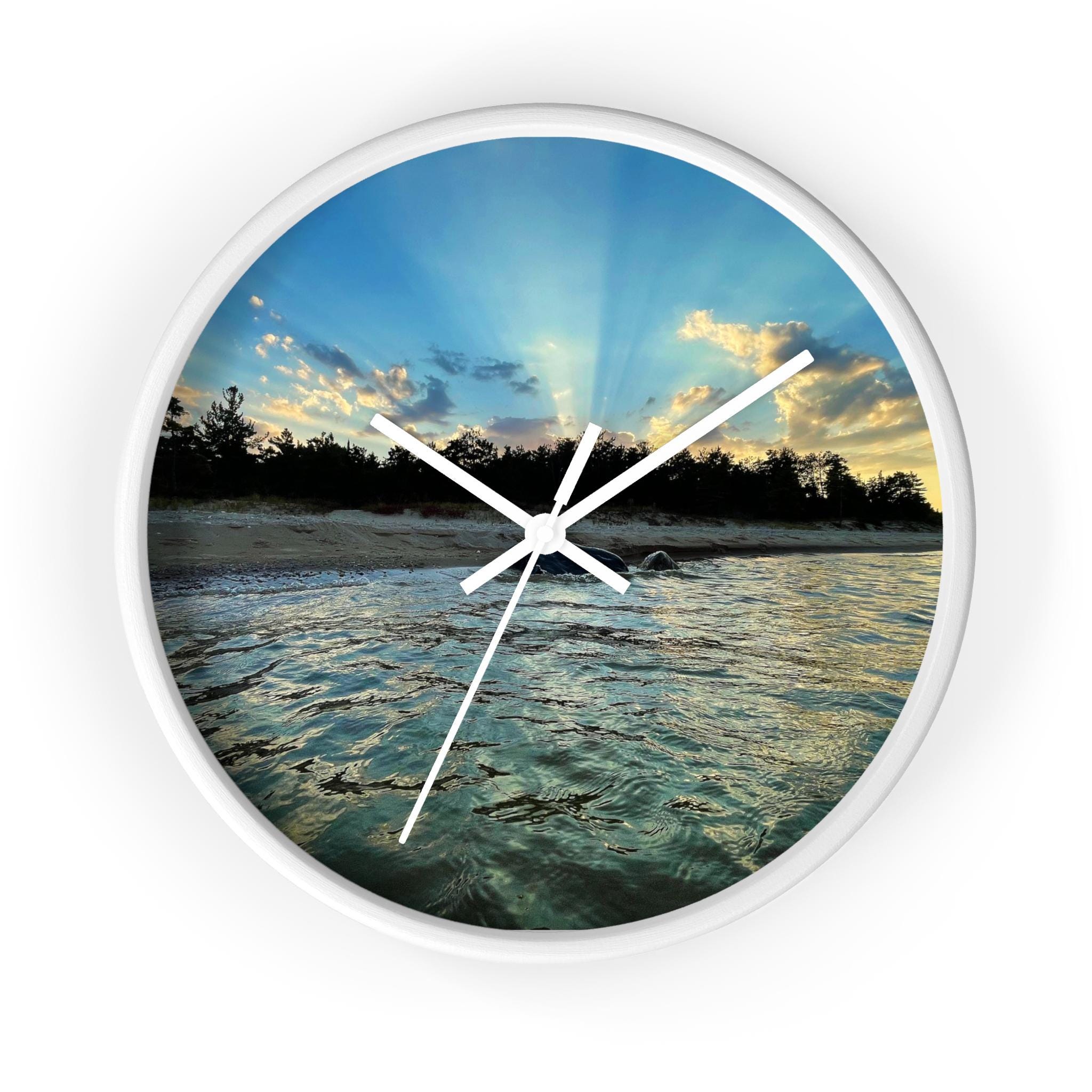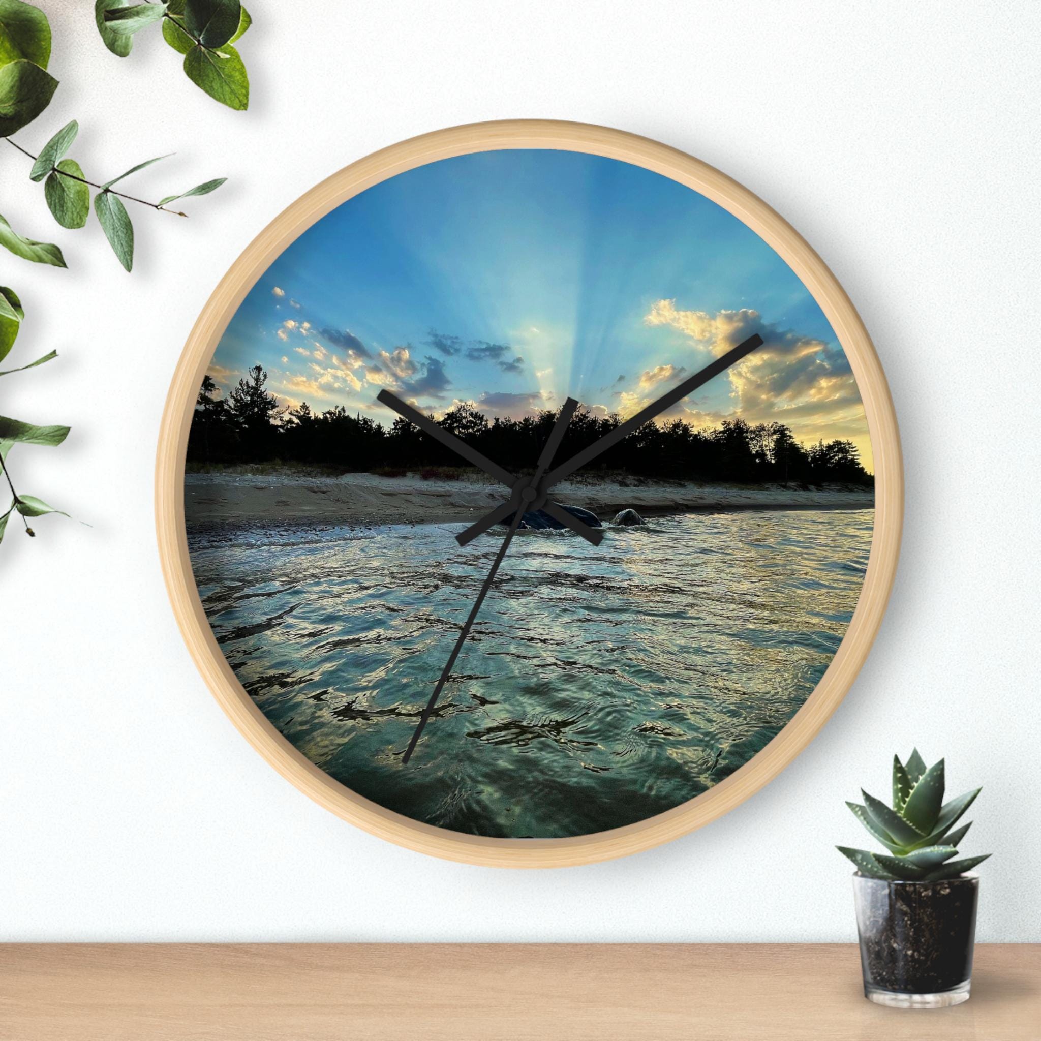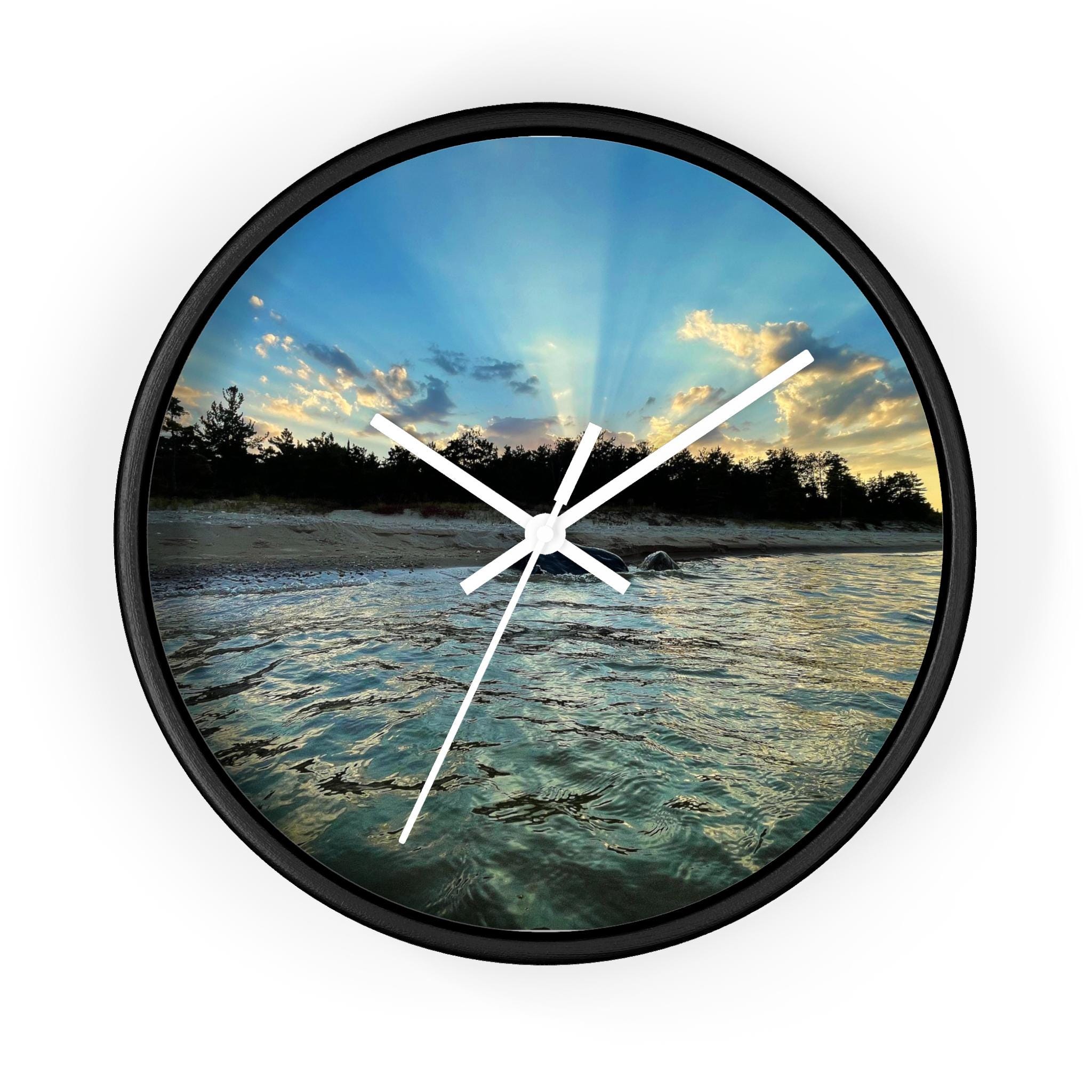 Bring calm, coastal energy into your space with this moody ocean sunset wall clock. Featuring original coastal photography captured at golden hour, this piece blends soft movement, light, and shoreline textures into a functional work of art.
