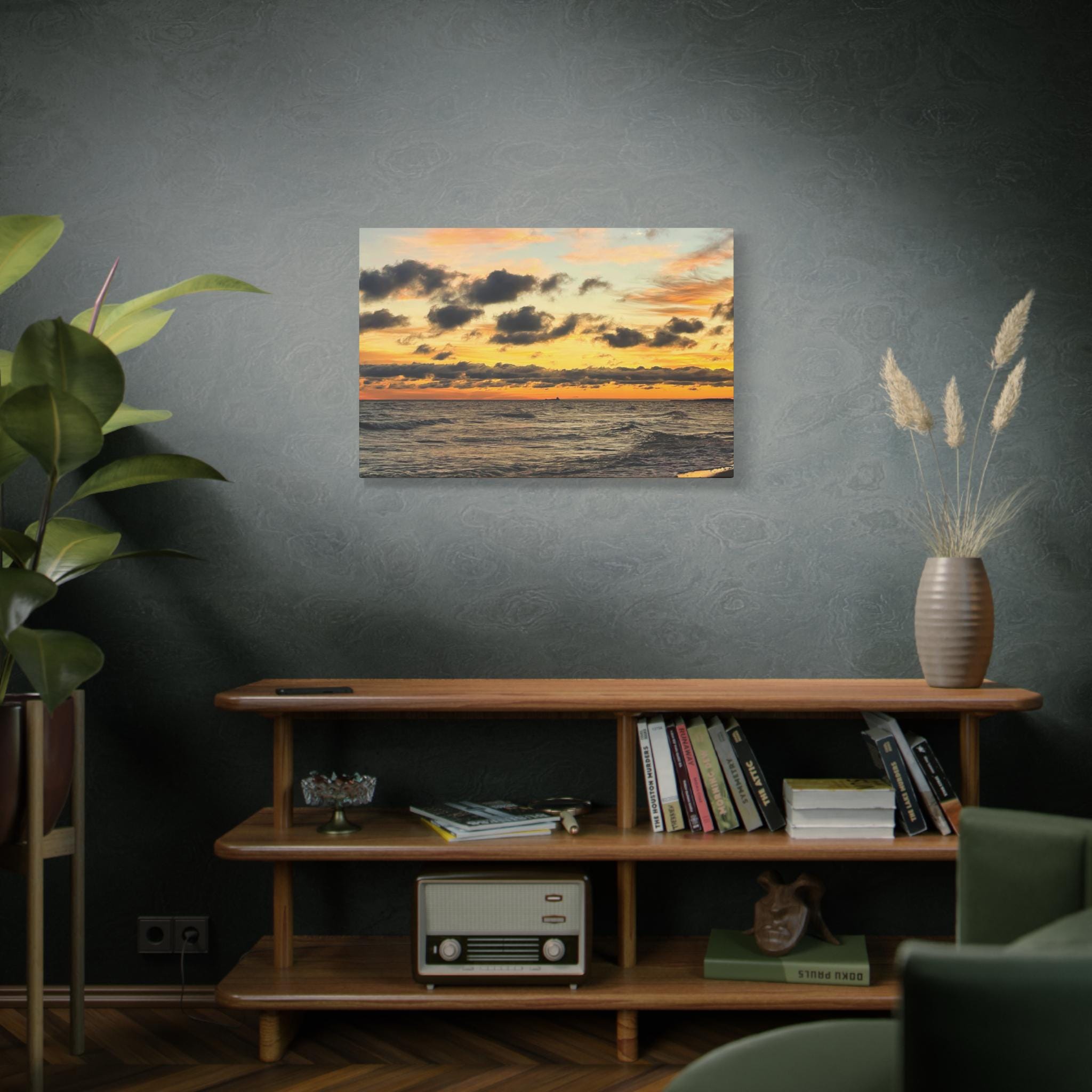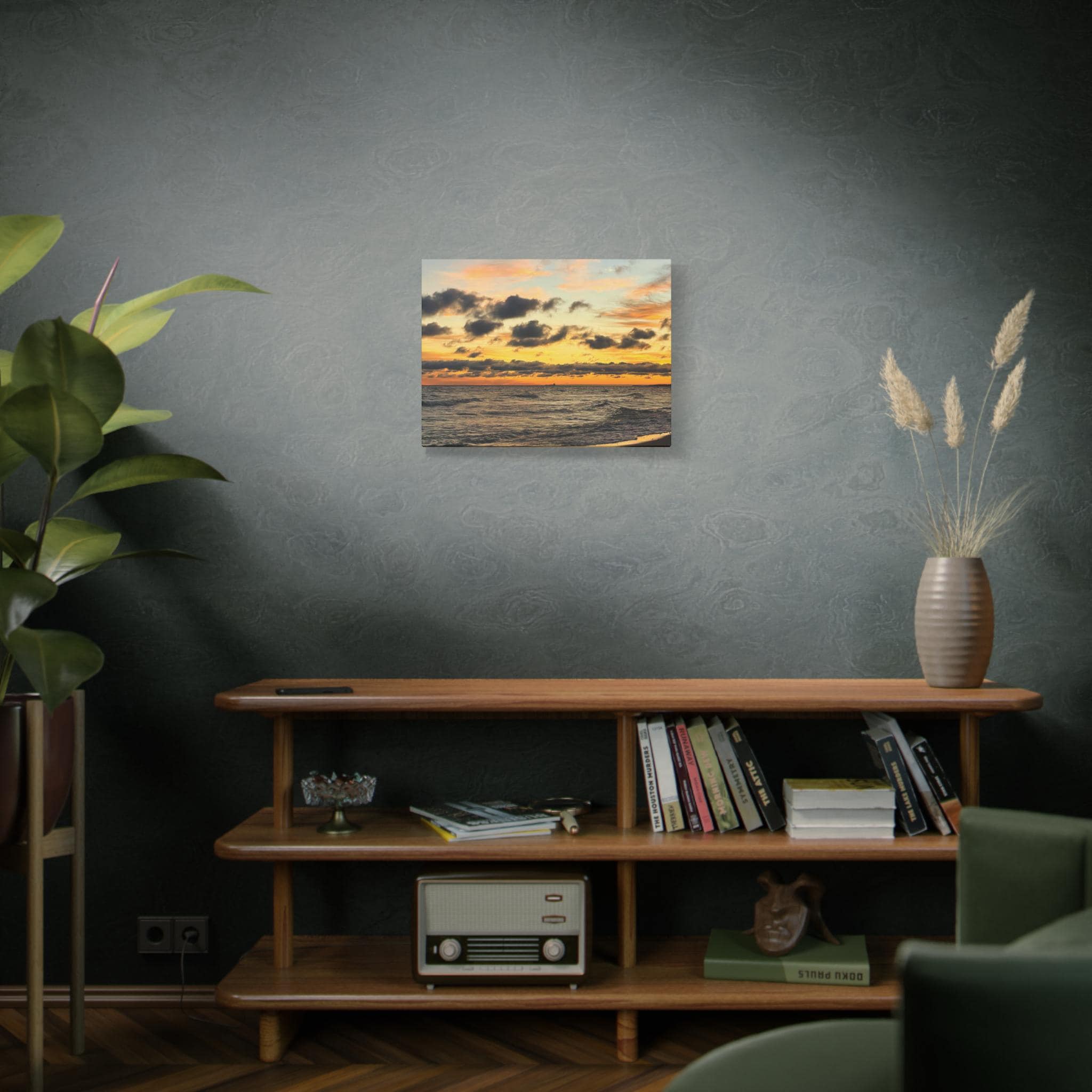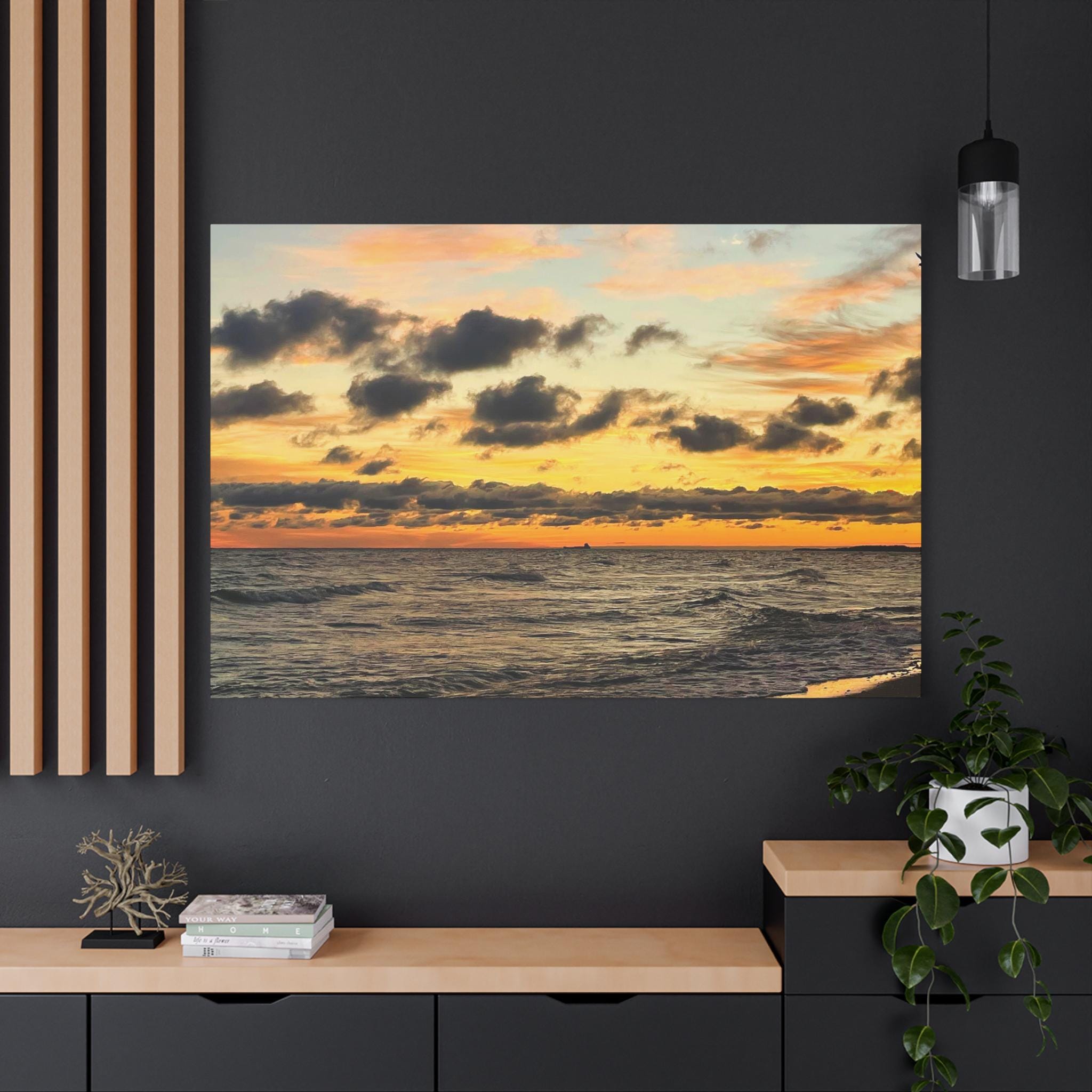 Add depth, mood, and quiet drama to your space with this ocean sunset canvas wall art. Featuring original coastal photography captured as golden light fades across the water and clouds drift overhead, this piece brings movement and atmosphere into a modern interior.