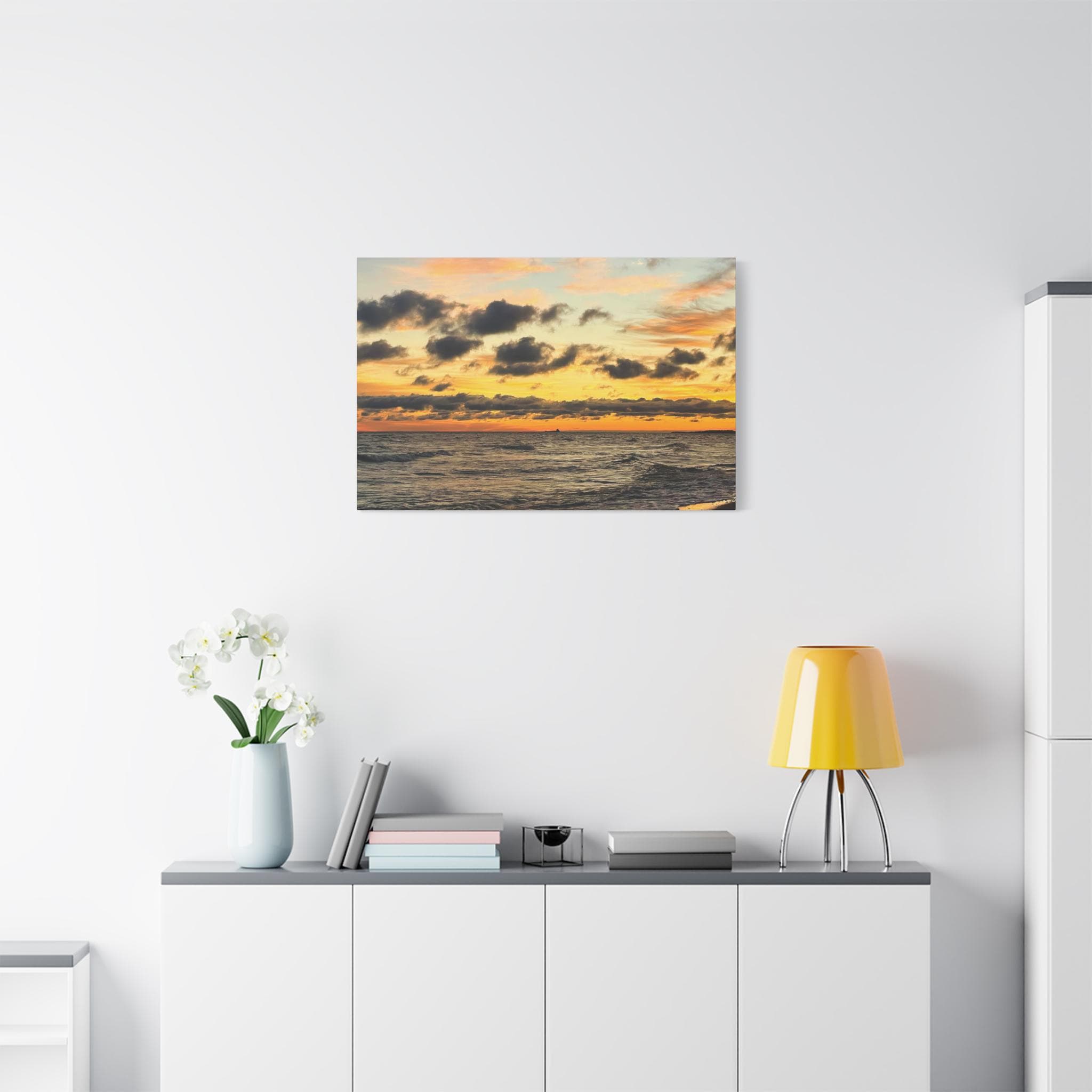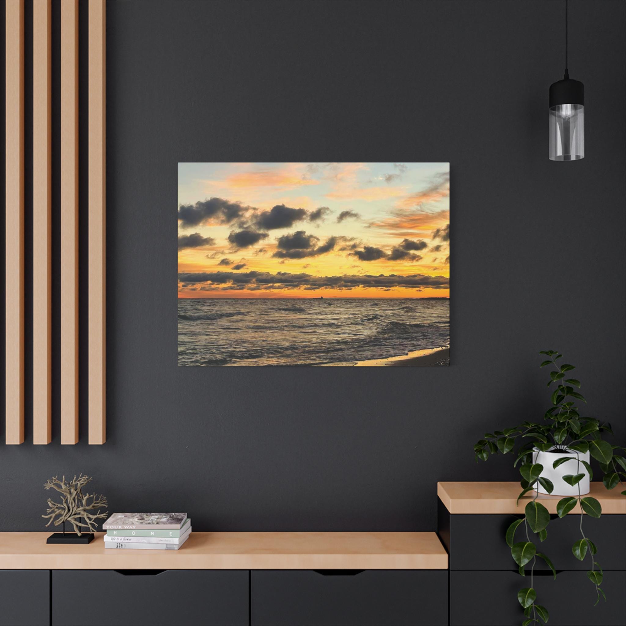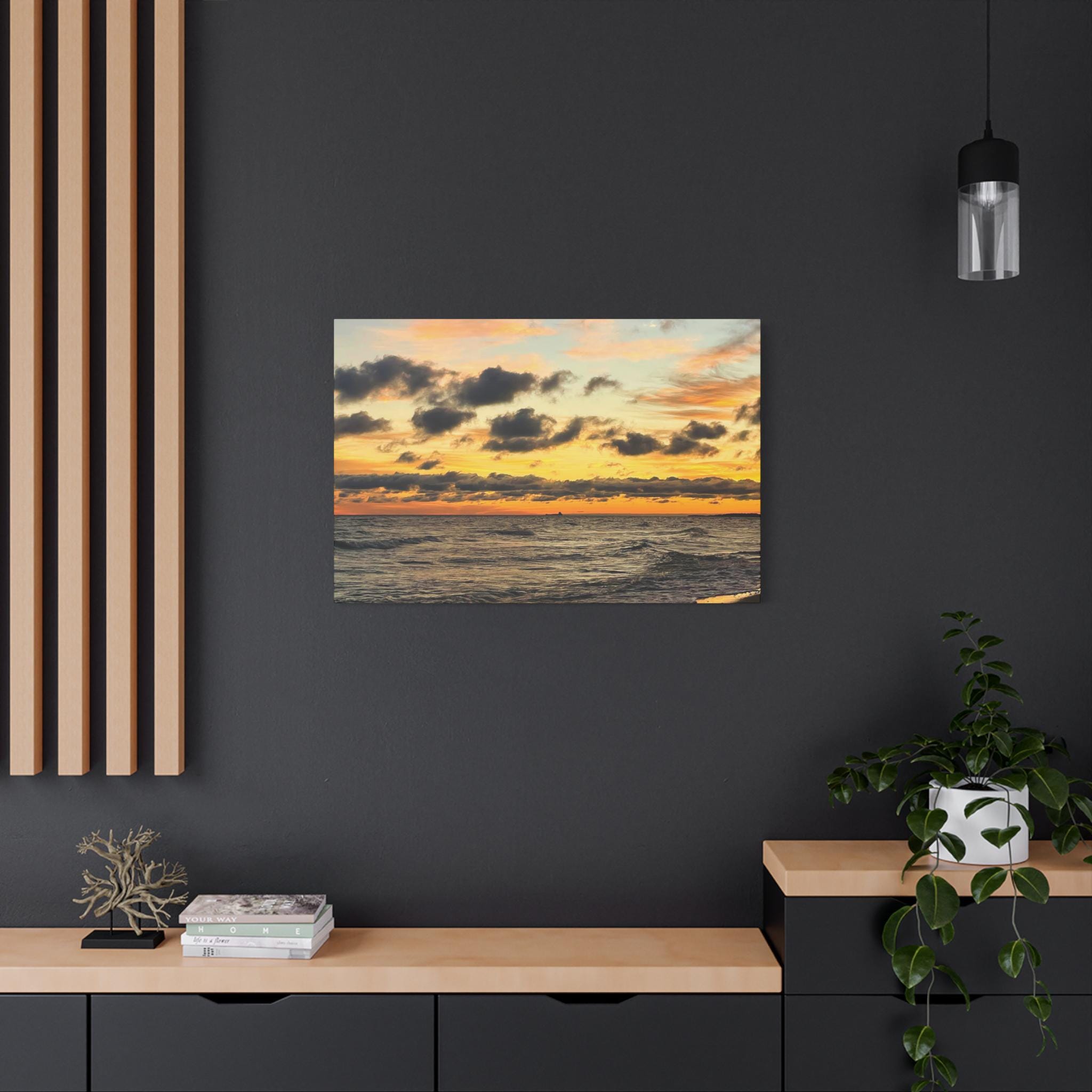 Printed on high-quality canvas and stretched for a clean, frameless presentation, this artwork feels bold yet calming. Rich sunset tones and textured cloud detail create a striking focal point while still blending effortlessly into modern coastal, neutral, and contemporary spaces.