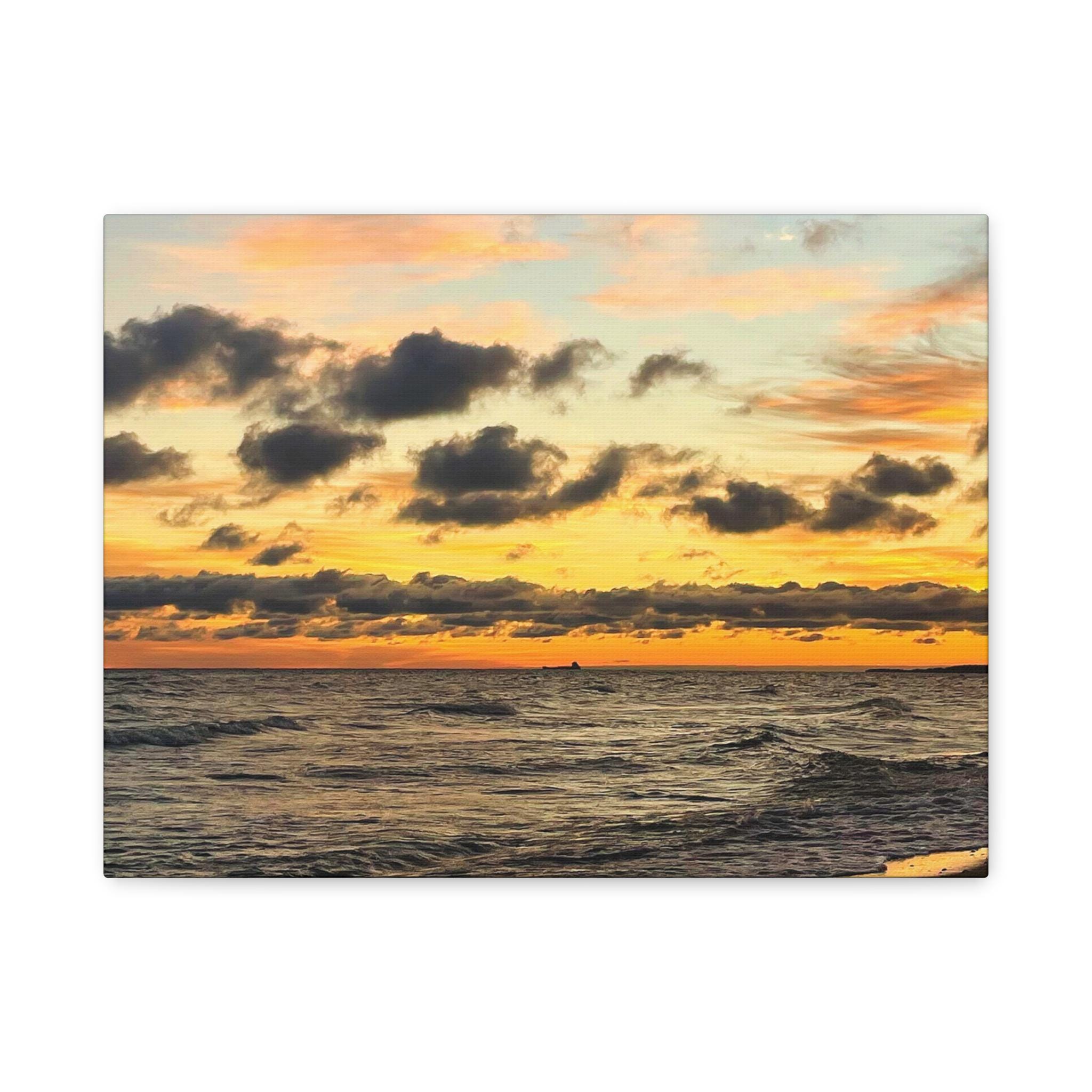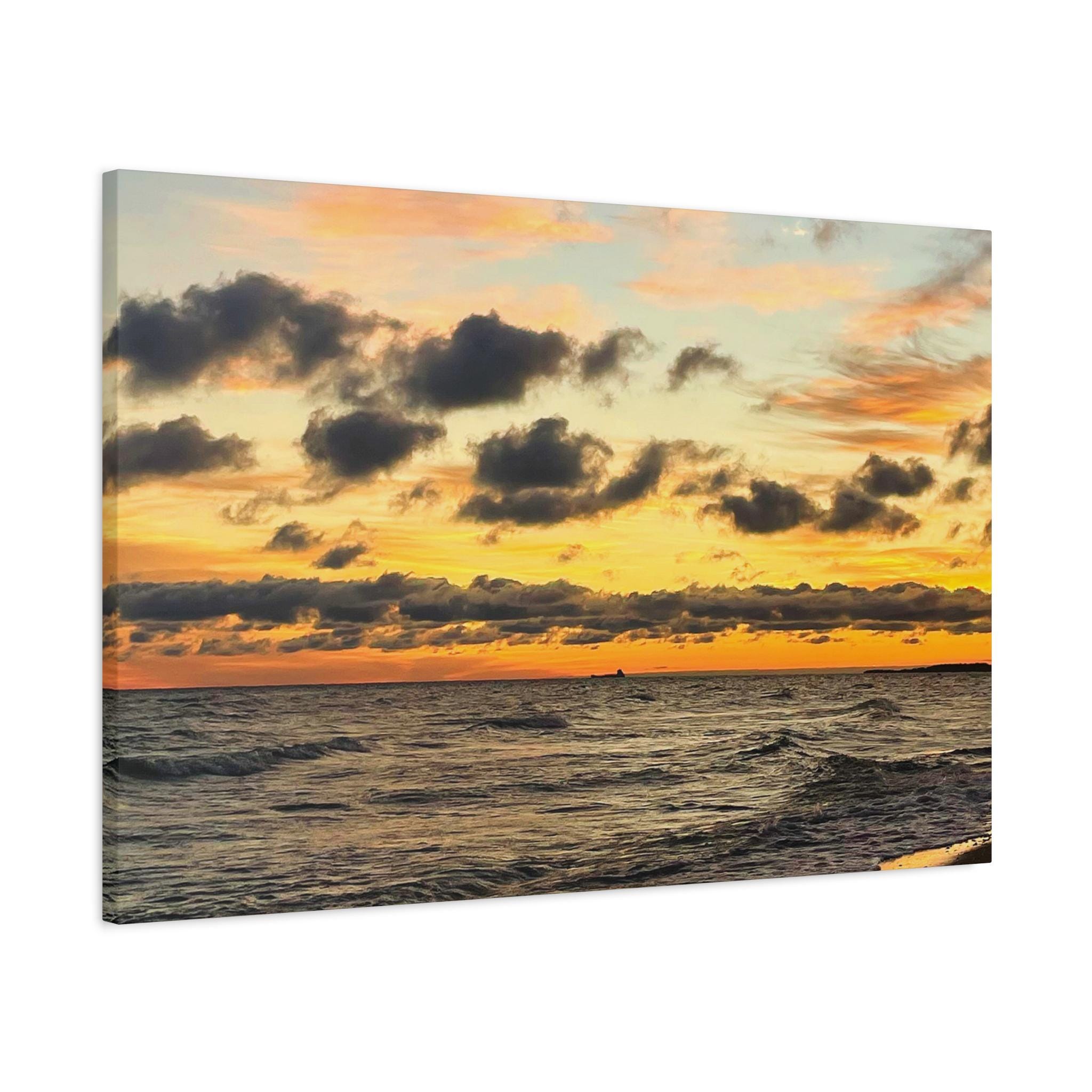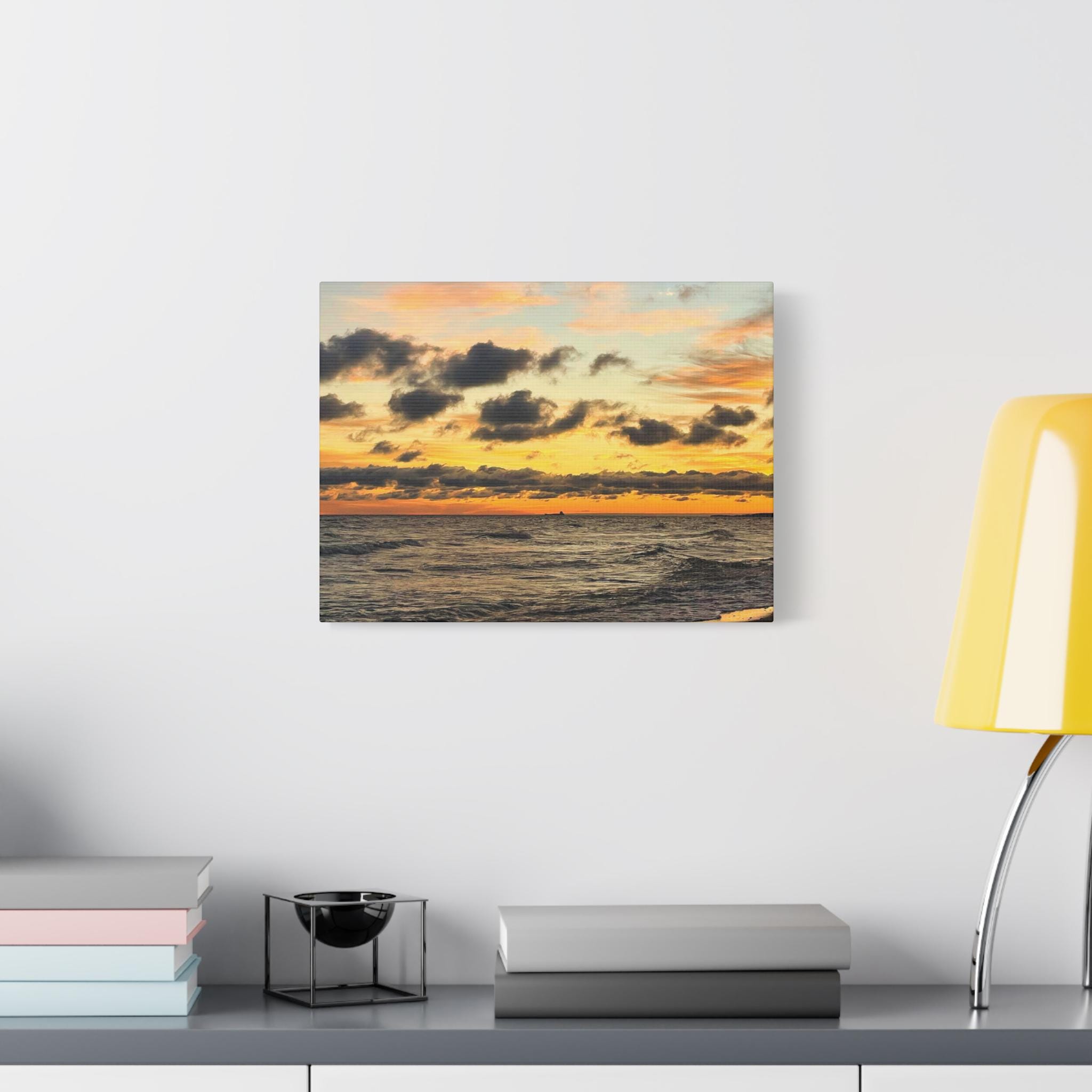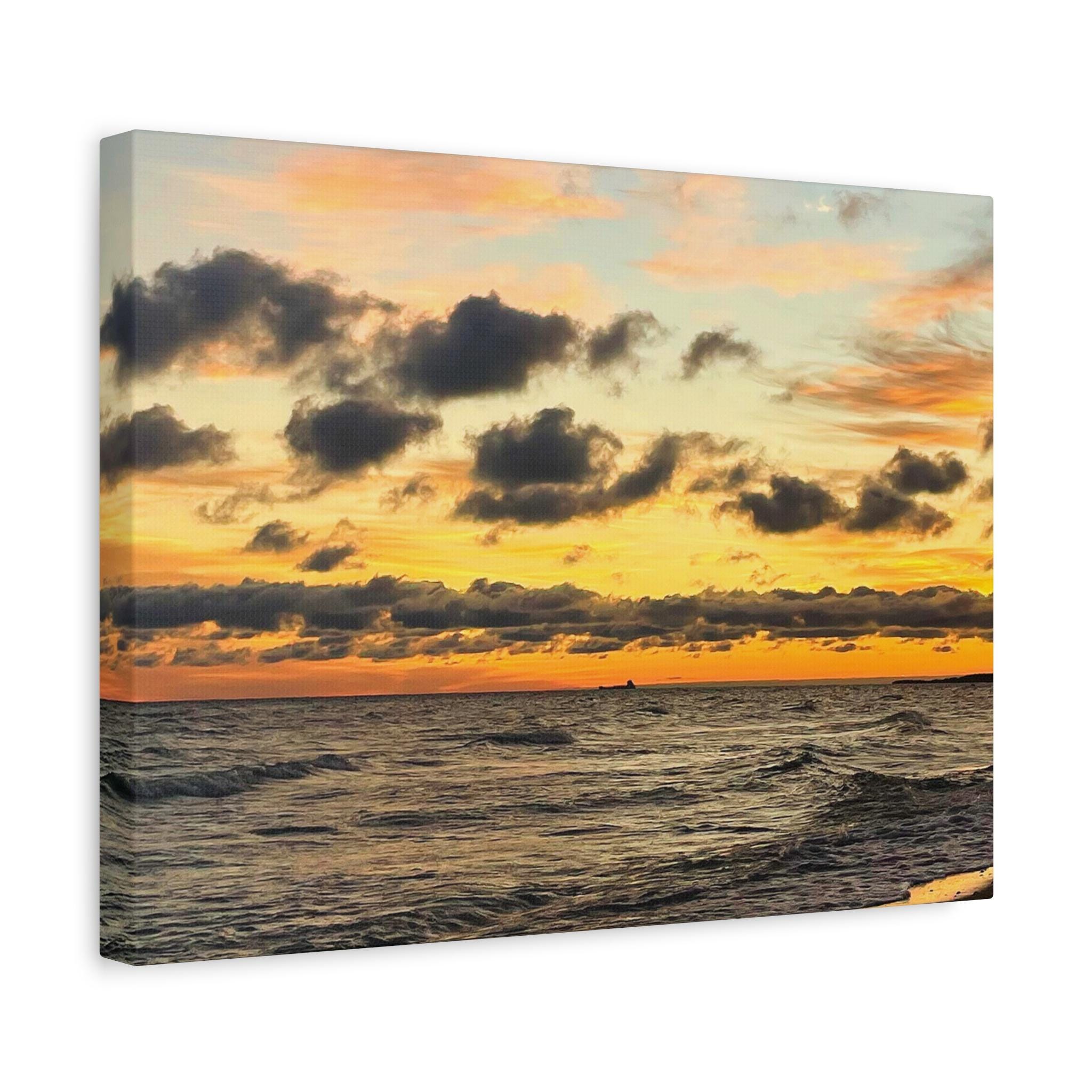 Printed on high-quality canvas and stretched for a clean, frameless presentation, this artwork feels bold yet calming. Rich sunset tones and textured cloud detail create a striking focal point while still blending effortlessly into modern coastal, neutral, and contemporary spaces.